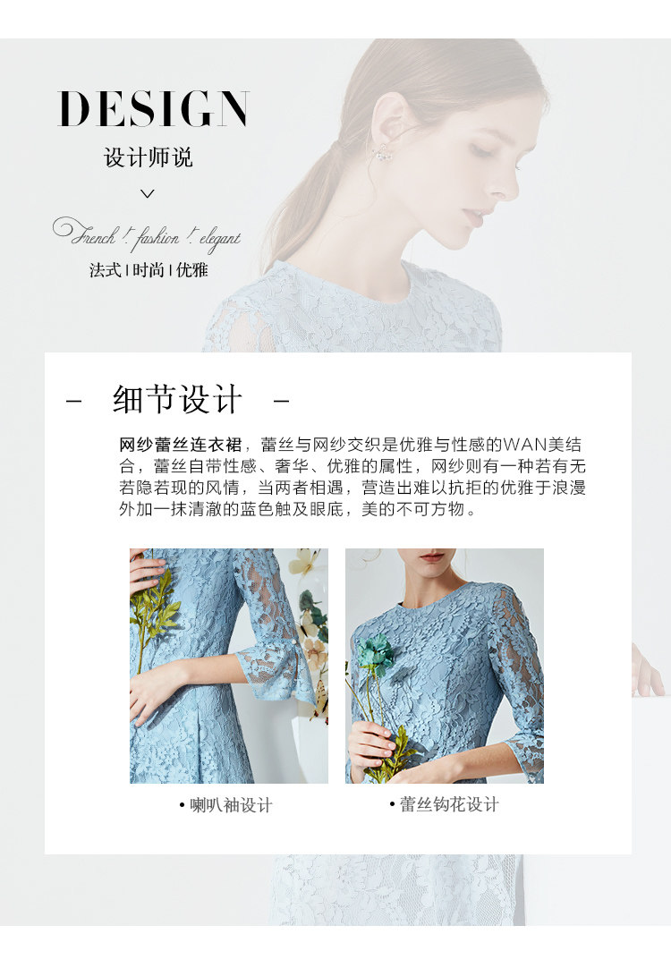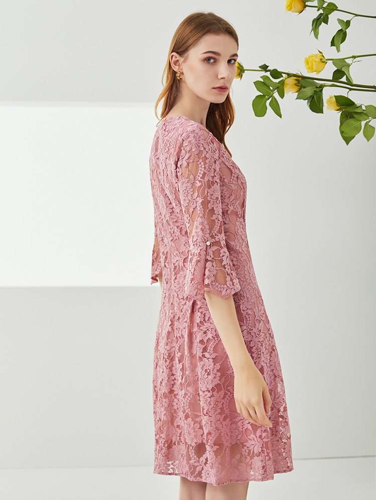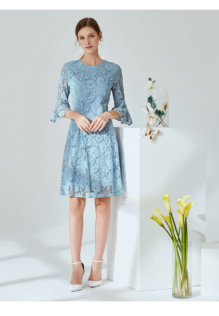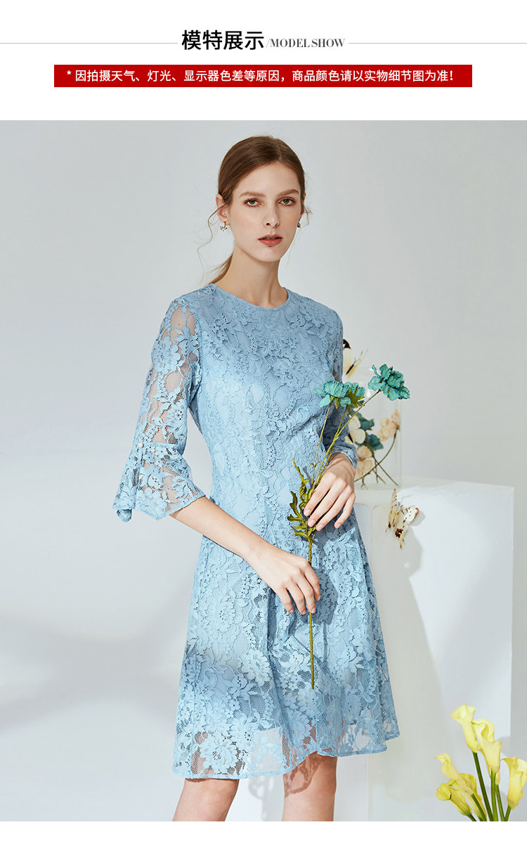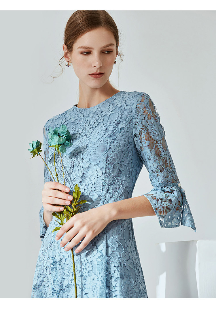 EITIE爱特爱新款优雅气质镂空蕾丝收腰A字喇叭袖连衣裙女A2007411