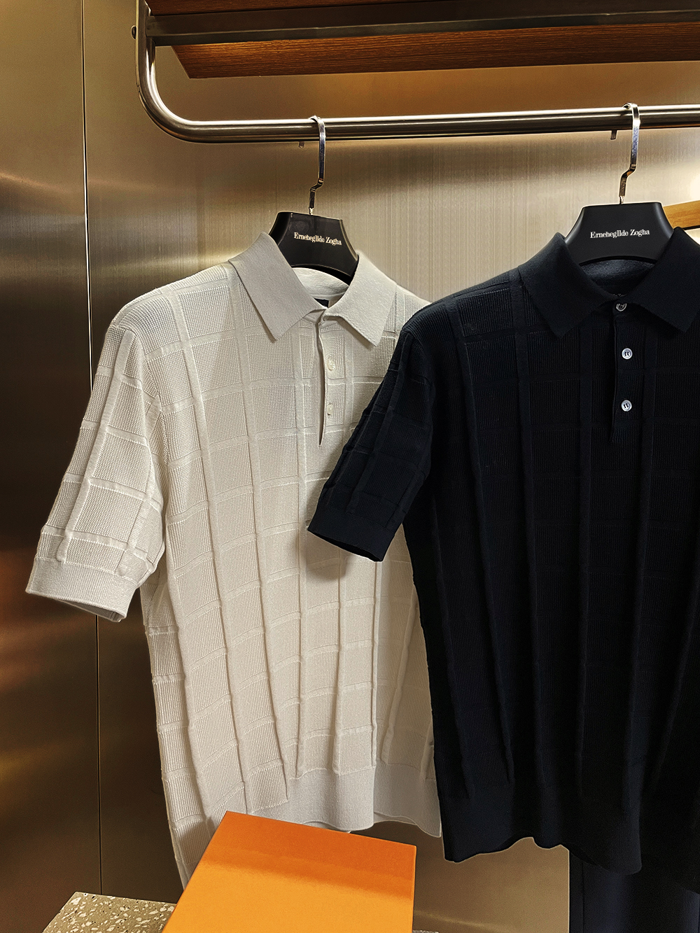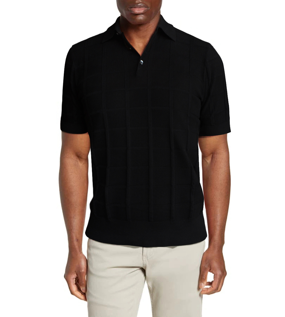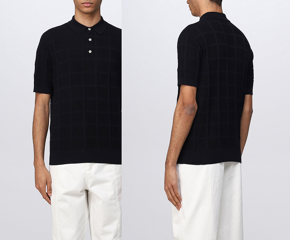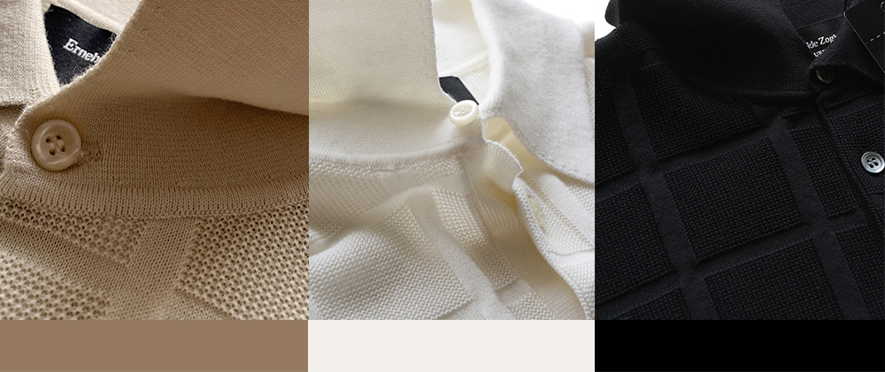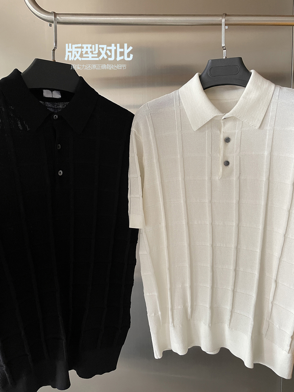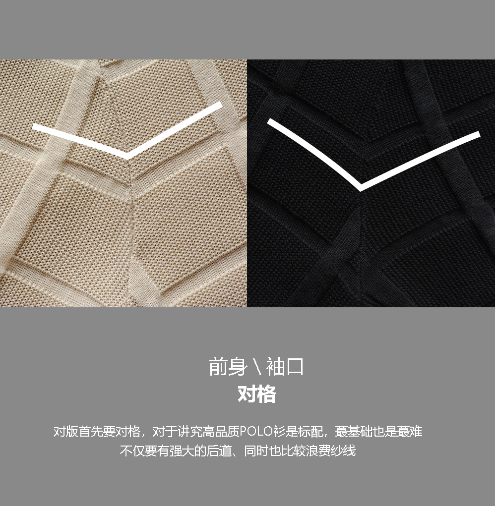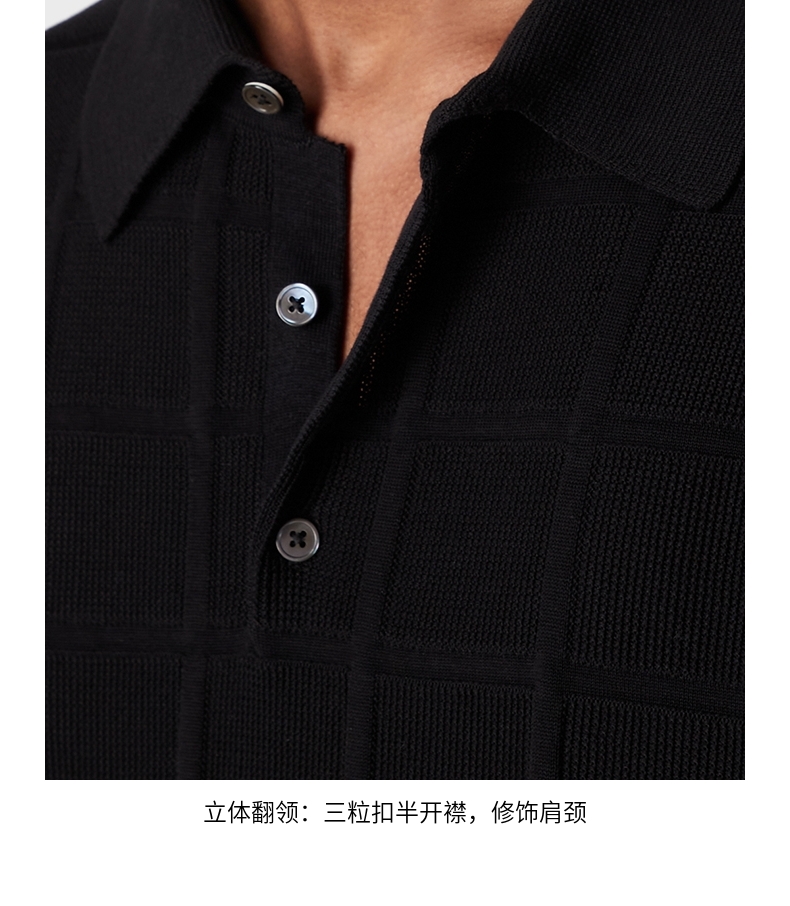 半开襟Polo版型,袖口、下摆与领口处的细致罗纹,