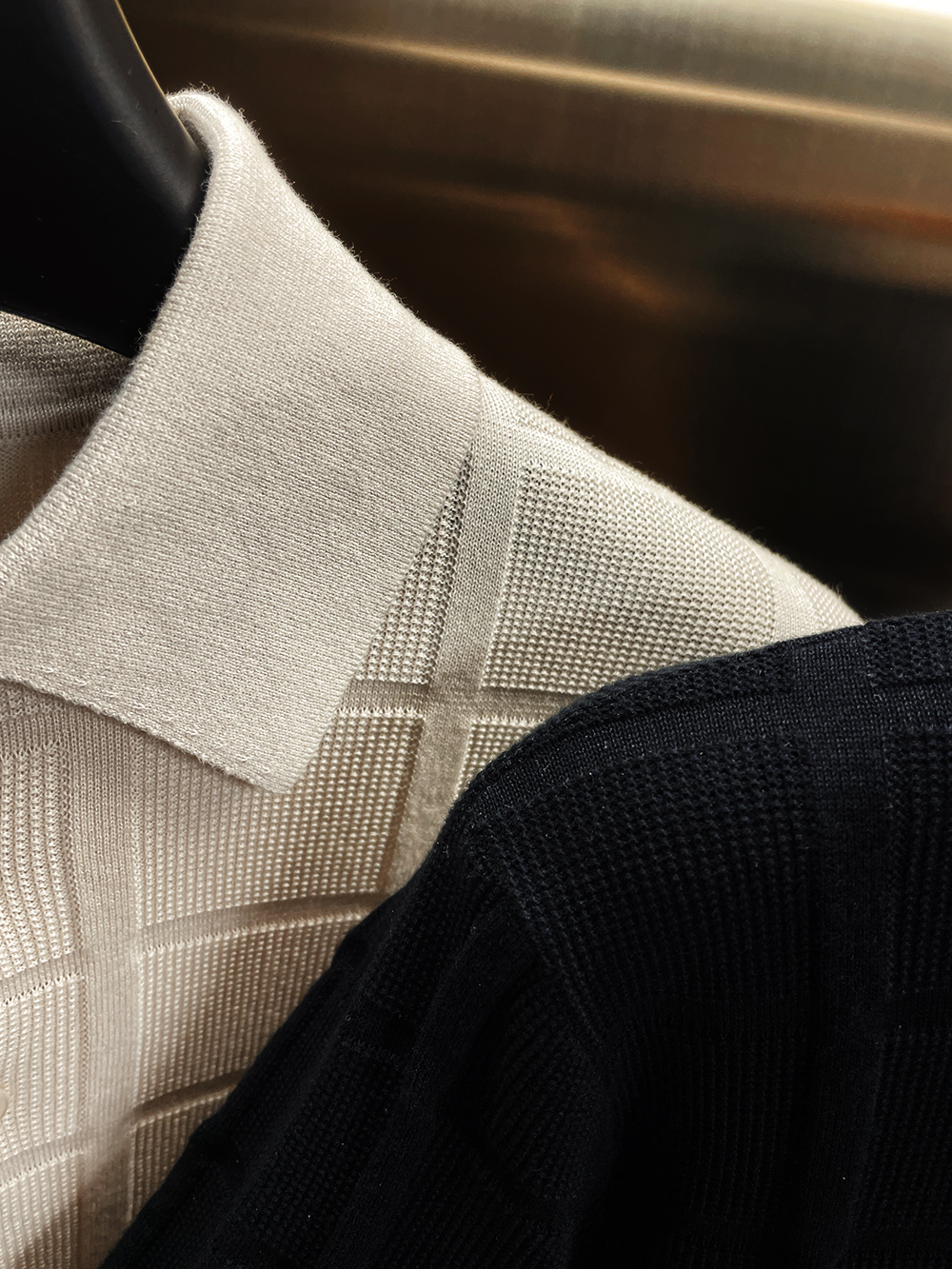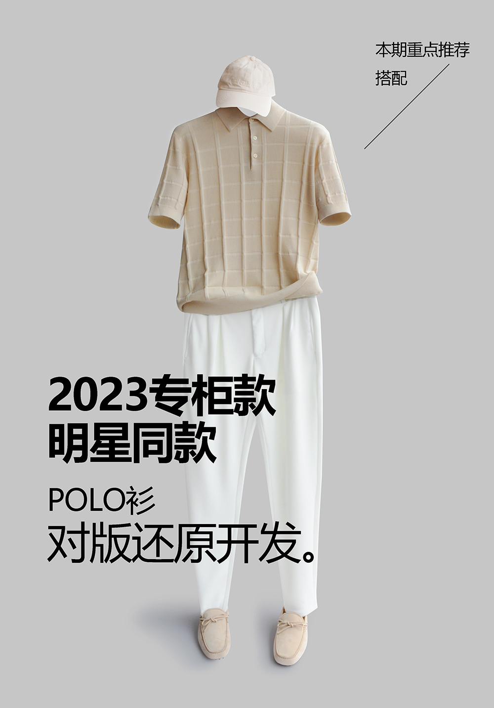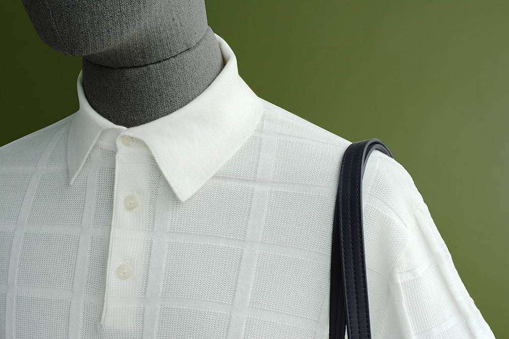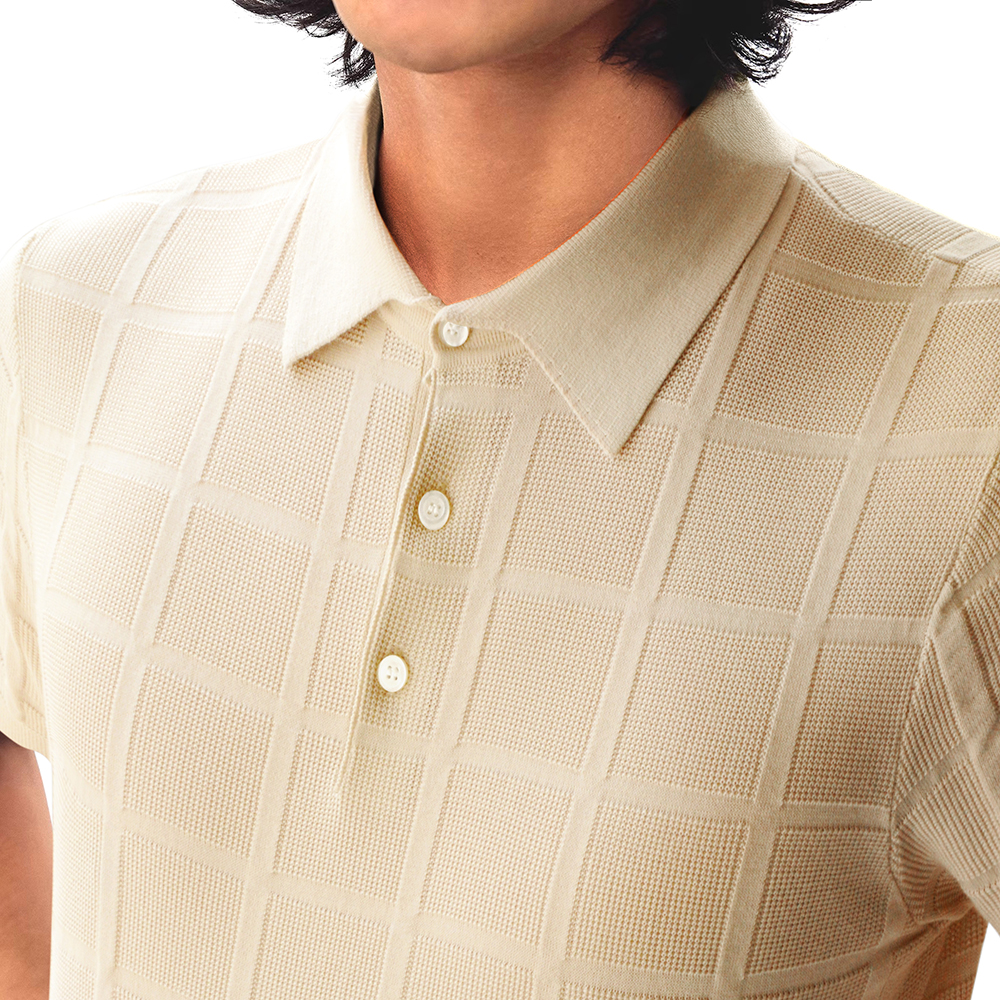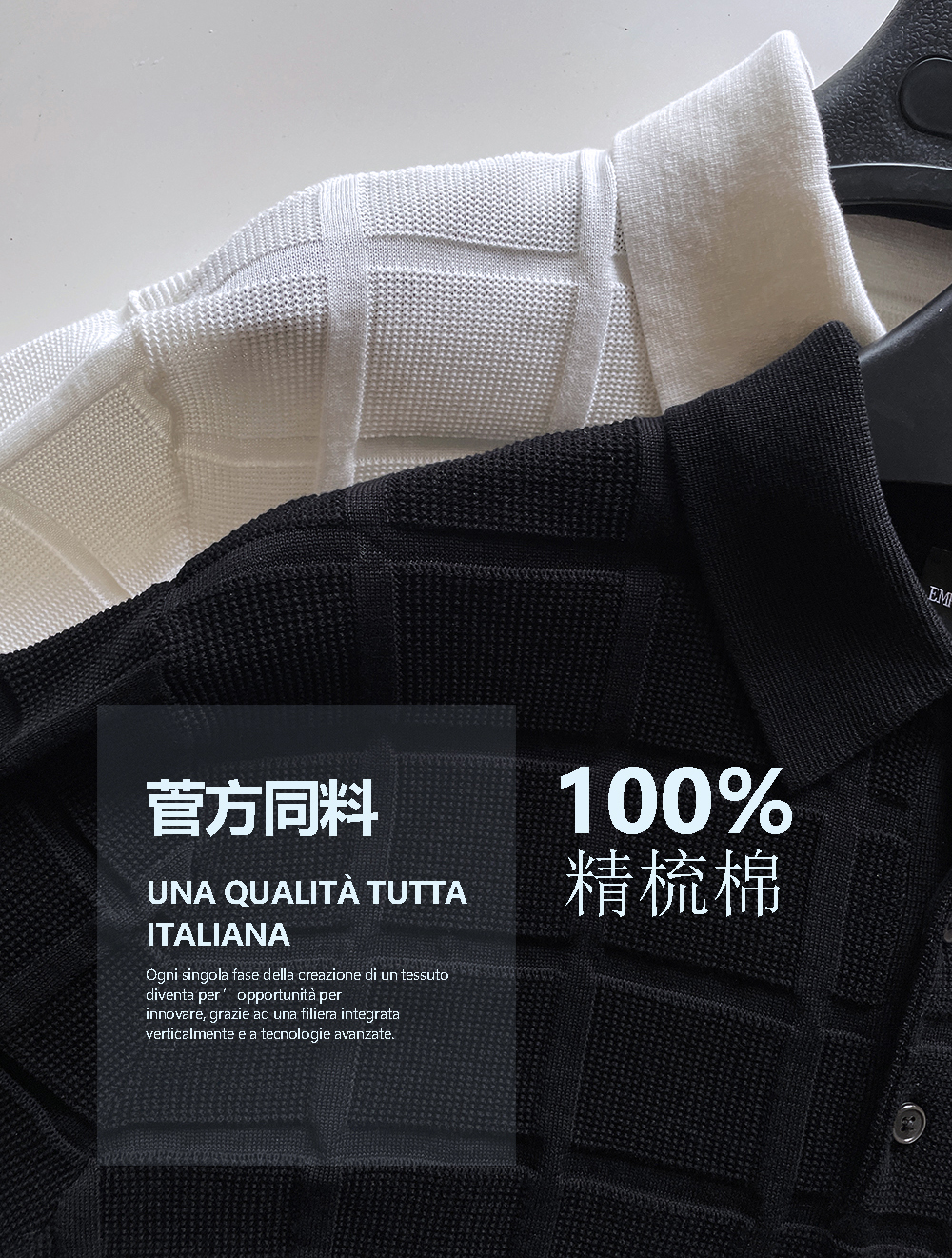 半开襟Polo版型,袖口、下摆与领口处的细致罗纹,