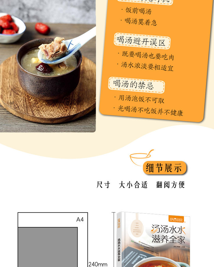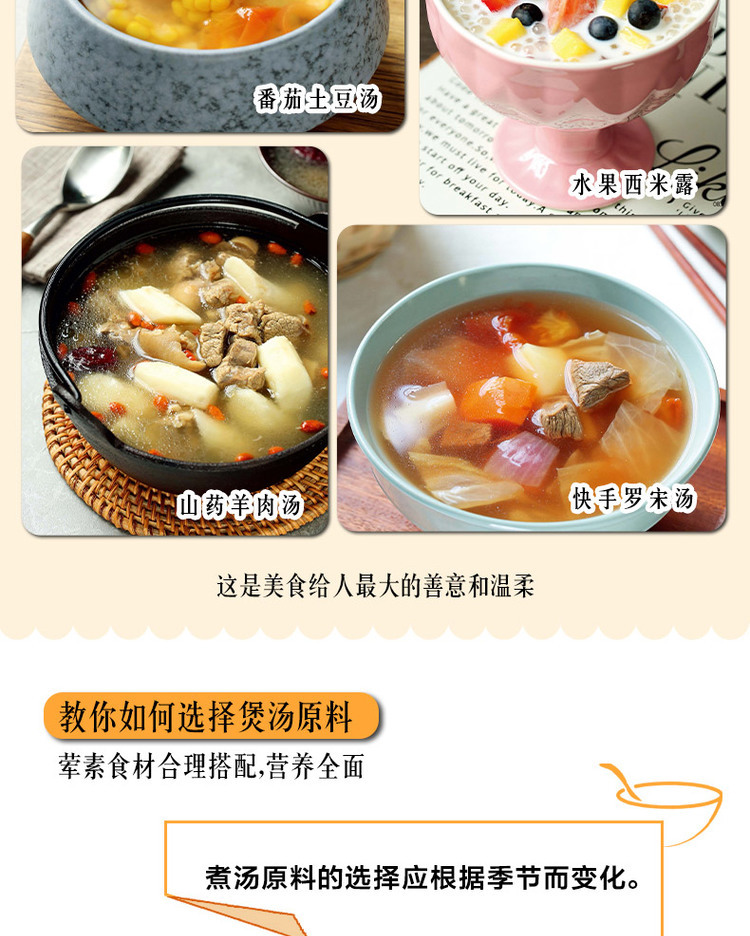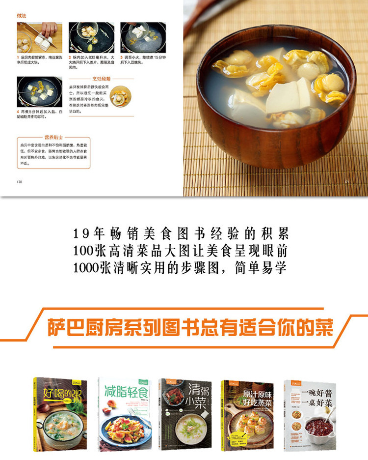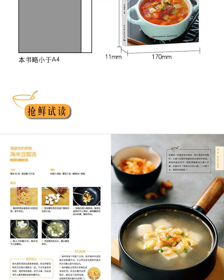 繁琐的烹饪过程让很多人对下厨望而却步,如果你也曾有这样的顾虑,不妨试着从煮汤开始吧。 把各种食材洗一洗、切一切、煮一煮,就成了餐桌上令人垂涎的美味。没有什么是比煮汤更易掌握的了,即使是从未下过厨的新手,也能从这本书中轻松学会各种煮汤技巧,再也不用担心该如何挑选、处理和搭配食材。 快手的清汤、清香的甜汤、醇香的肉汤、鲜美的海鲜汤,想喝什么自己做。即便你是忙碌的上班族,用冰箱里现有的食材也能做出快手佐餐汤。 再辛苦也不能亏待了自己,美味的汤品是忙碌生活中最温暖的存在,简单易做又能让你焕发精神活力。 |