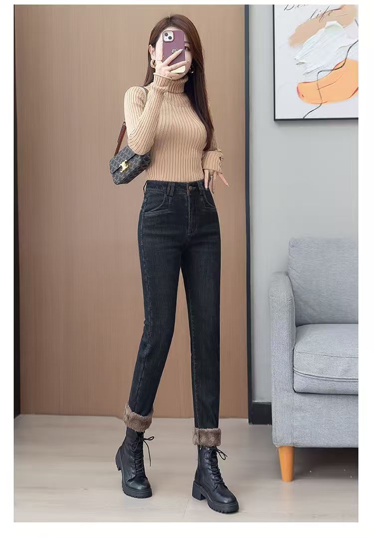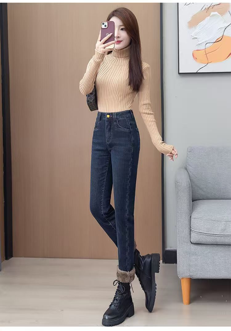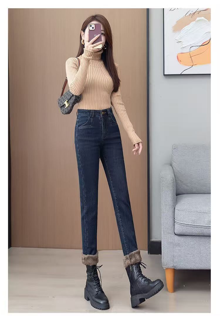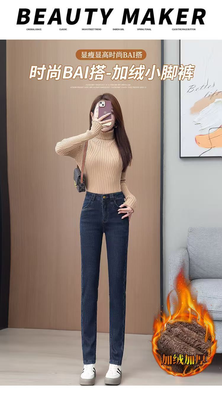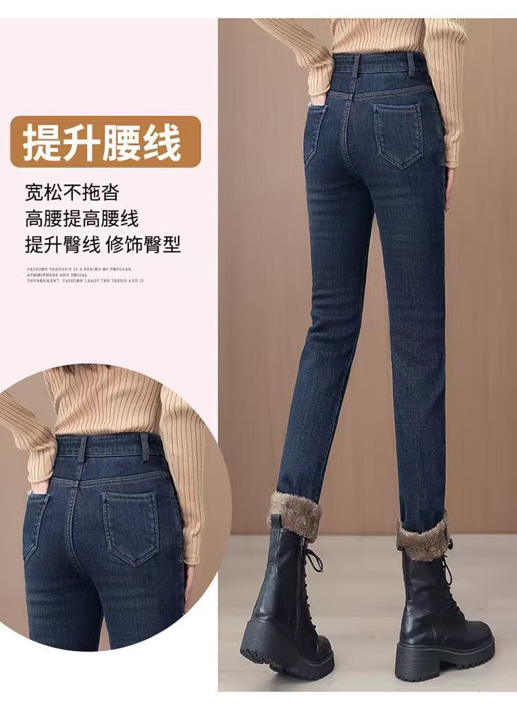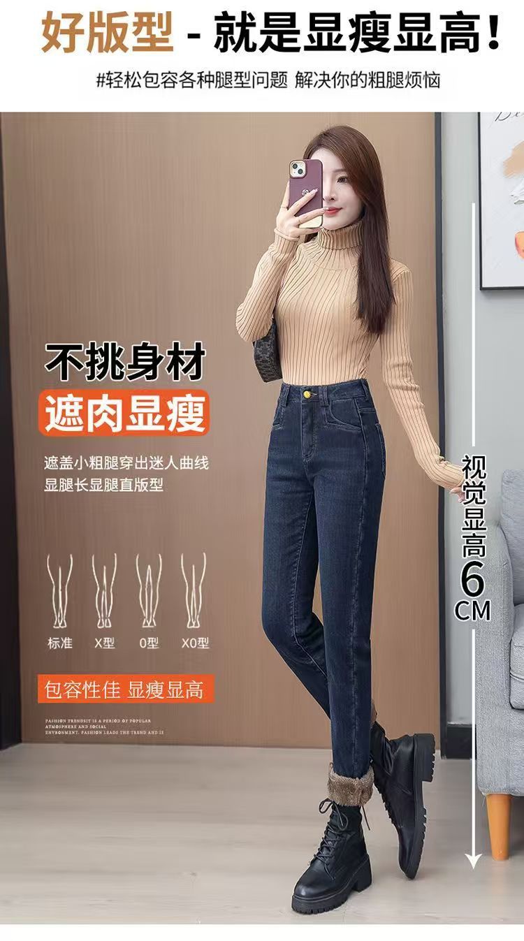百媚生 羊羔绒保暖小脚裤高腰加绒弹力修身牛仔裤5829 商品图0