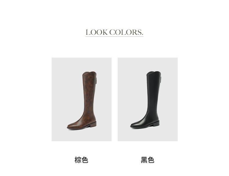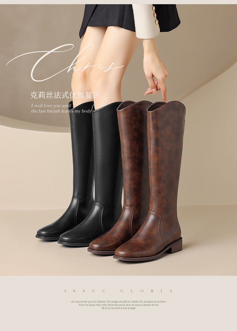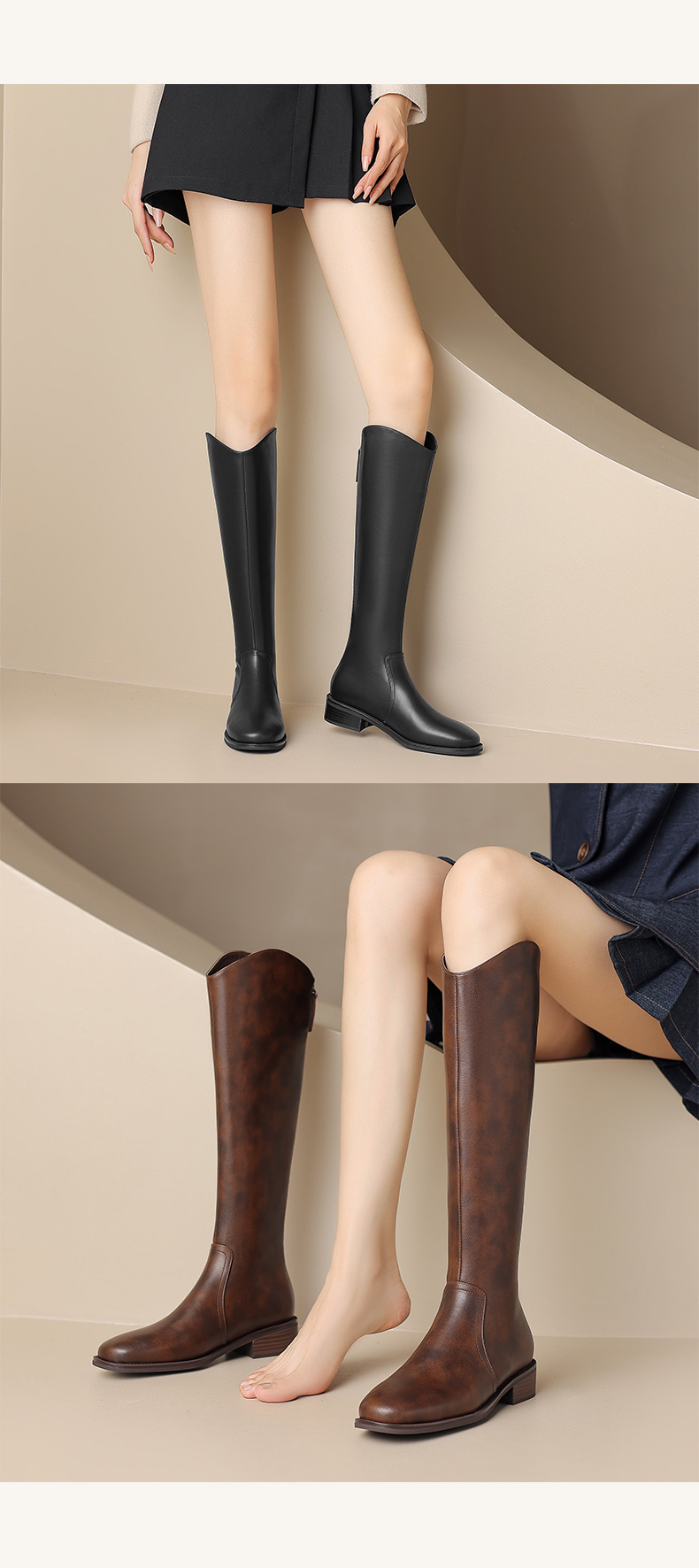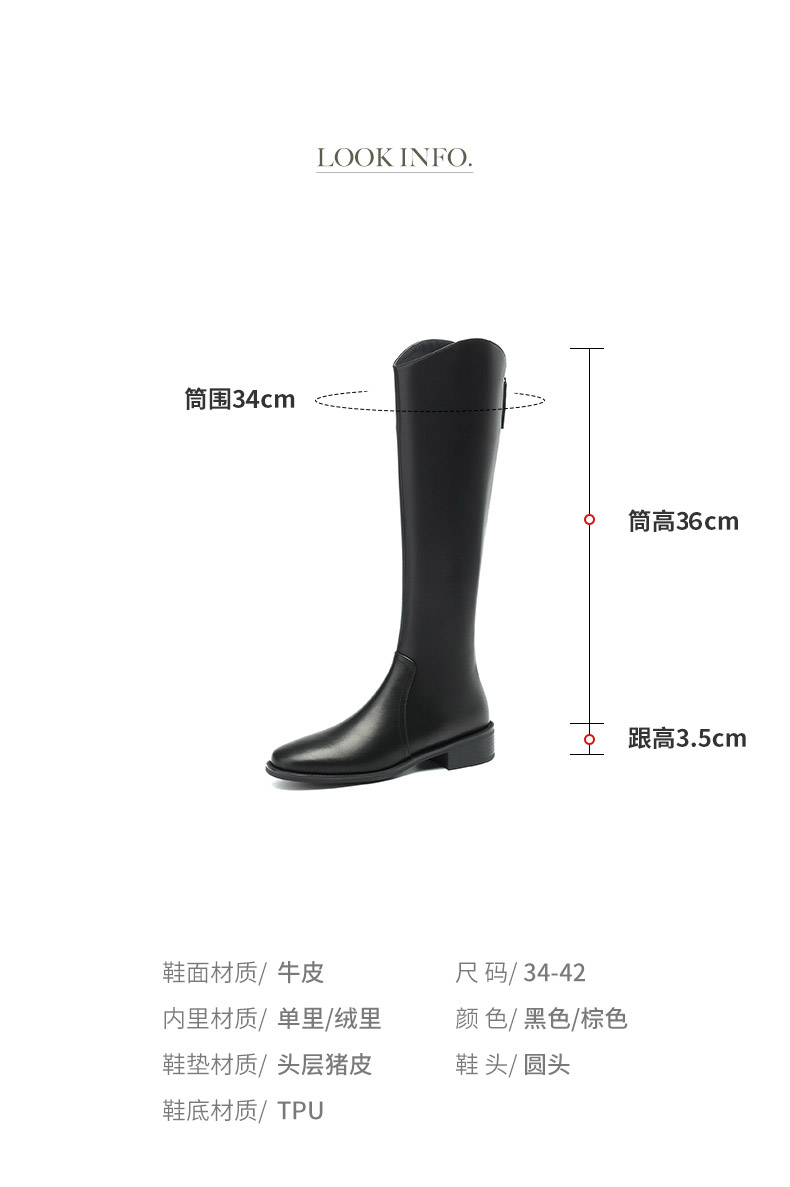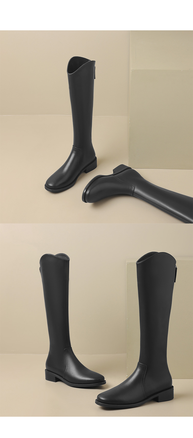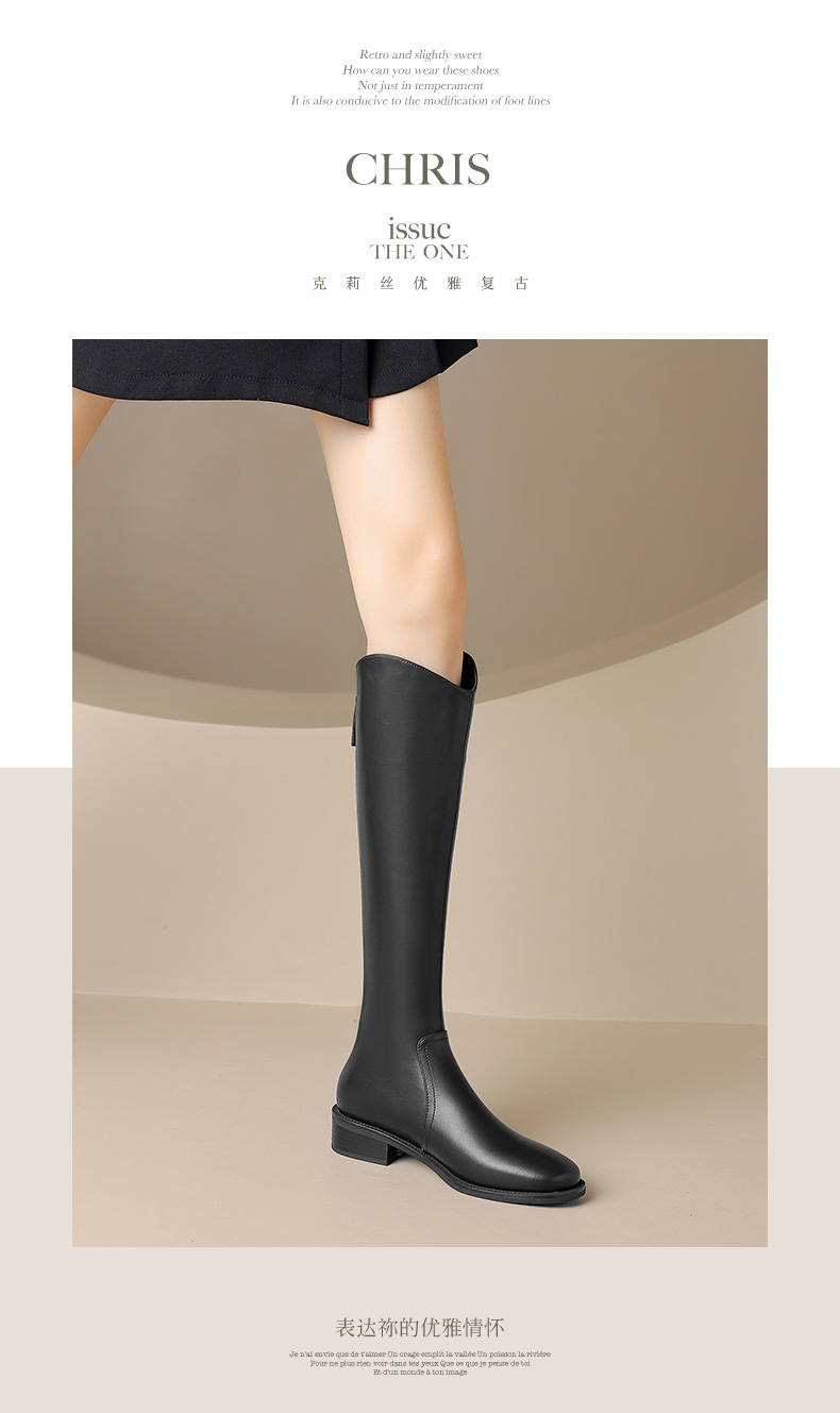 时尚百搭,加绒保暖全真皮高筒靴低跟圆头骑士靴牛皮大小筒长靴YLD-X972
