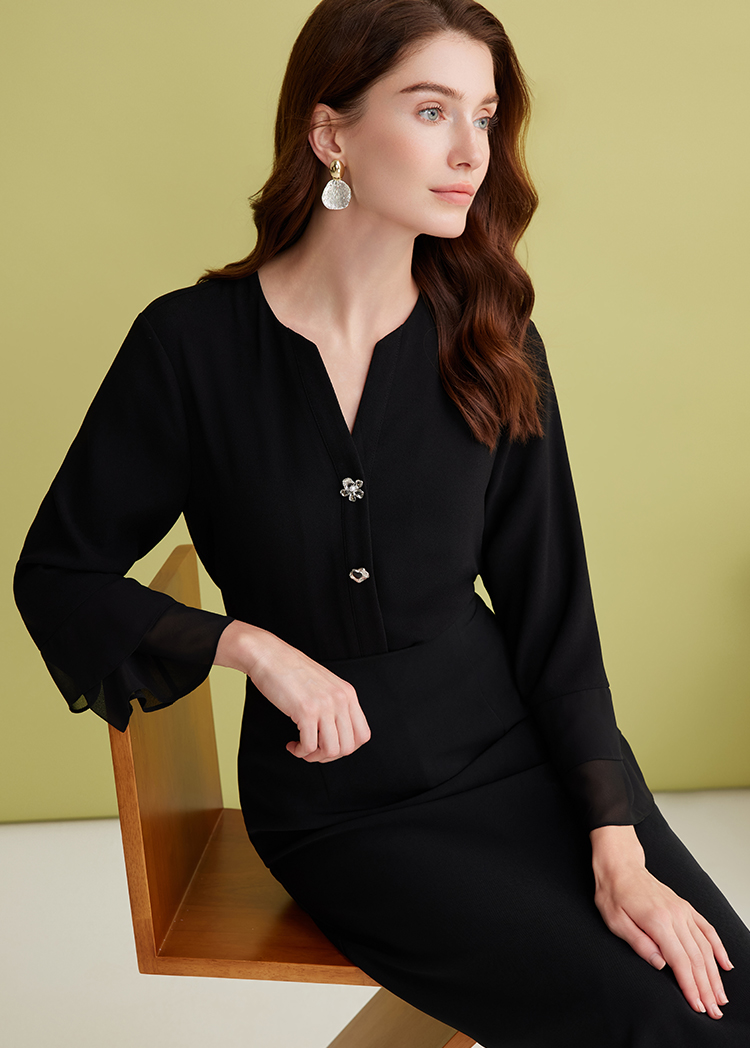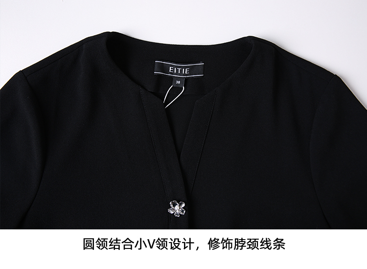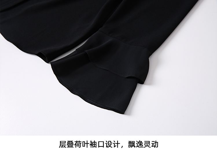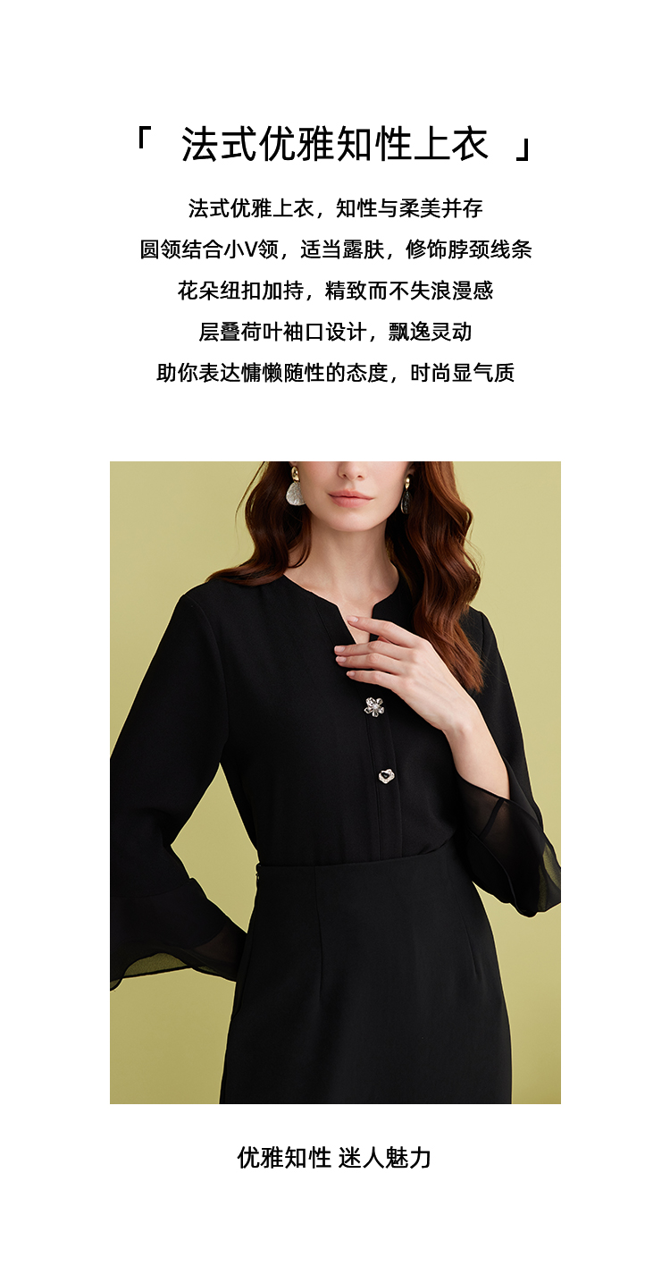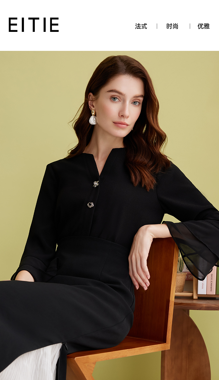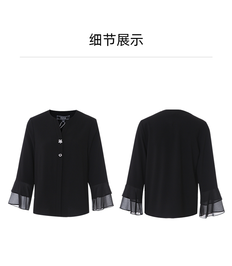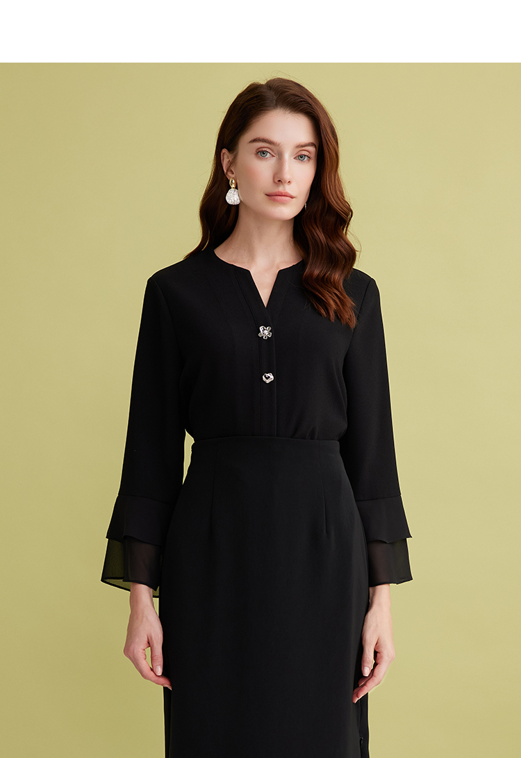 EITIE爱特爱气质V领显瘦设计感喇叭袖黑色衬衫上衣2025春新款A2513521