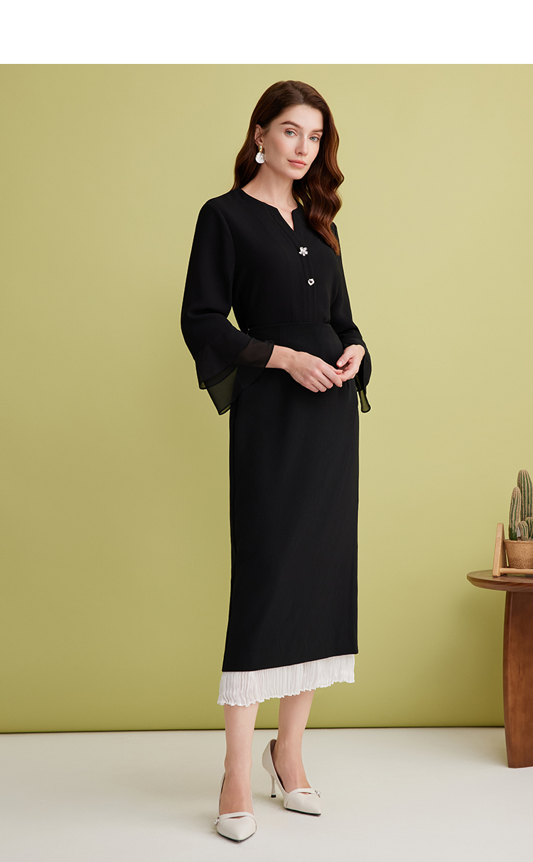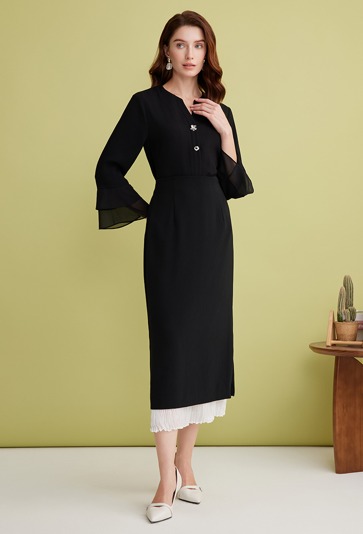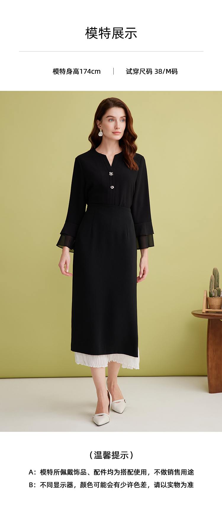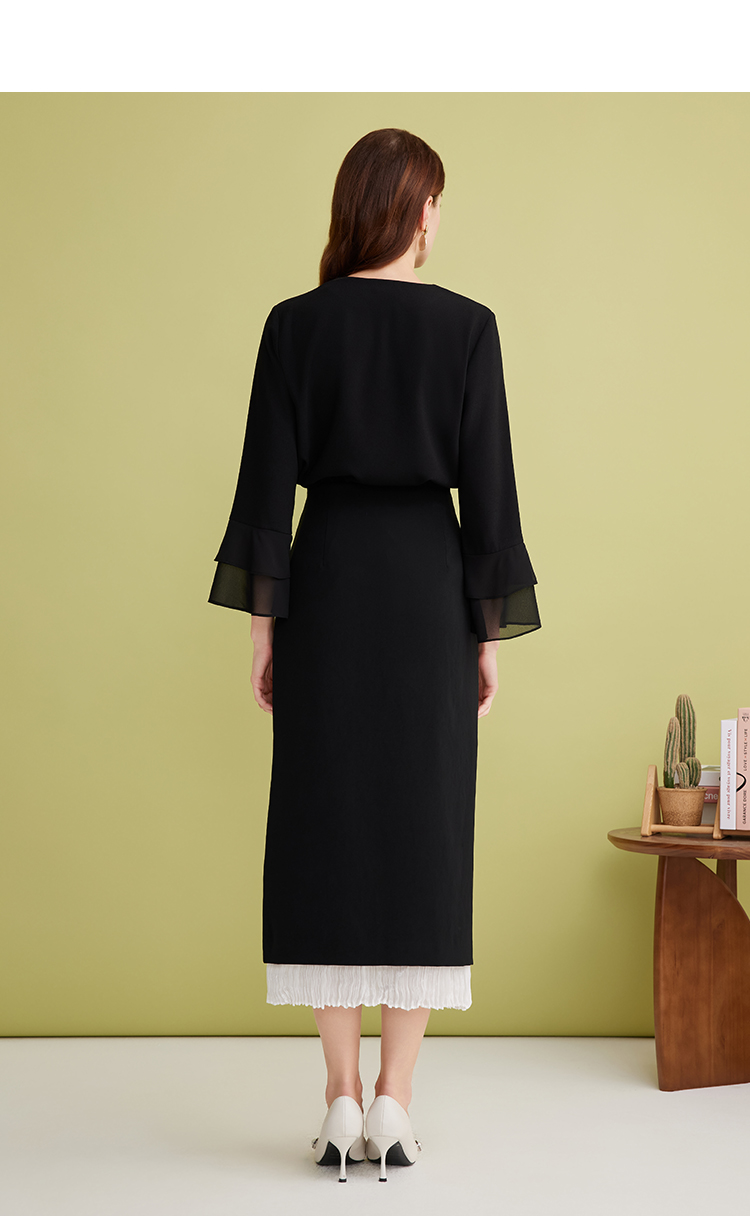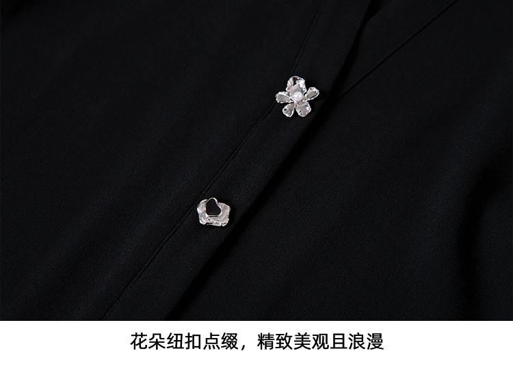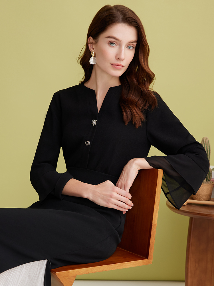 EITIE爱特爱气质V领显瘦设计感喇叭袖黑色衬衫上衣2025春新款A2513521