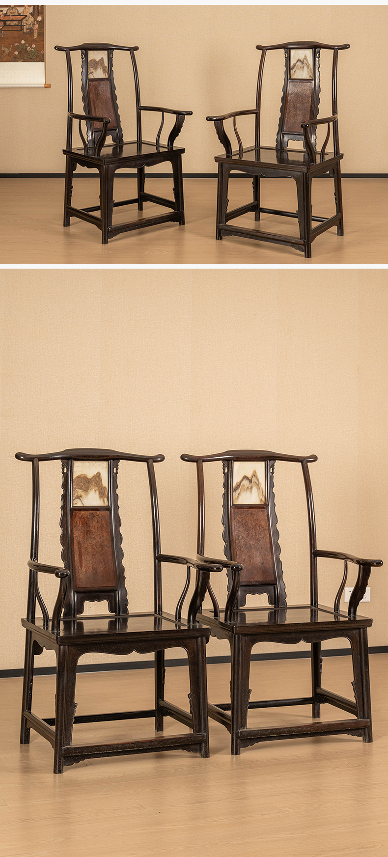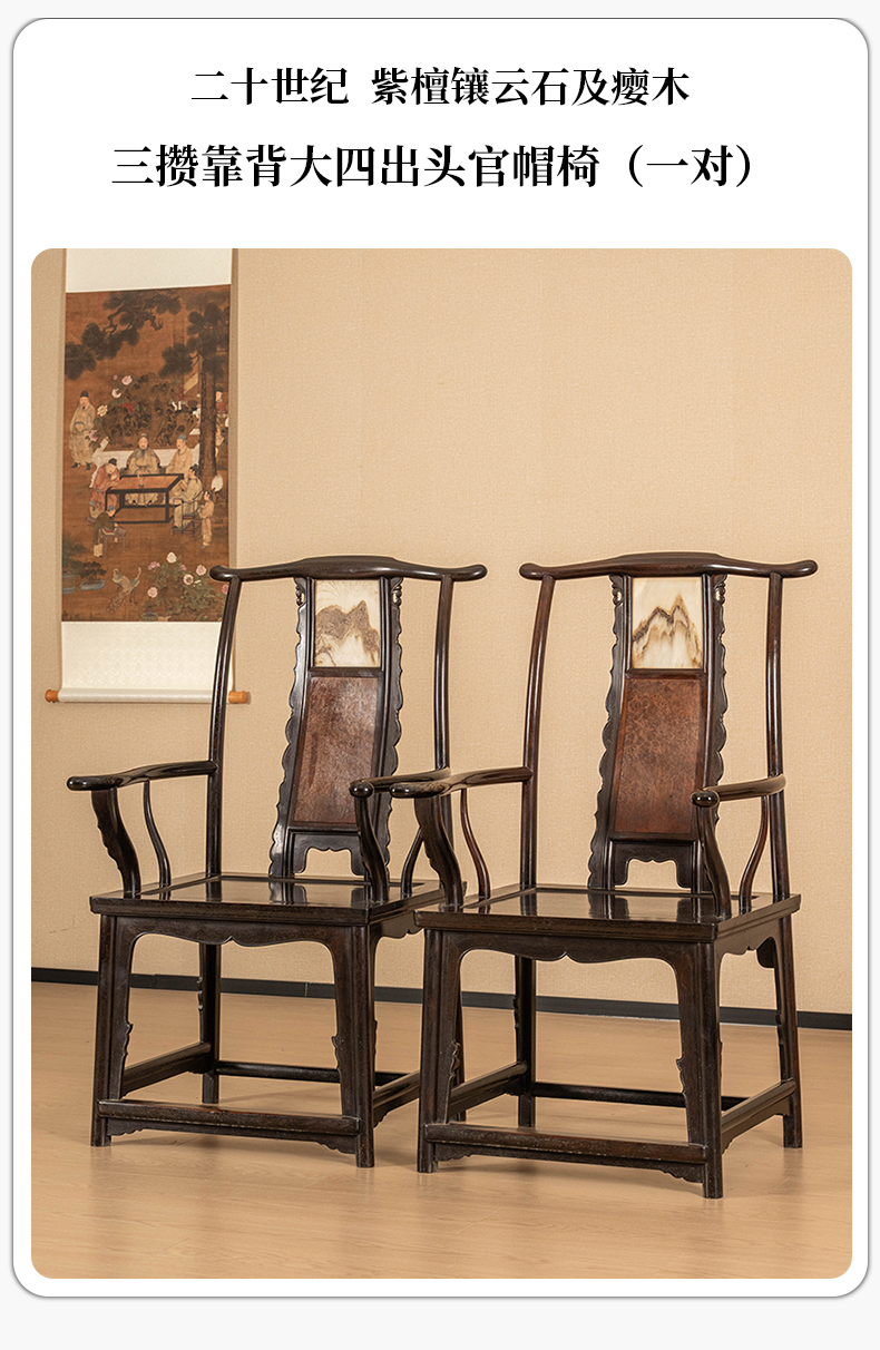 二十世纪 紫檀镶云石及瘿木三攒靠背大四出头官帽椅(一对)