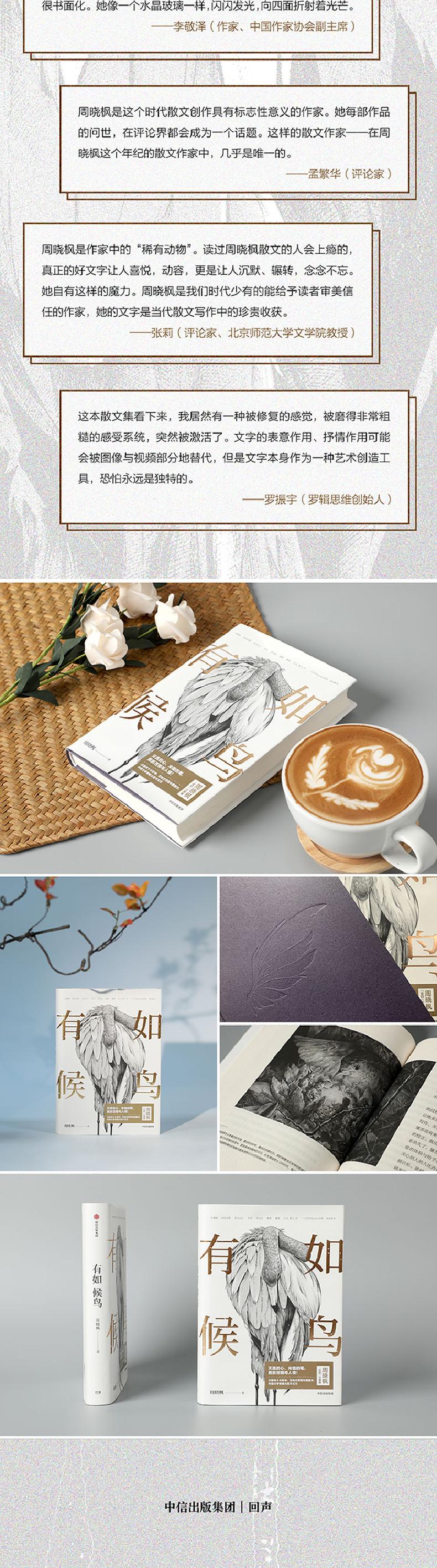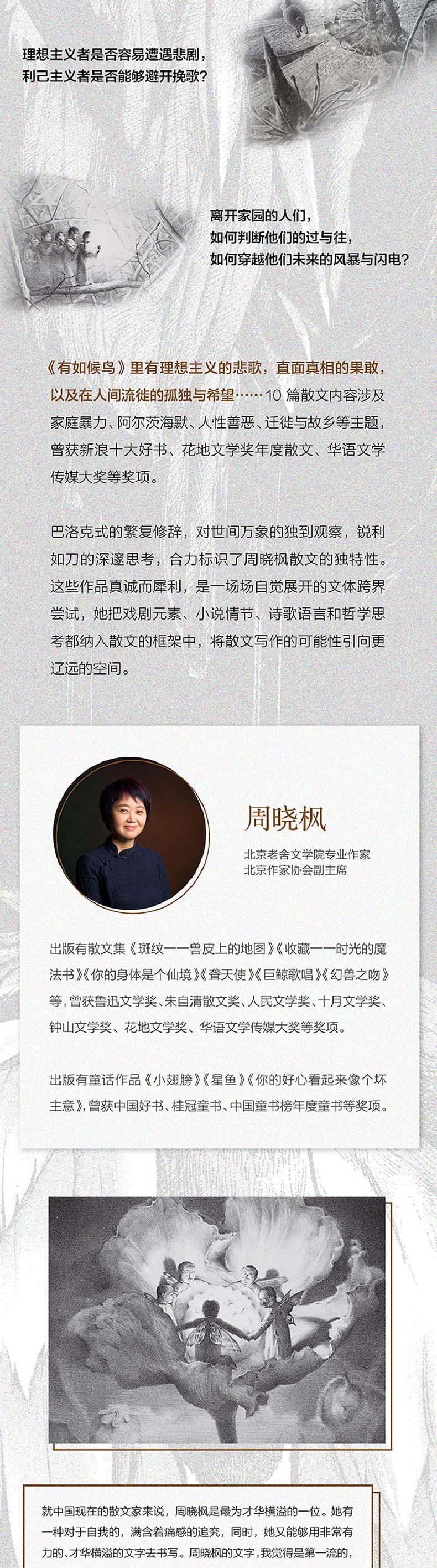 《有如候鸟》的十篇散文内容涉及家庭关系、阿尔茨海默、善恶思考、迁徙与故乡等话题,曾获新浪十大好书、花地文学奖年度散文、华语文学传媒大奖等奖项。巴洛克式的繁复修辞,对世间万象的独到观察,锐利如刀的深邃思考,合力标识了周晓枫散文的独特性。这些作品真诚而犀利,是一场场自觉展开的文体跨界尝试,她把戏剧元素、小说情节、诗歌语言和哲学思考都纳入散文的框架中,将散文写作的可能性引向更辽远的空间。