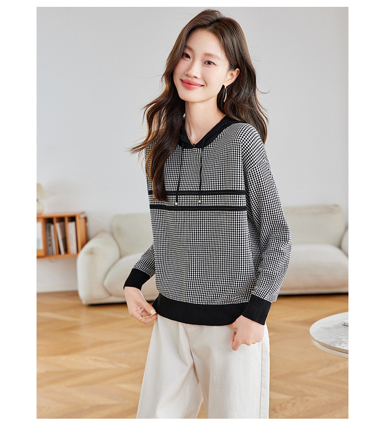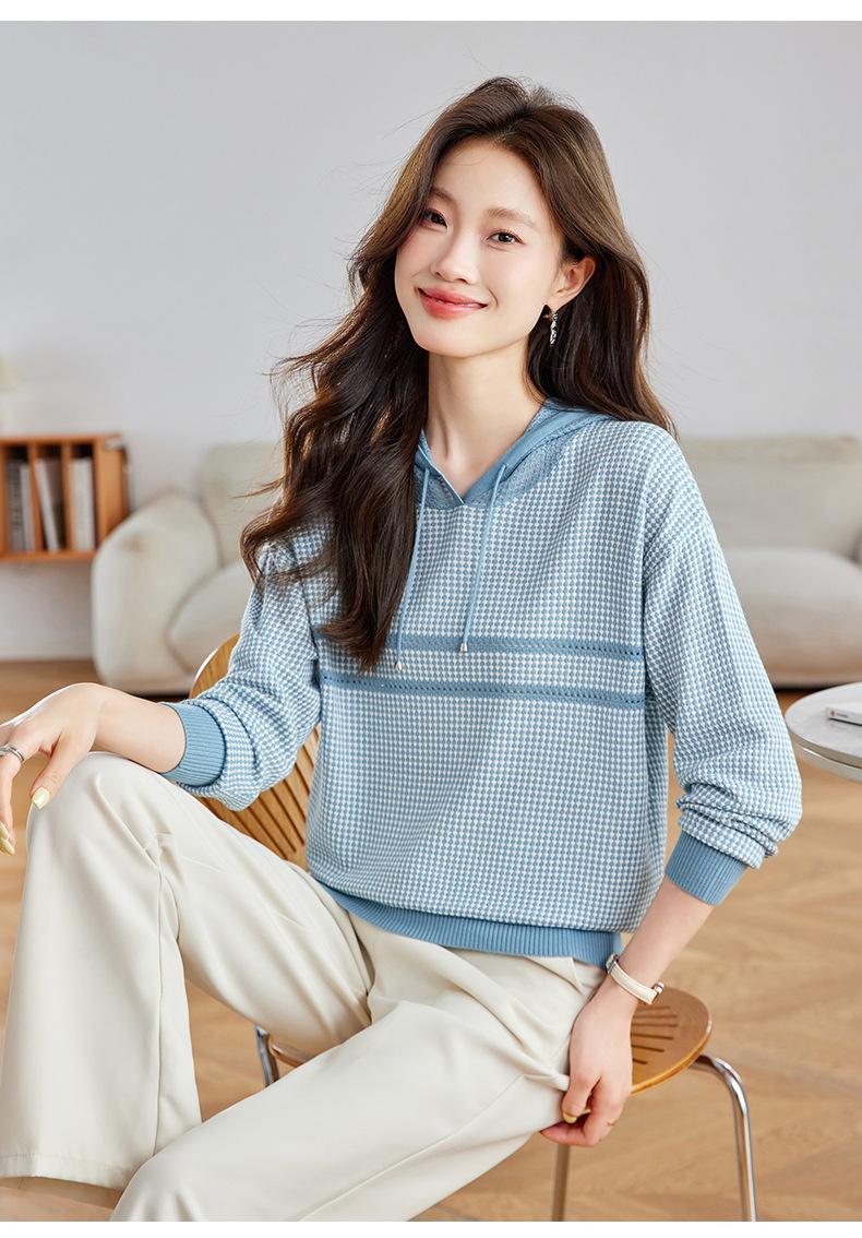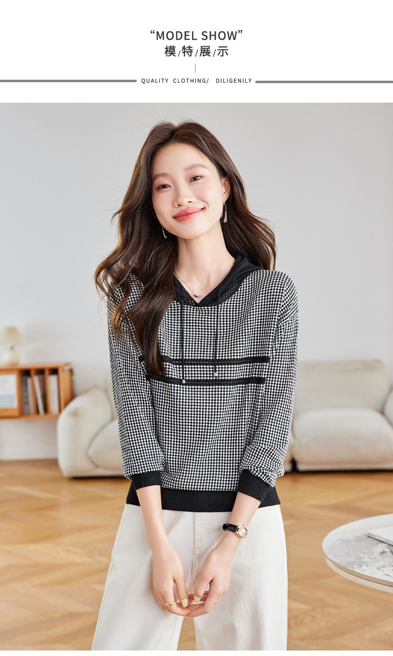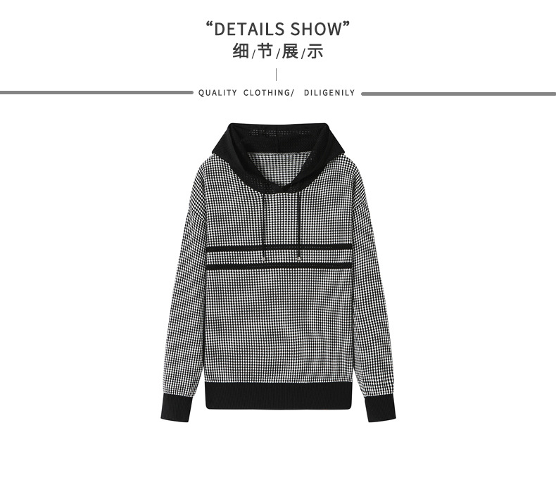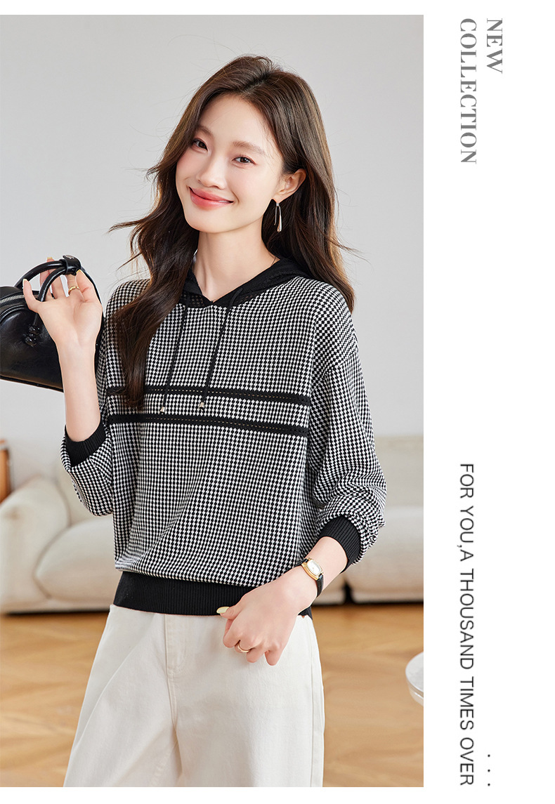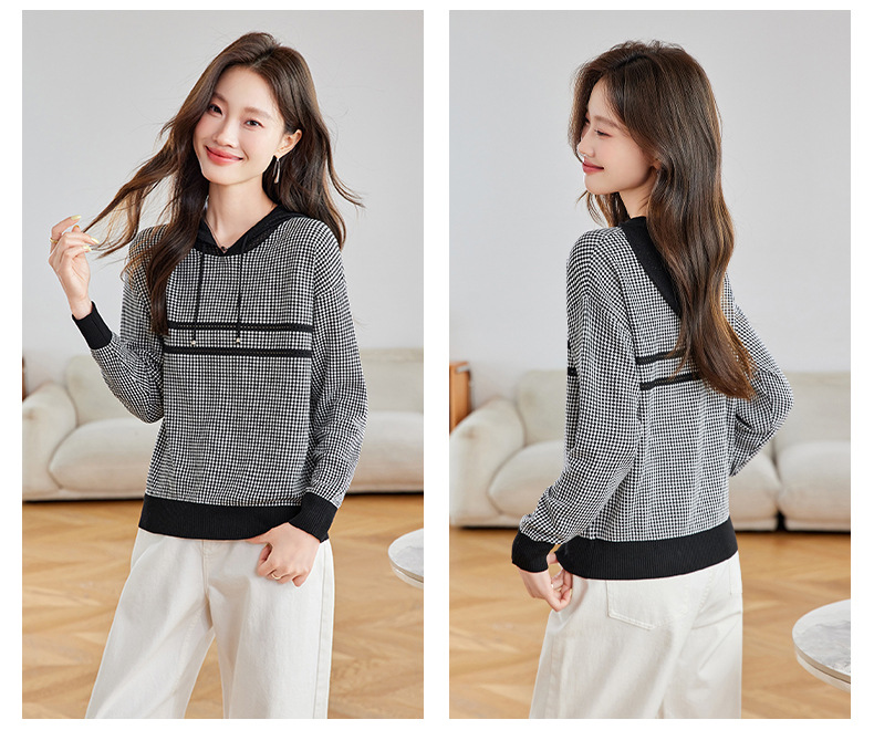 CC2025春秋新款连帽针织衫女千鸟格休闲卫衣韩版长袖宽松套头帽衫女