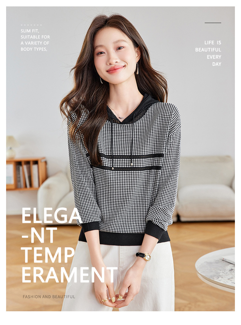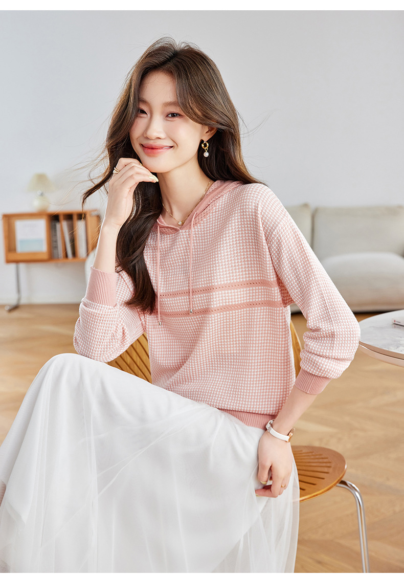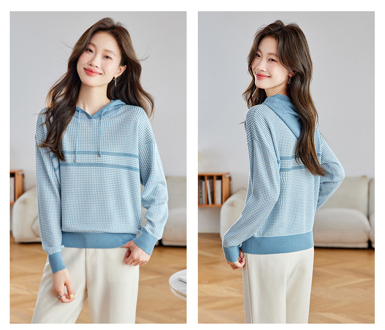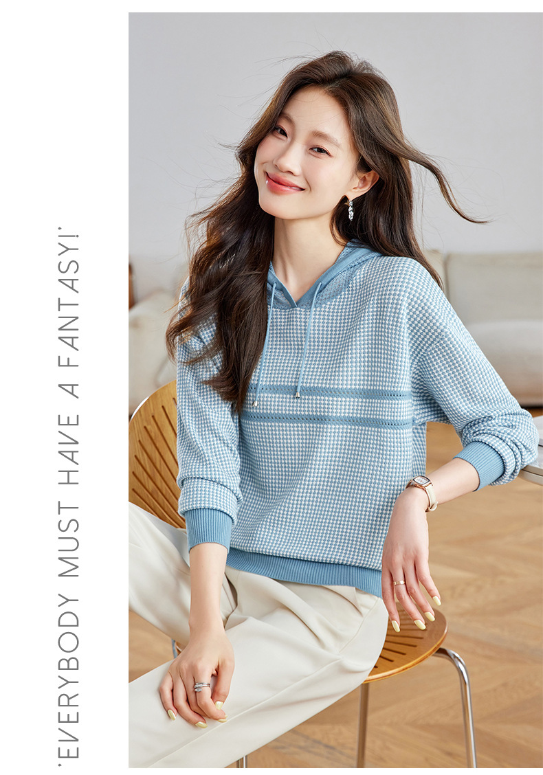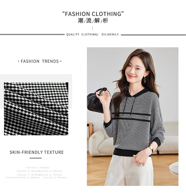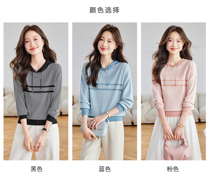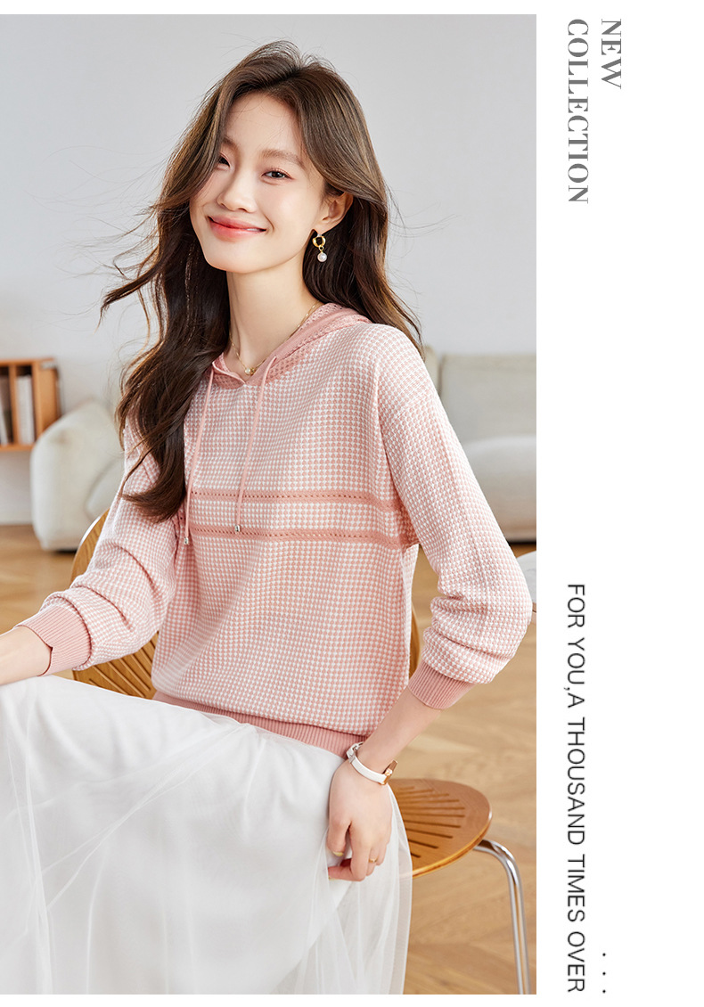 CC2025春秋新款连帽针织衫女千鸟格休闲卫衣韩版长袖宽松套头帽衫女