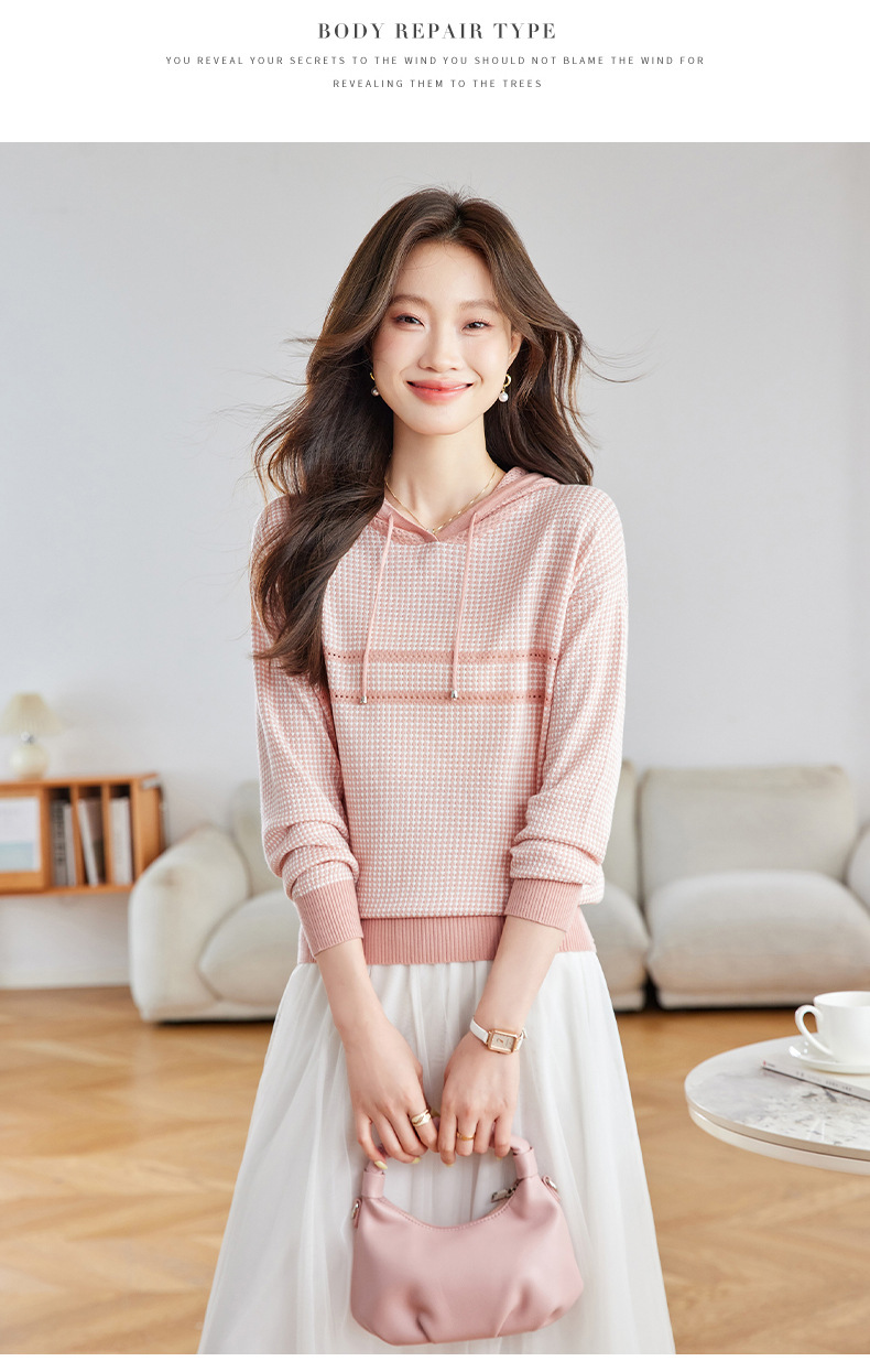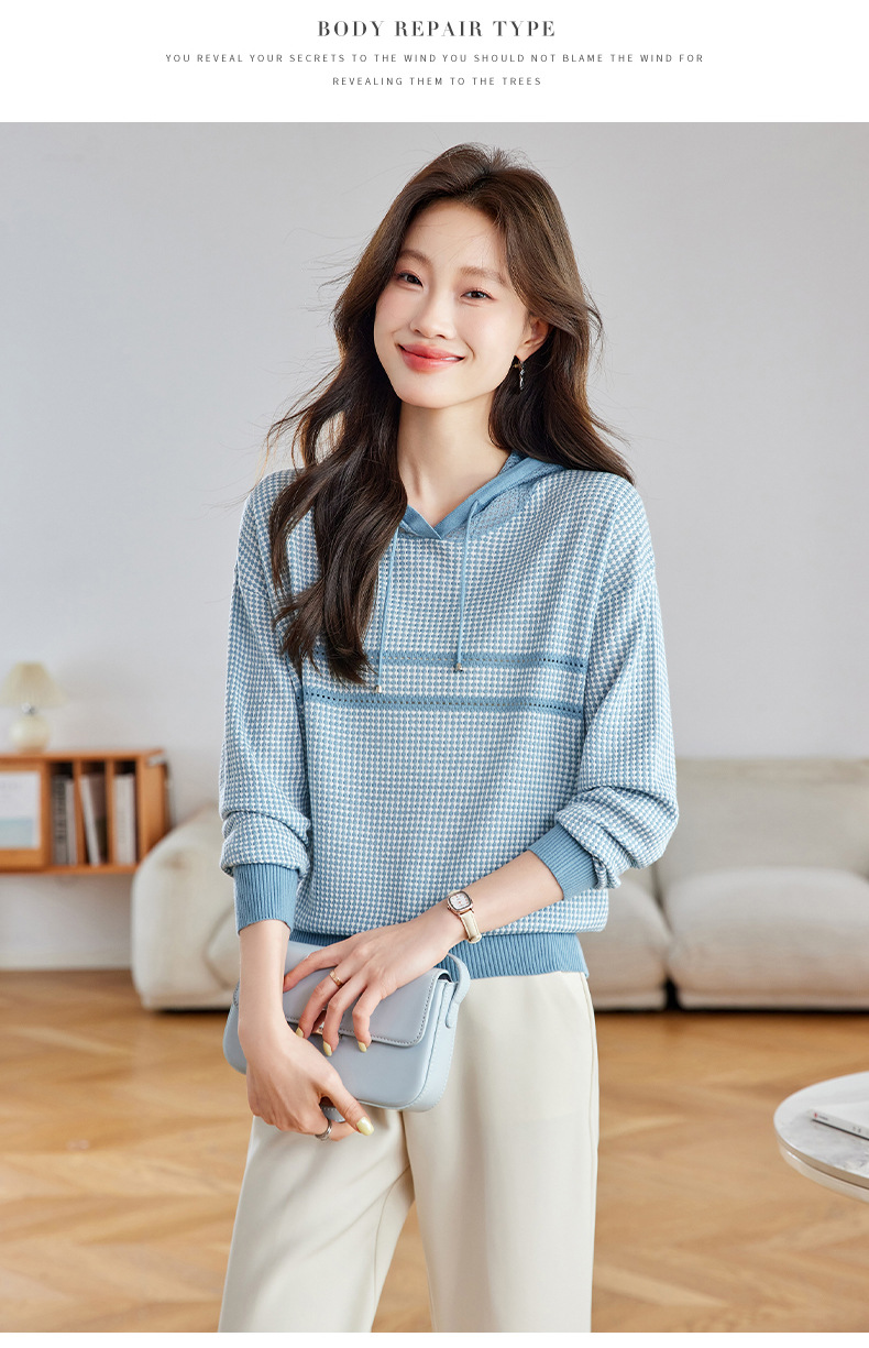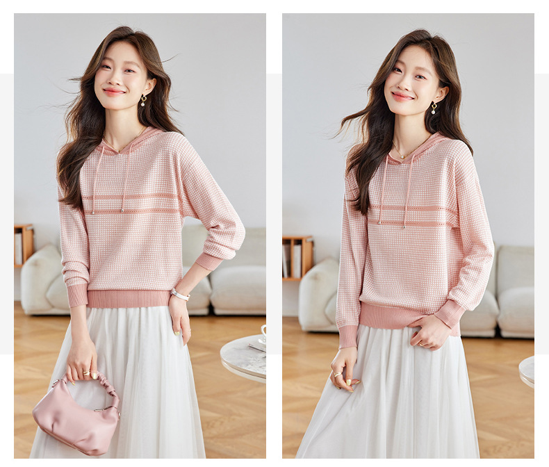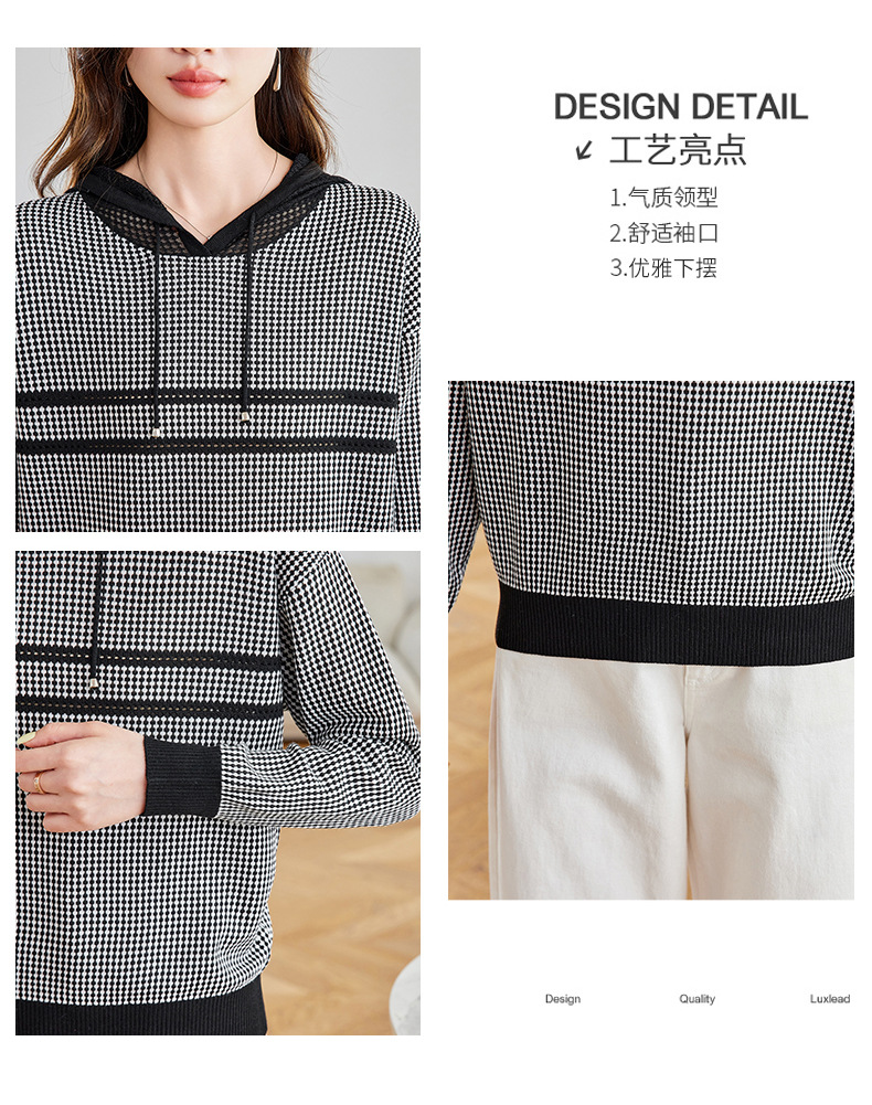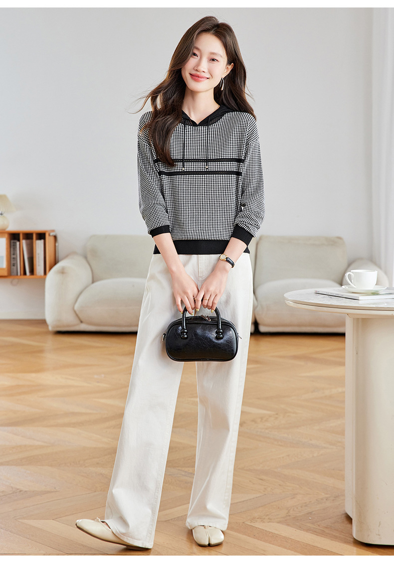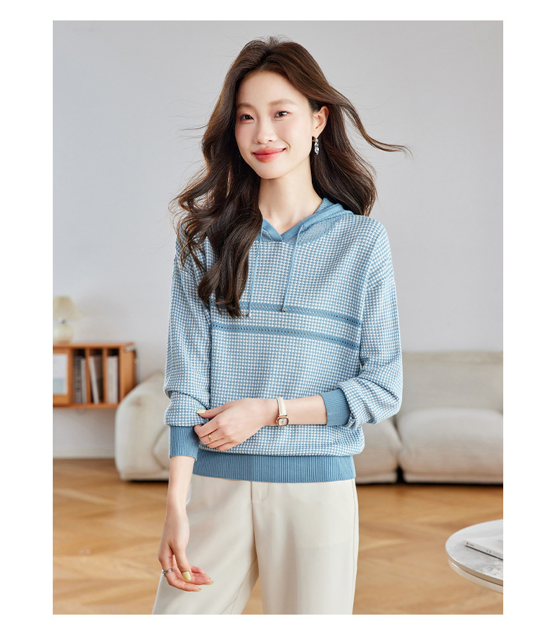 CC2025春秋新款连帽针织衫女千鸟格休闲卫衣韩版长袖宽松套头帽衫女