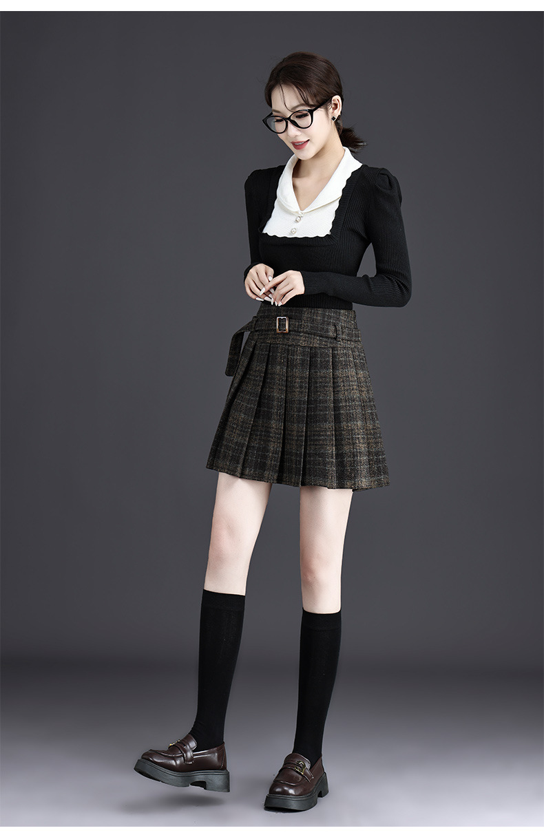 QYM 6989-Y时尚高腰A字短裙格子毛呢裙半身裙 商品图1