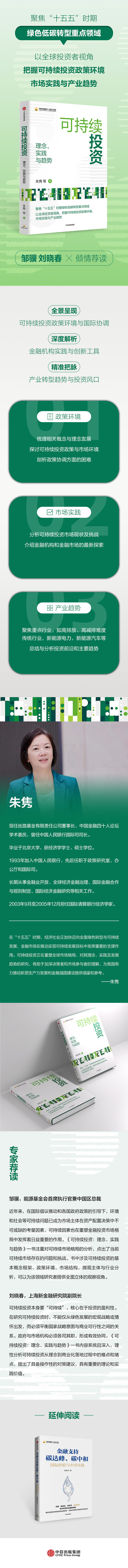 朱隽,著,现任丝路基金有限责任公司董事长,中国金融四十人论坛学术委员,曾任中国人民银行国际司司长。毕业于北京大学,获经济学学士、硕士学位。1993年加入中国人民银行,先后任职于政策研究室、办公厅和国际司。长期从事金融业开放、全球经济金融治理、国际金融合作与规则制定、国际经济金融研究等相关工作2003年9月至2005年12月担任国际清算银行经济学家。近年来,在国际倡议推动和各国政府政策的引导下,环境和社会等可持续问题已成为市场主体在资产配置决策中不可或缺的考量因素,可持续因素也在重塑金融投资市场格局中发挥着日益重要的作用。《可持续投资:理念、实践与趋势》一书注重对可持续市场格局的分析,点出了当前可持续市场存在的问题和挑战。书中涉及可持续投资的基本概念框架、政策环境、市场结构、微观主体与行业分析,可以为该领域研究者提供全面立体的观察视角。