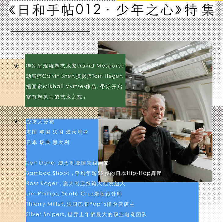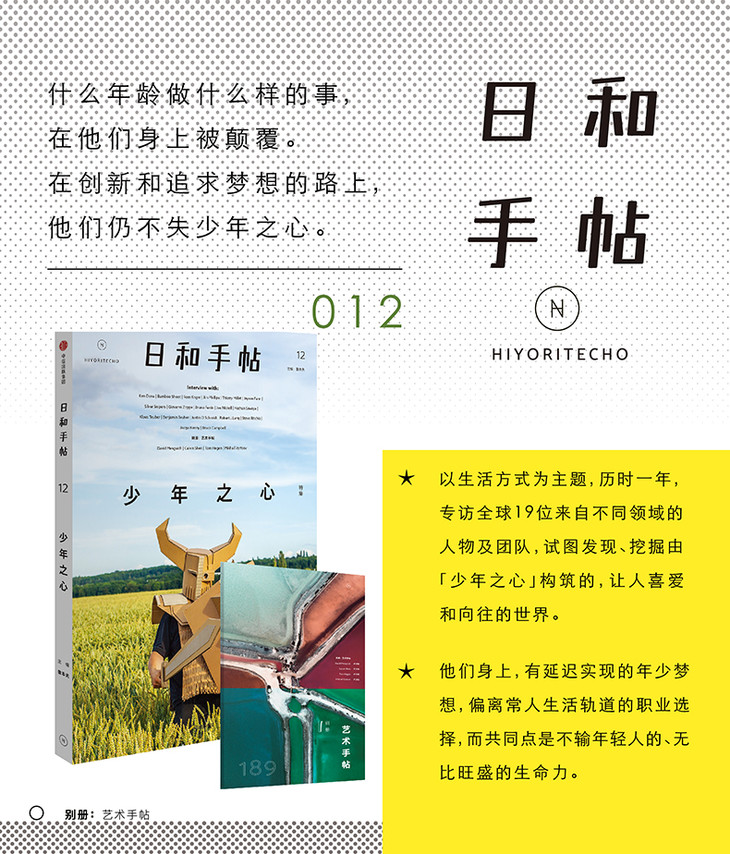 《少年之心》是内容品牌日和手帖HIYOTITECHO的2本特集书。我们走近澳大利亚国宝艺术家,以孩童作画的心,探索艺术的纯粹;平均年龄59岁的日本hiphop舞蹈组合,看她们不因被岁月冲刷过心气,依然充满玩性与阳光气息;来自瑞典的世界上高龄的电竞战队,剥离出这个年纪固有的状态,与年轻人共同竞技,向世界展示热情与;年轻时卖过跑车,60多岁用220000美元将波音727改造成了日常生活起居空间的BruceCampell,把热爱与生活结合,住在飞机里的日子,仿佛世外桃源一般……另附20页《艺术手帖》:特别呈现雕塑艺术家DavidMesguich、动画师CalvinShen、摄影师TomHegen、插画家MikhailVyrtsev。在这本书中,我们试图发现、挖掘由「少年之心」构筑的,让人喜爱和向往的世界。