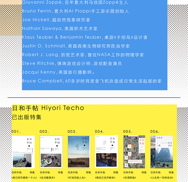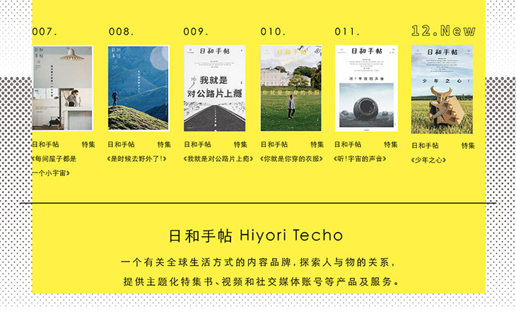 “日和”,就是好天气,美好的;“手帖”,就是记录本。“日和手帖”,就是记录下美好一切的本子。日和手帖HiyoriTecho,一个有关全球生活方式的内容品牌。我们探索人与物的关系,和中国年轻人、中产群体一起探索更适合我们自身、更具知性和吸引力的全球生活方式。为此,我们出版主题化特集书,提供官方站点、视频和社交媒体账号等产品及服务。