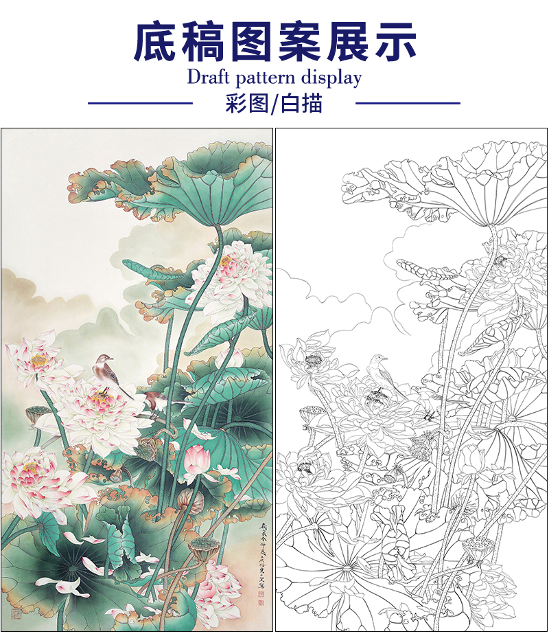 任重花鸟荷花工笔画白描底稿《荷塘珍禽》临摹勾线高清打印稿RD60