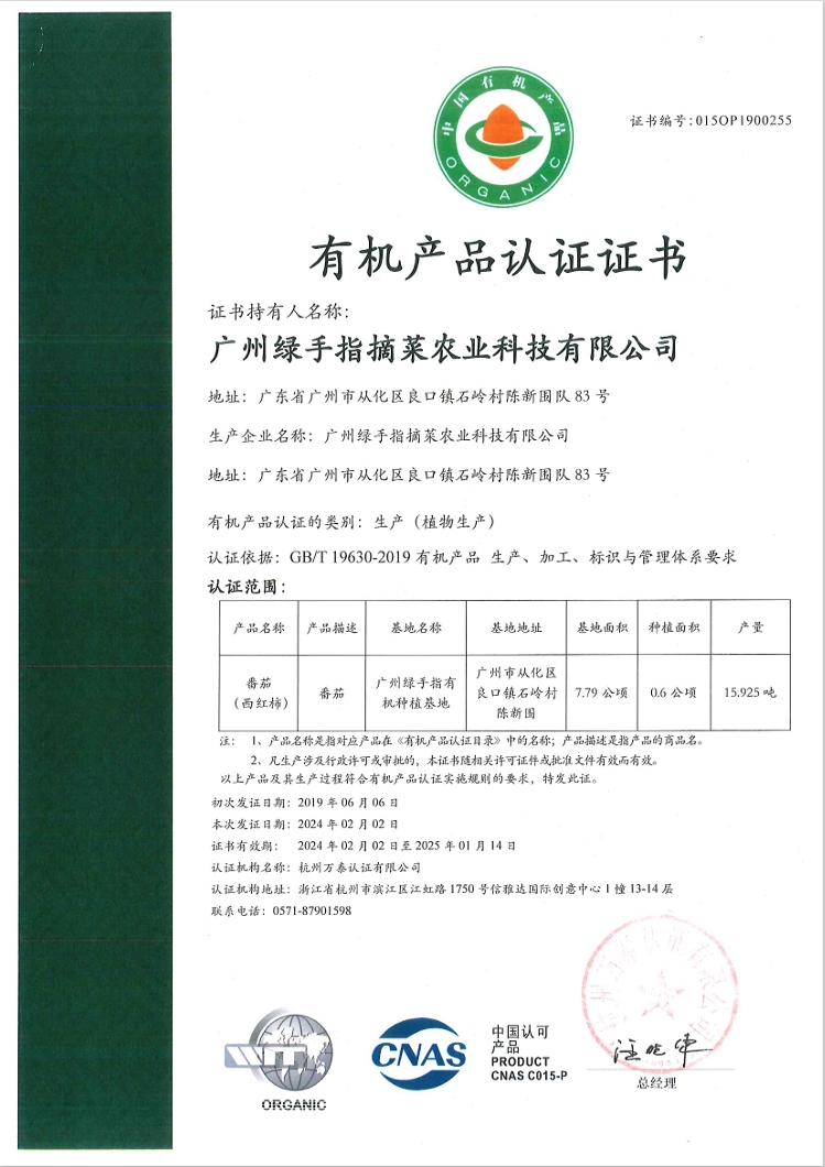 珠海、广州、韶关基地每年都会进行有机认证,先后取得过欧盟、北美和我国国标的有机认证,衢州基地今年也将申请转化期的认证。国标的有机认证会对整个基地进行考察检测,认证是针对单品的,农场100多种蔬菜认证下来费用甚高,就选择了水果、瓜果、根茎、叶菜里各1-2种作为代表进行认证。