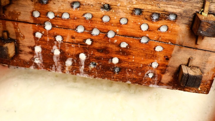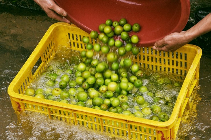 村民先用流溪河水源保护区的山泉水将青梅洗净,用传统木棒和改造后的木制机器打碎梅肉,随后用最木制的榨汁篮(捣碎、挤压重复两次以获得更多汁液),最后通过2-3次过滤得到青梅原液。