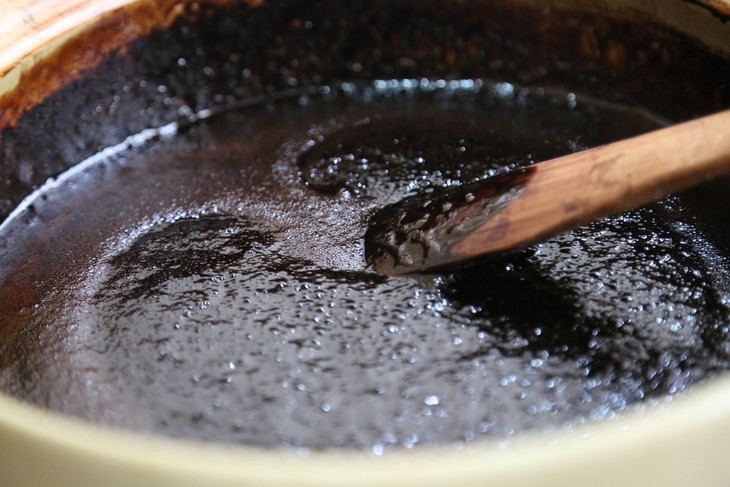 最后的熬制工序,村民用小煤炉慢火熬足足三天三夜,夜以继日达70多个小时。村民通常日夜轮流守炉,不时搅拌防止粘锅。就这样,在熬足三天三夜后,梅精才最终出炉了。