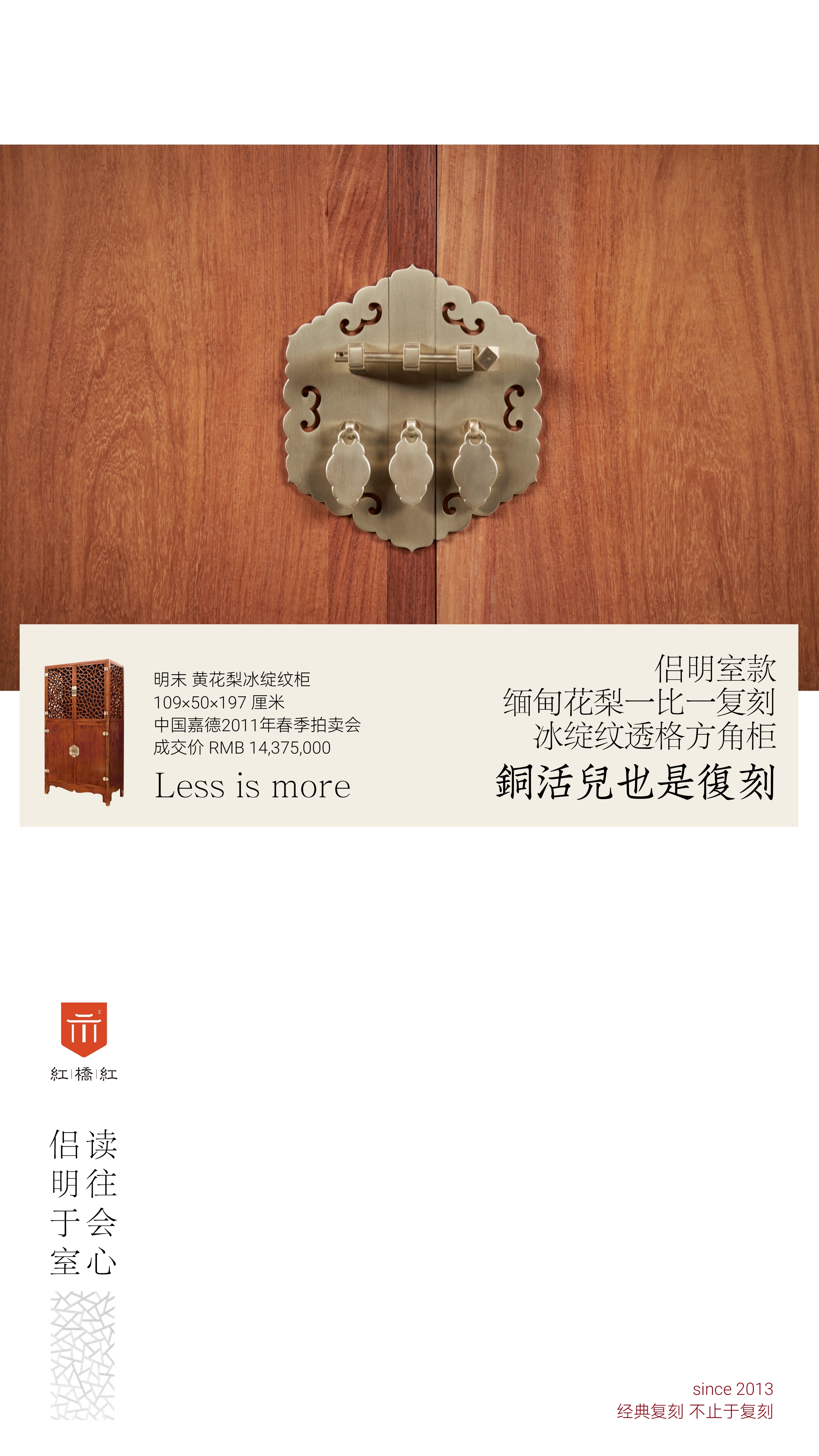 此器原型来自比利时大藏家·侣明室珍藏款,中国嘉德2011年春季拍卖会,“读往会心侣明室藏明”拍卖中一件明末 黄花梨冰绽纹柜,以14,375,000元人民币成交。