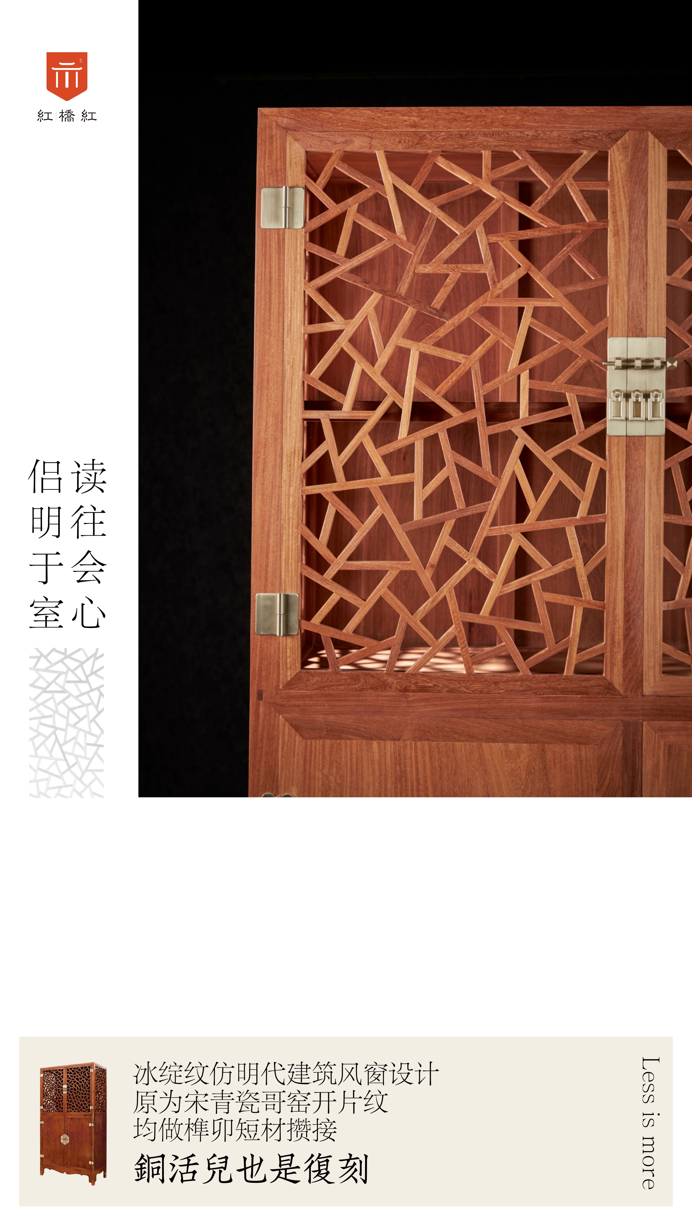 此柜始制于明未清初,当时的陈列柜传世品数量稀少,此柜独一无,具有独特的价值。此柜分上下两部,四扇门,以白铜合页安装。上下两扇门间均设活动式门杆,上部透格层与上层柜侧均做榫卯短材攒接成冰绽纹图案;冰绽纹仿照明代建筑中风窗的设计,原为宋青瓷哥窑开片纹。柜身装有白铜长方形合叶与海棠形面叶,三个方形钮头与吊牌,合页与面页上饰有云纹。下层柜身全素,柜门以格角榫攒边打槽平镶面心。柜内中央有一格板装两具抽屉。门下作肩底枨下有壸门牙条,两侧安类似牙条。大柜的方角形轮廓平直单一,其下安线条柔婉的壶门式宽牙子,都是精心营造的设计。