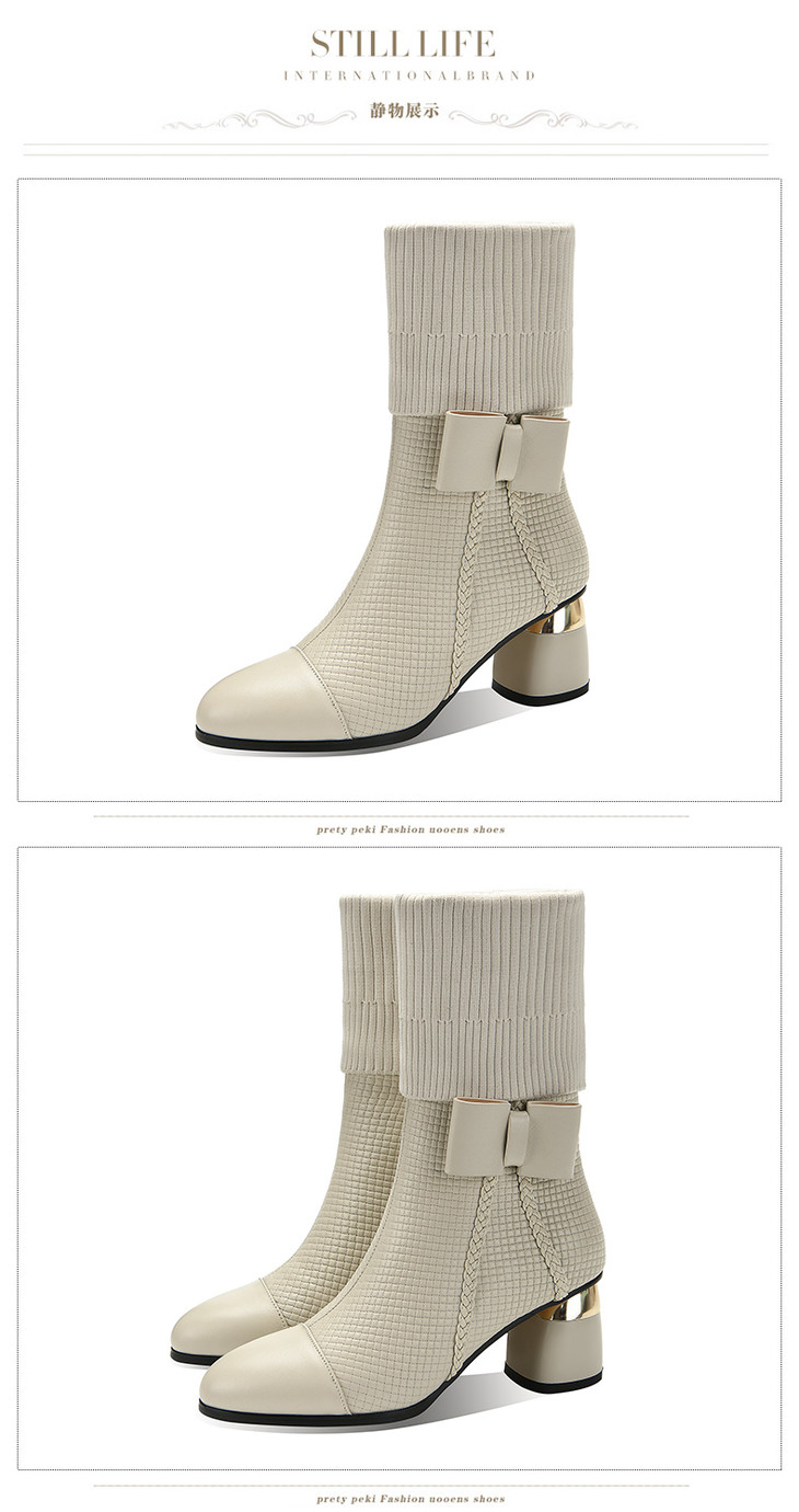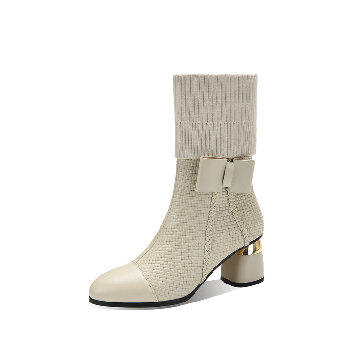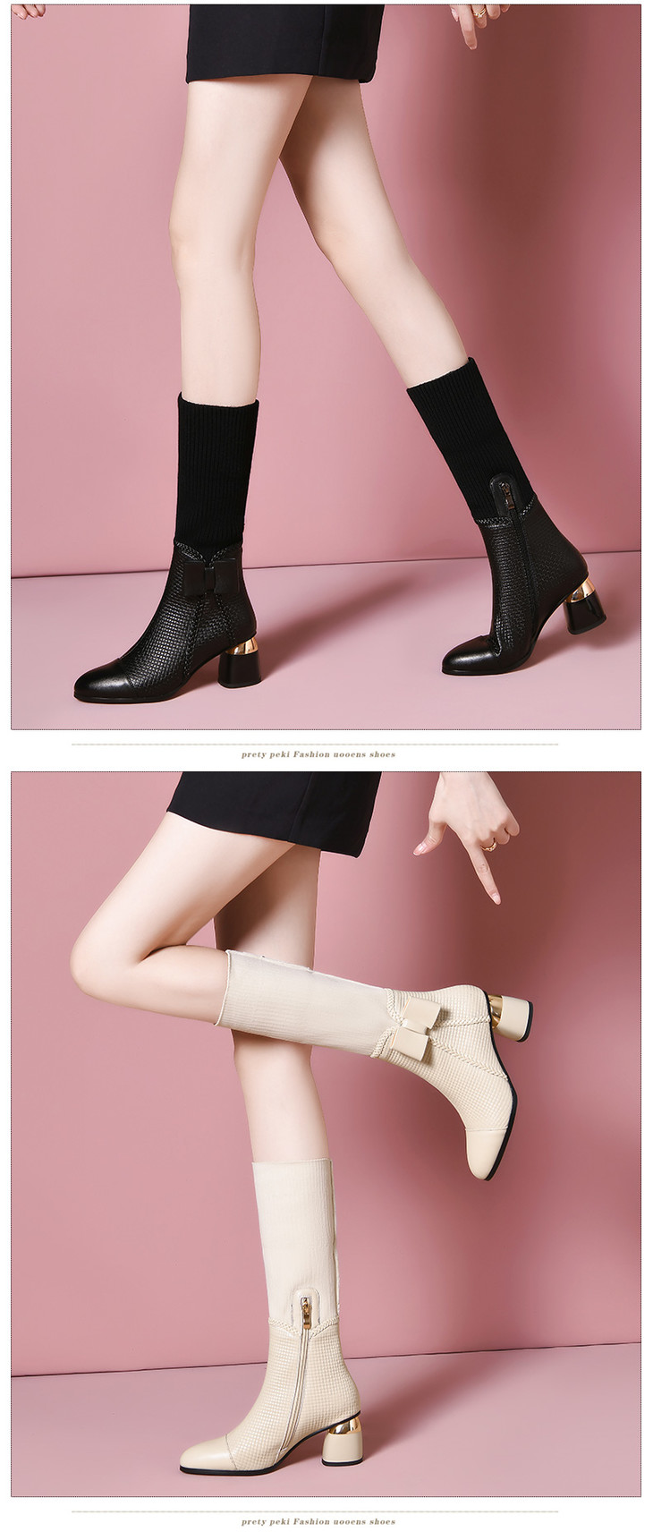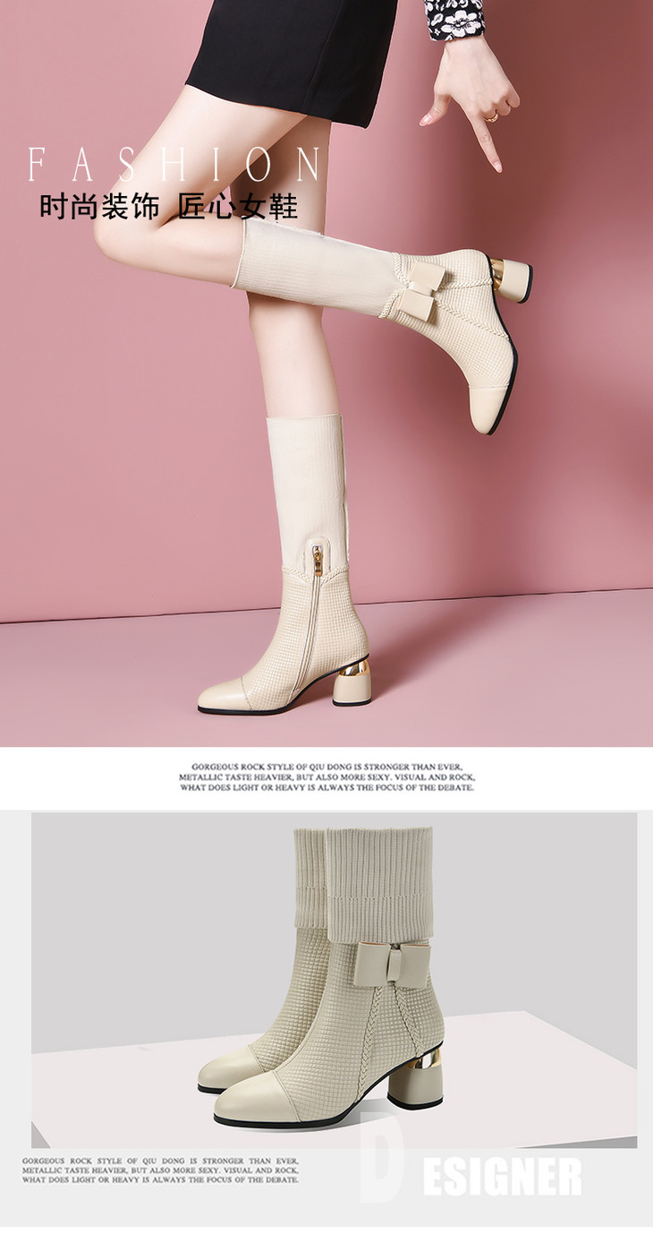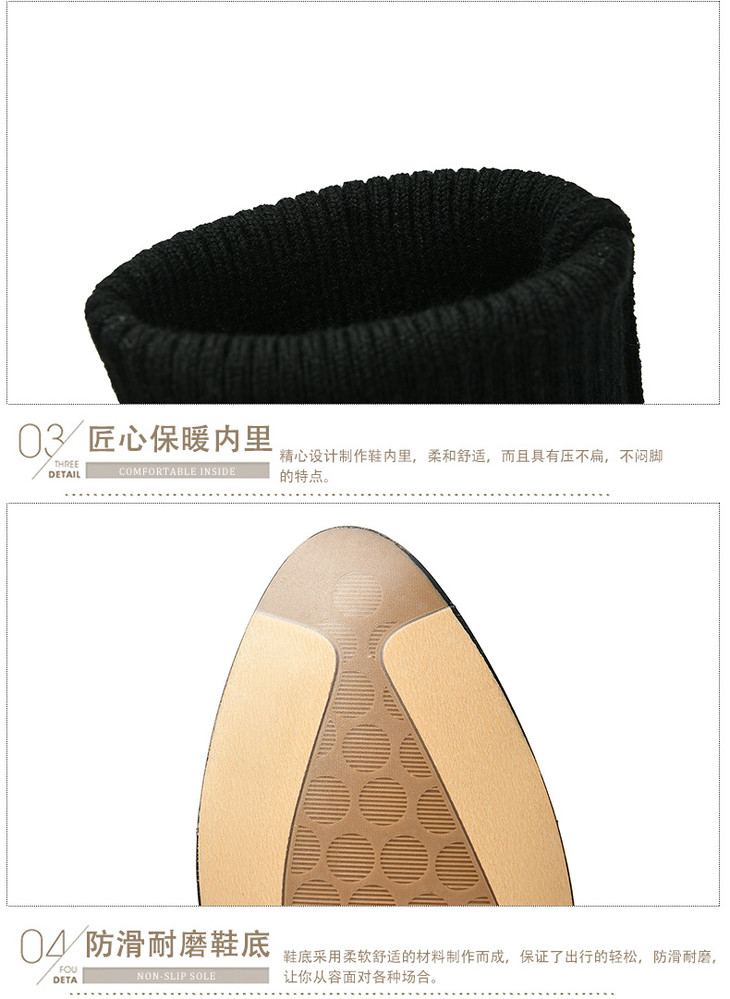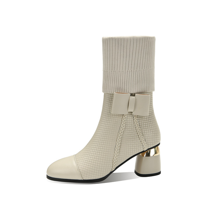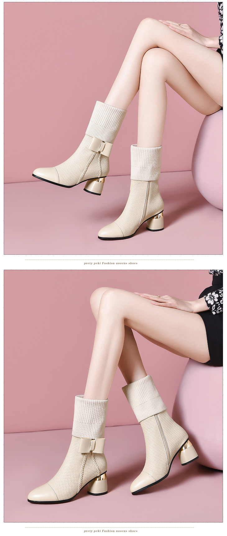 【预售5天】米白色短靴女冬季新款加绒黑色针织毛线中筒靴粗跟中跟靴子女SY&885-a28