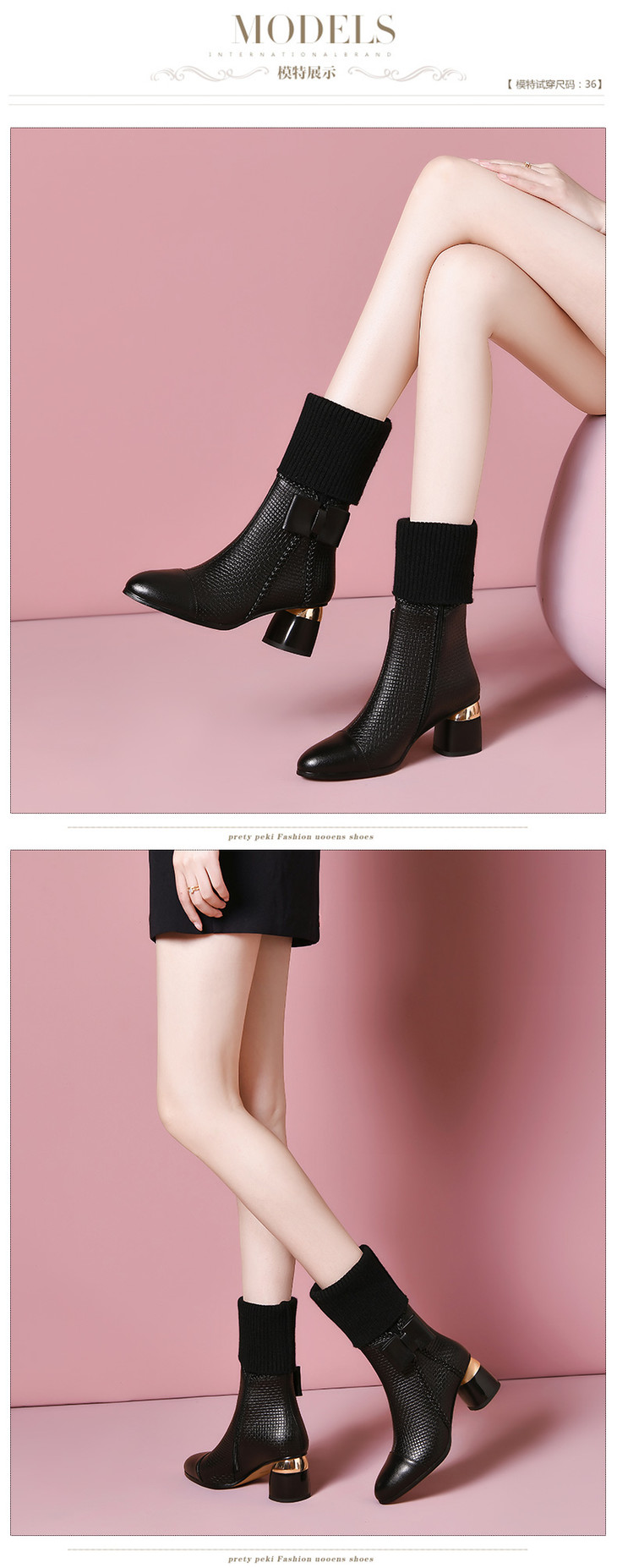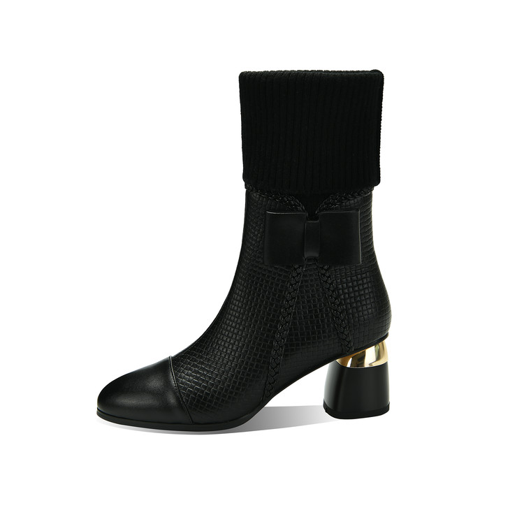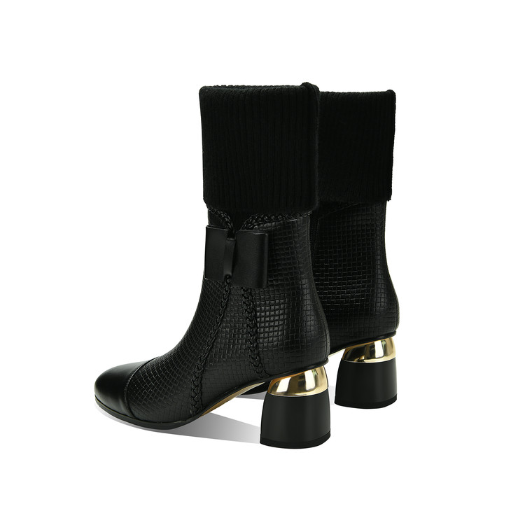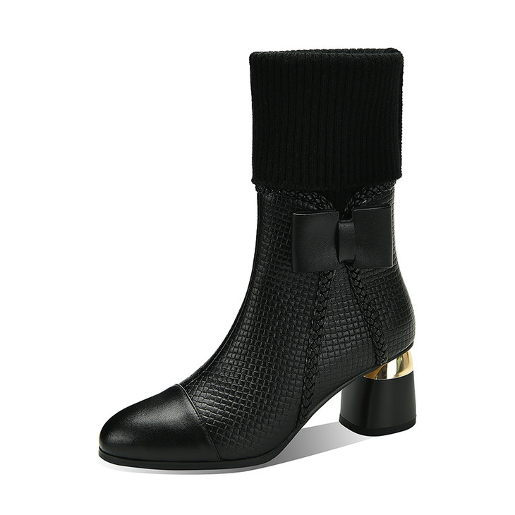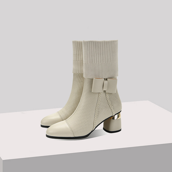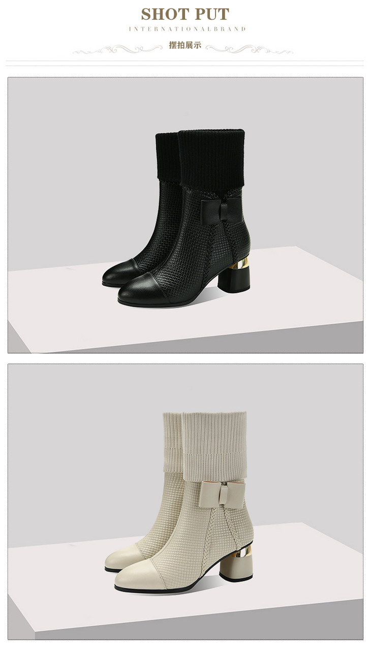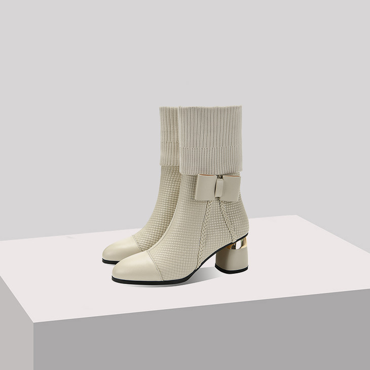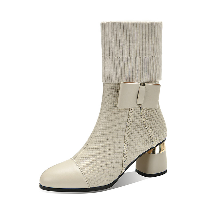 【预售5天】米白色短靴女冬季新款加绒黑色针织毛线中筒靴粗跟中跟靴子女SY&885-a28