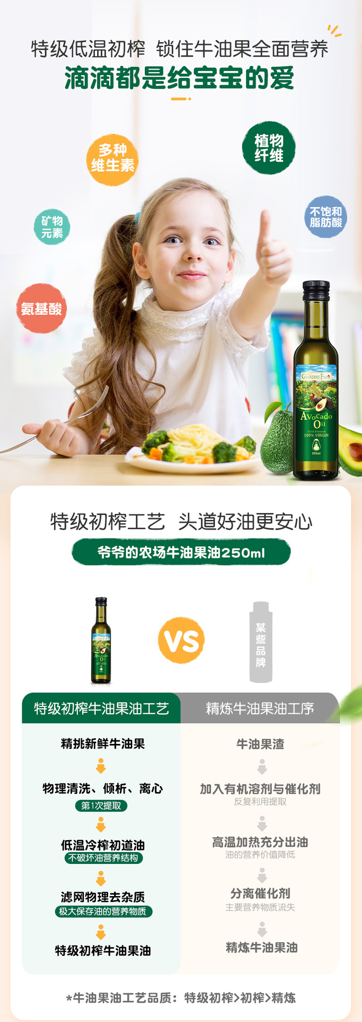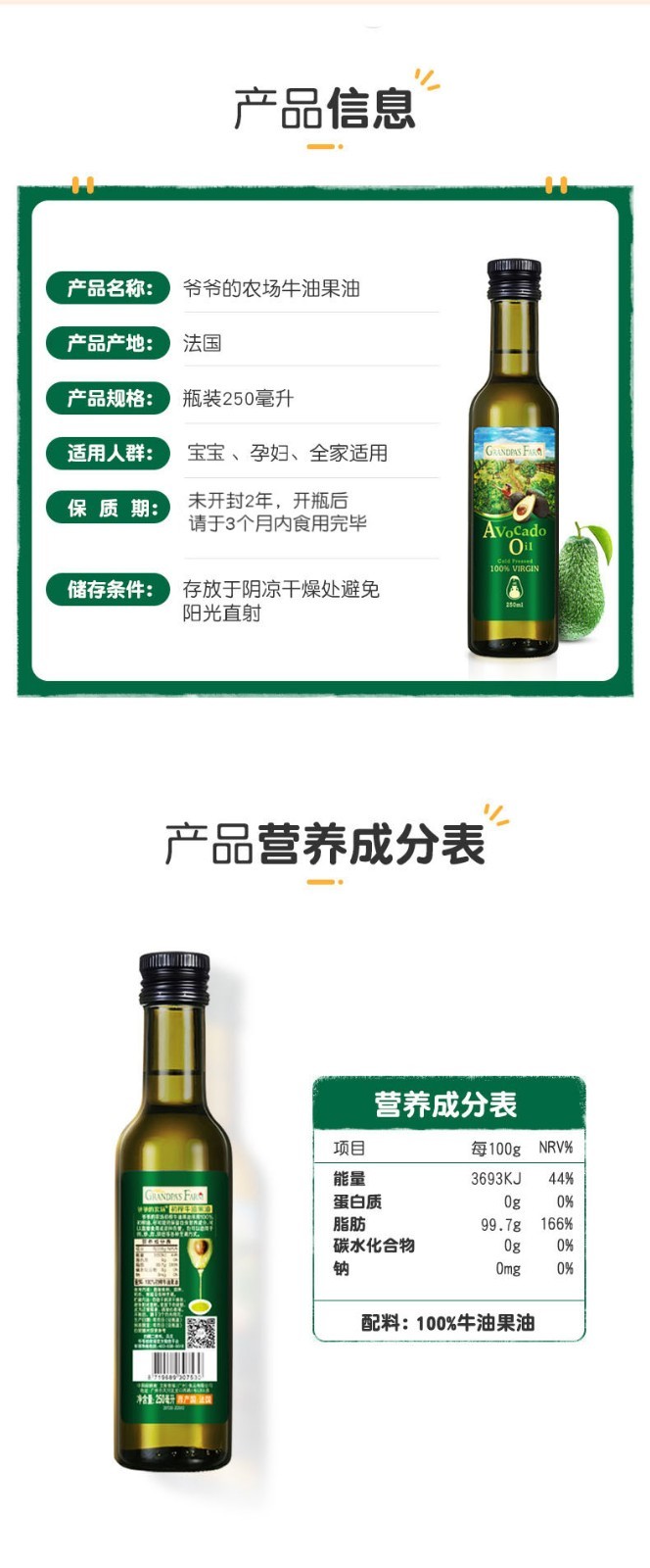 爷爷的农场初榨食用油 牛油果油 宝宝孕妇可用 250mL/瓶