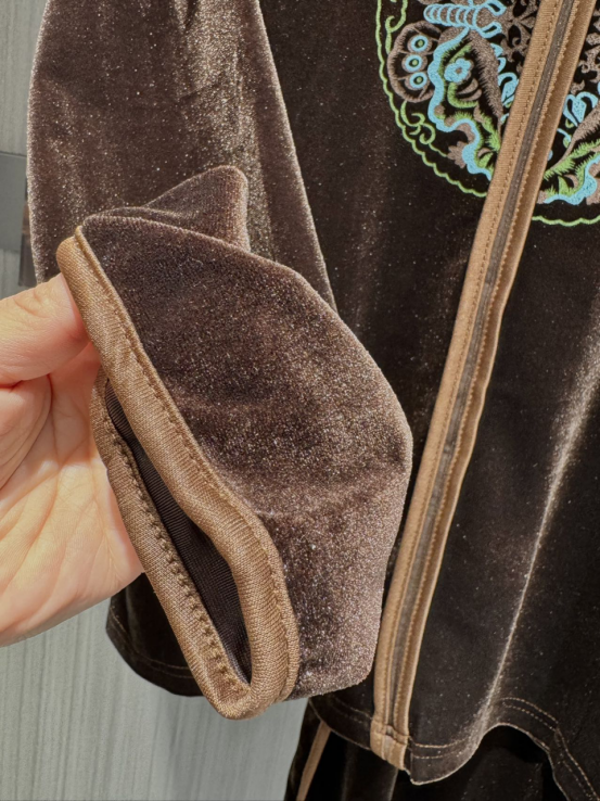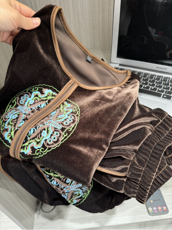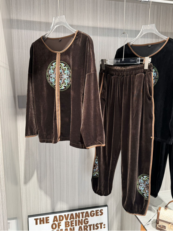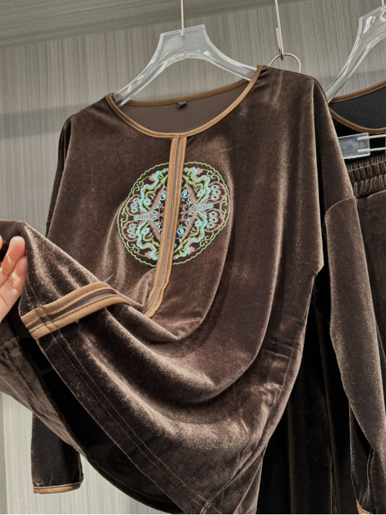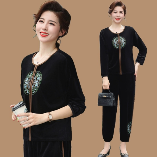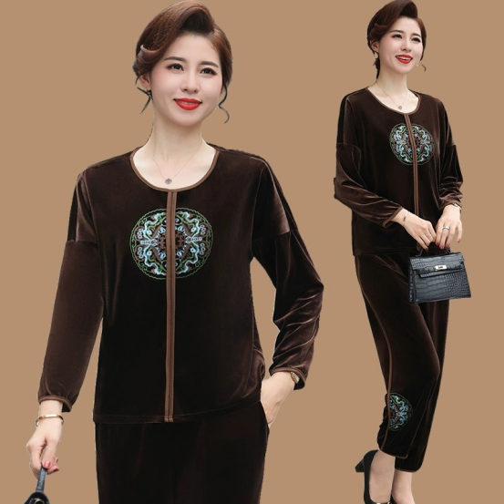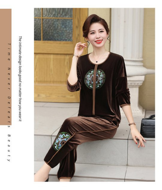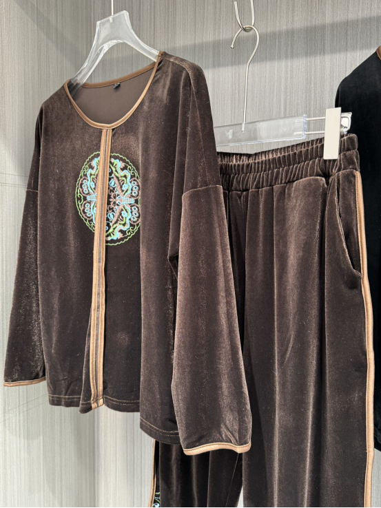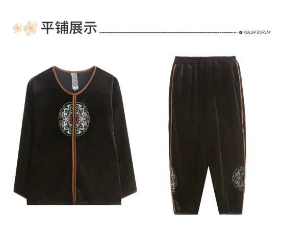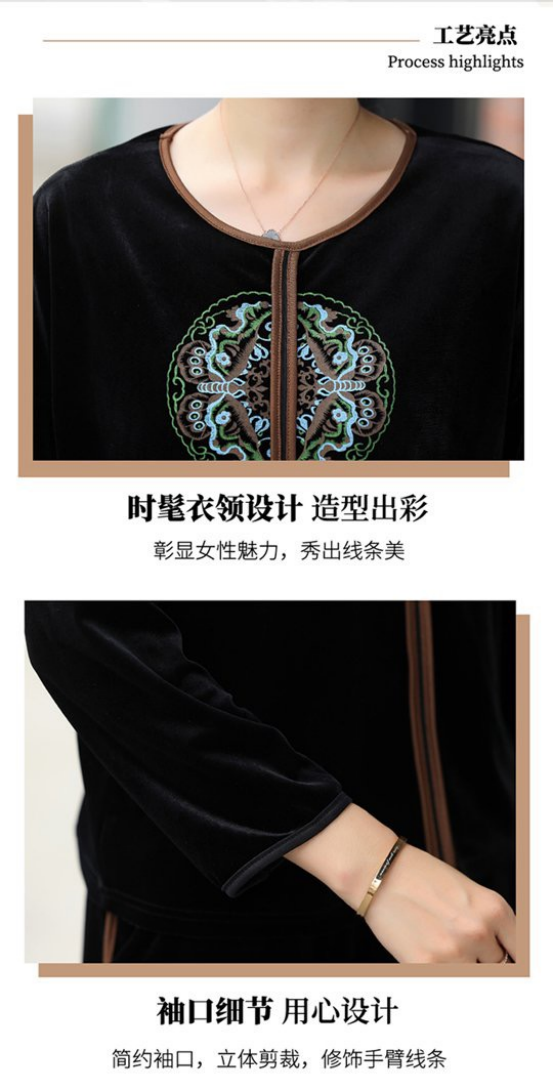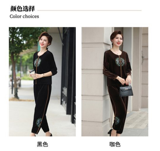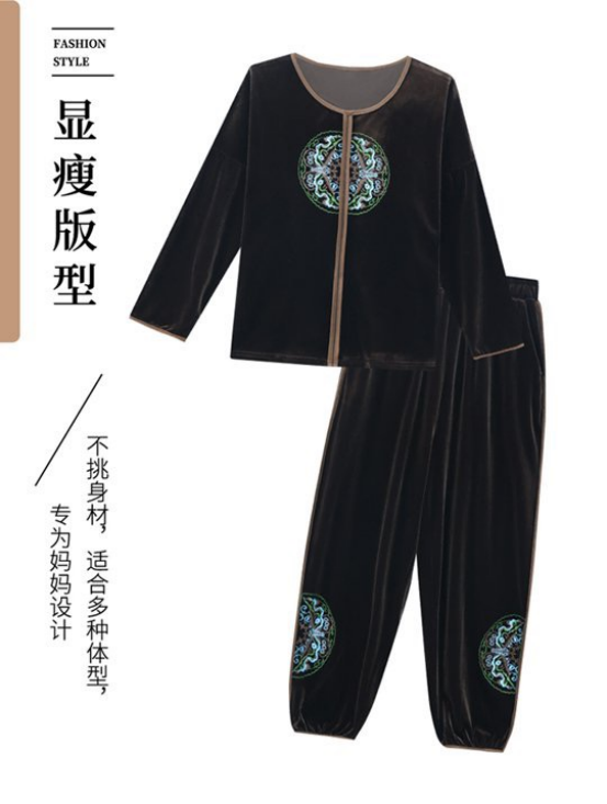 简牧羊国风金丝绒春秋休闲妈妈装 【品牌】简牧羊 【规格】1套 【颜色】黑色,咖色 【尺码】xl,2xl,3xl,4xl,5xl,6xl,7xl 【衣服面料材质】100%聚酯纤维 【发货地】浙江 【发货快递】京东 【发货时间】下单后3-5日 【不发货区域】港澳台新疆西藏不发,疫情地区不发,其他地区包邮 【售后须知】 1.不影响二次销售,支持七天无理由退换货。 2.一经下水,弄脏,使用过久,不再售后;商品签收后,如有质量问题48小时内提交售后,快递面单加商品同框拍照,反馈客服处理售后。 【是否支持7天无理由退换货】支持 保证产品和包装完好,不影响二次销售,支持7天无理由退换货。质量问题请提供产品和快递面单合照48小时内联系客服处理。 【温馨提示】产品由于拍摄灯光和天气原因以及显示器的差异可能会有轻微色差,颜色以收到实物为准。