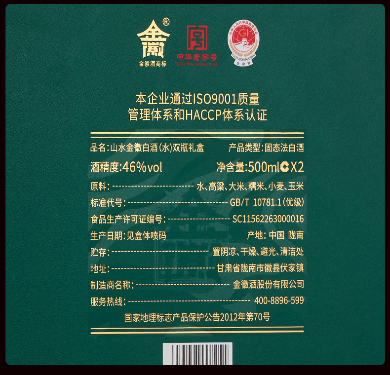 【水双瓶礼盒】金徽酒 46度山水金徽·水 白酒礼盒