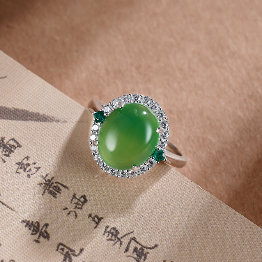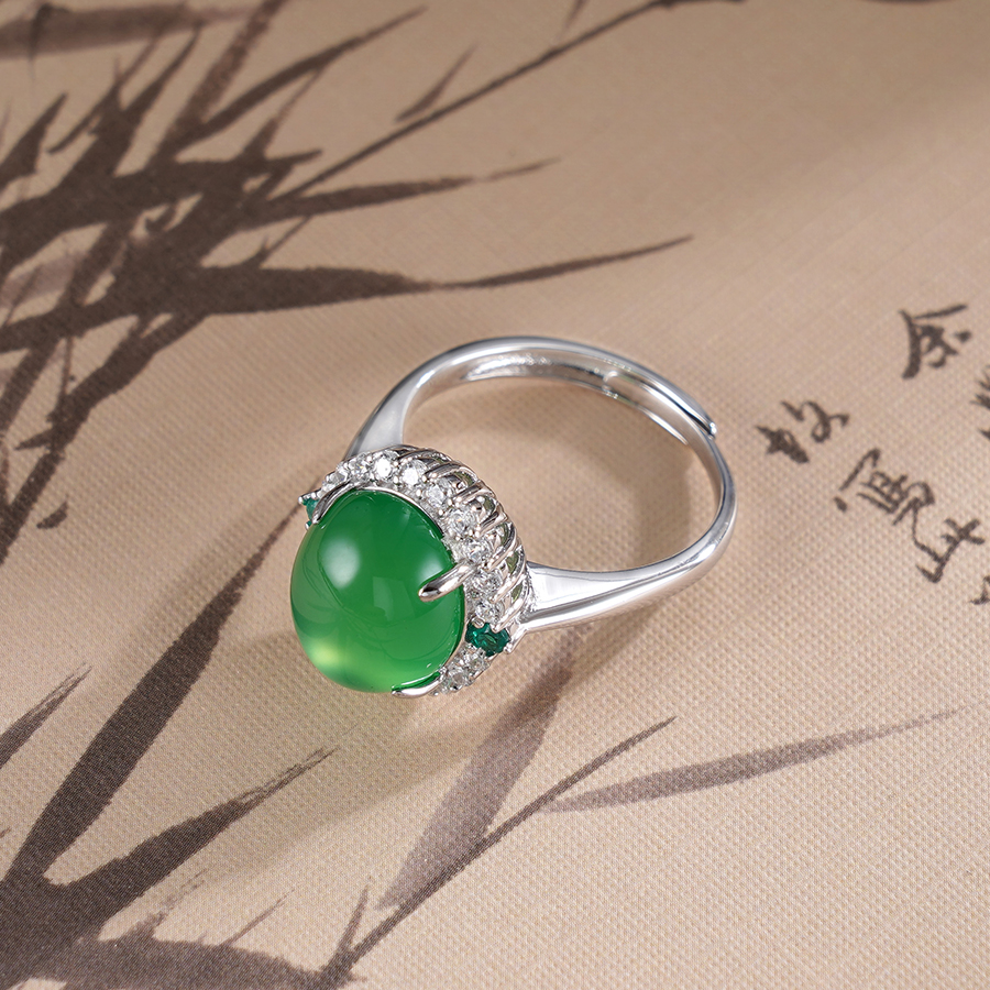 【寓意】:绿玉髓作为戒指主体,细闪锆石环绕密嵌,暗藏设计上的小心思。翠色妙凝,彰显满满的生机与活力。