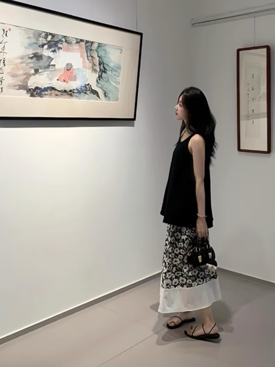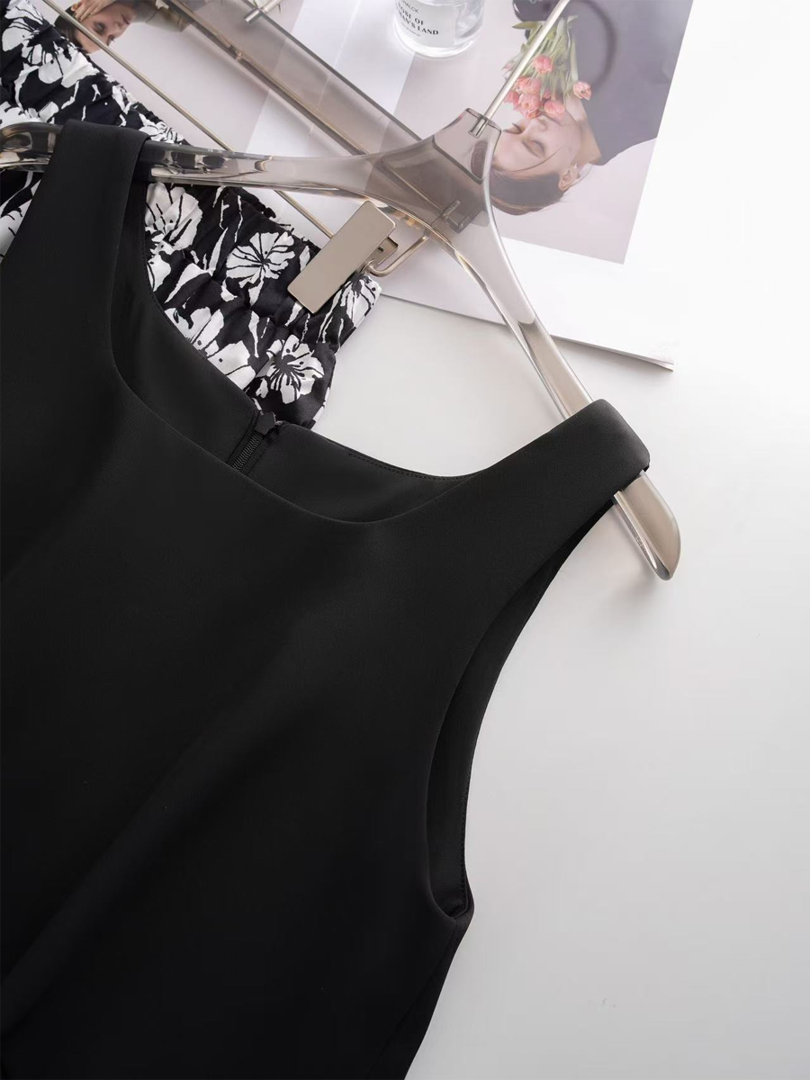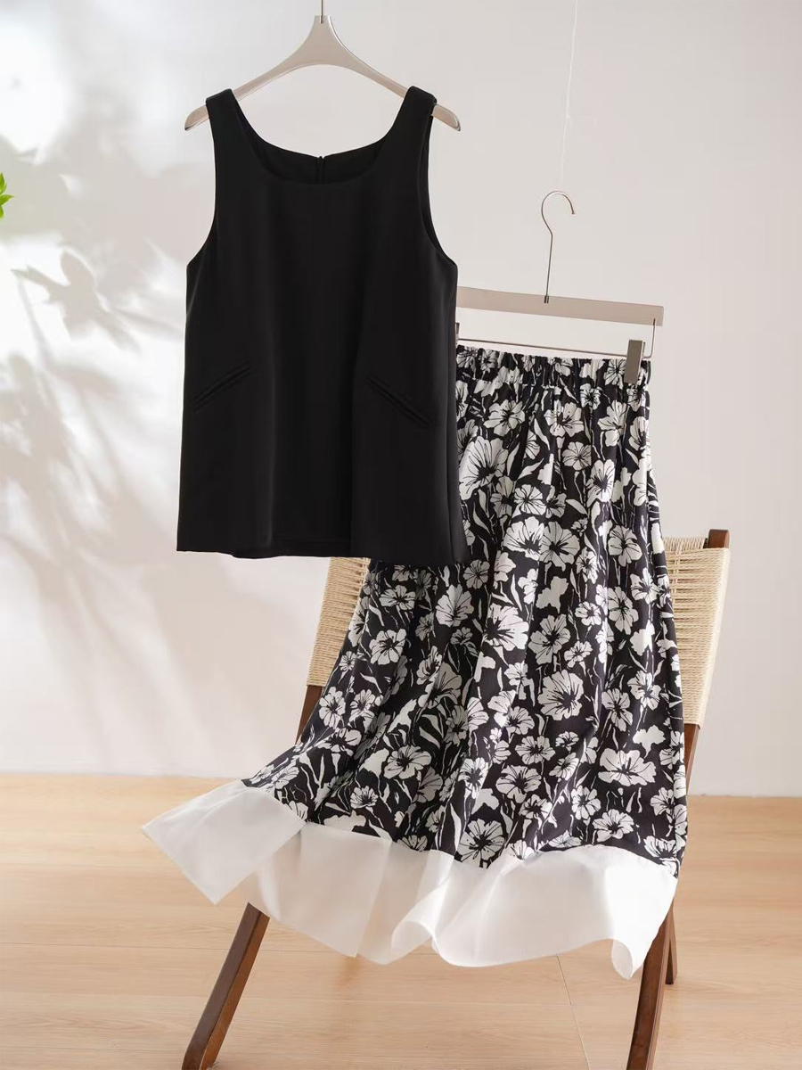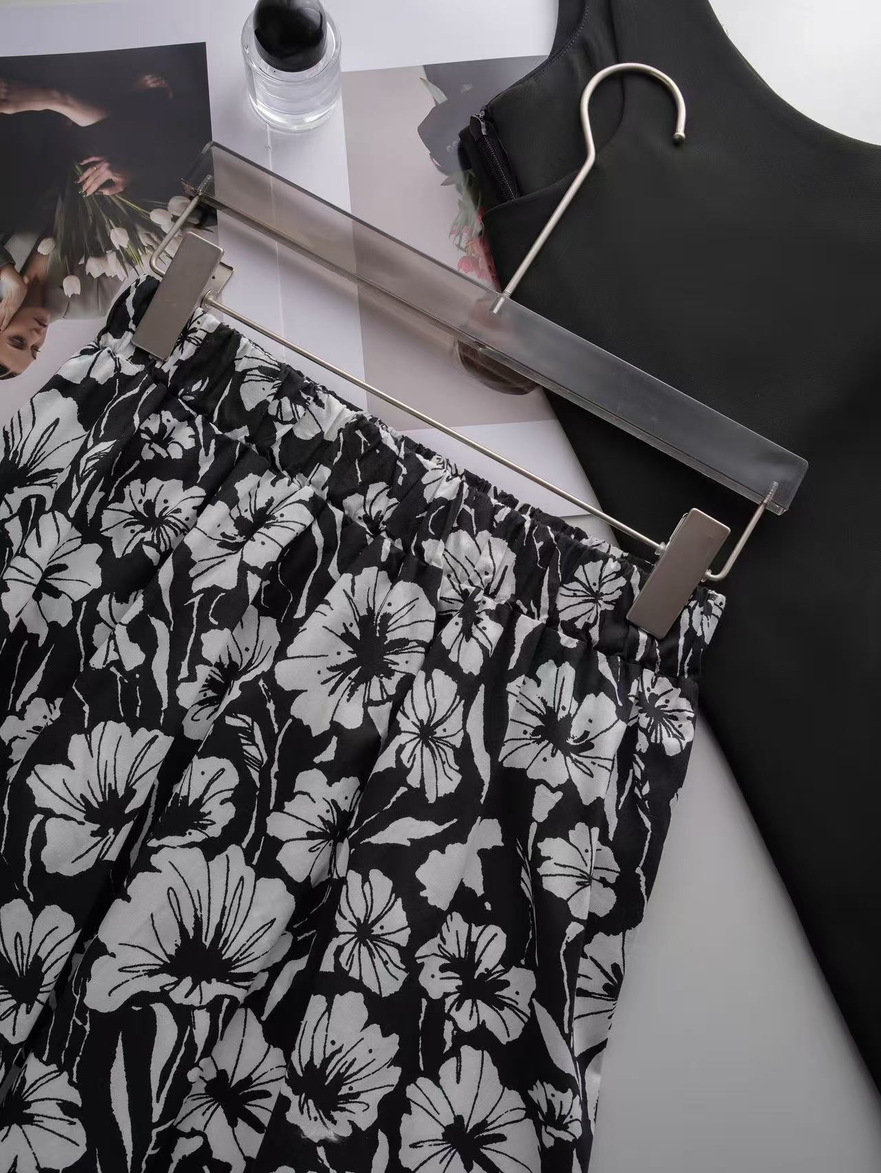 【百图lulu定制】【济州岛套装】【一套199】黑色工字领背心 数码花朵印花 弹力腰头 雪纺半裙