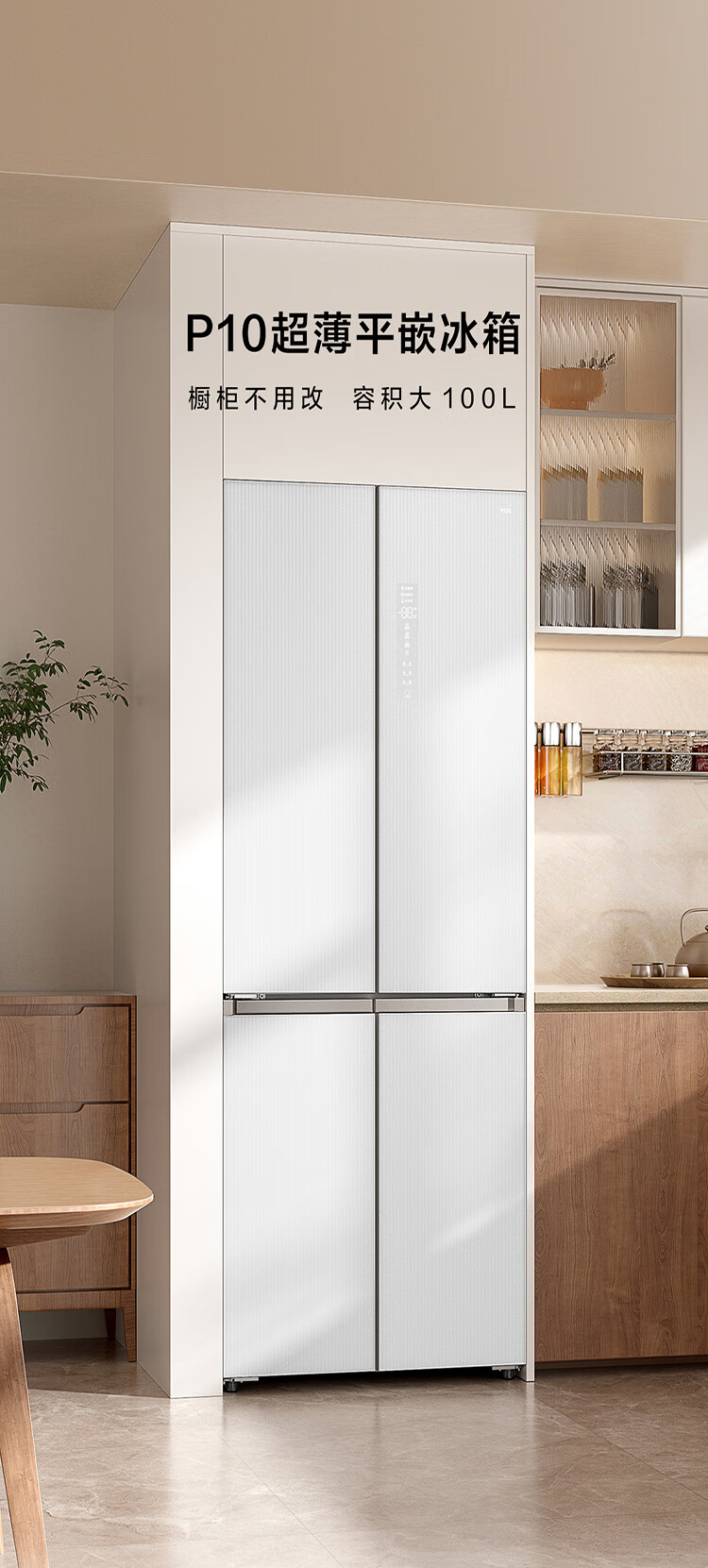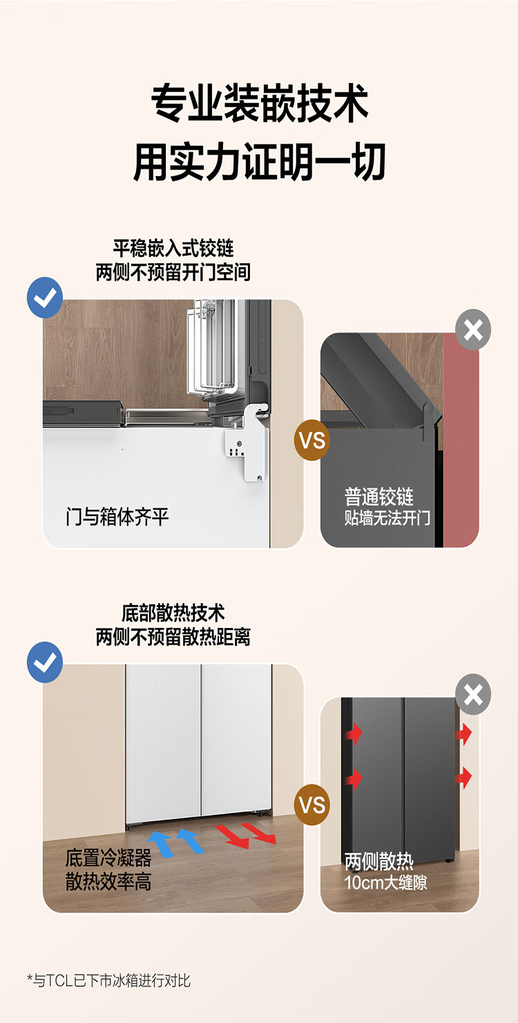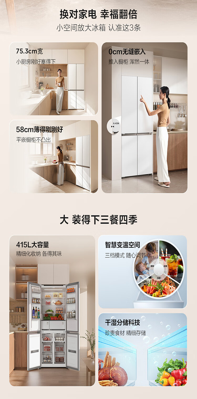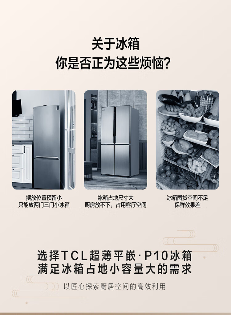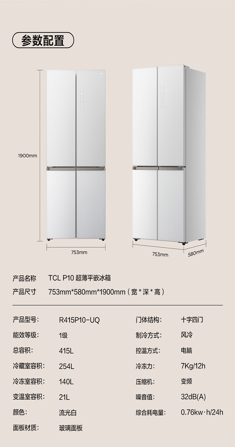 TCL415升十字门嵌入式冰箱_0cm无缝嵌入_58cm厚度_智慧变温空间_干湿分储_R415P10-UQ(线下同款T)