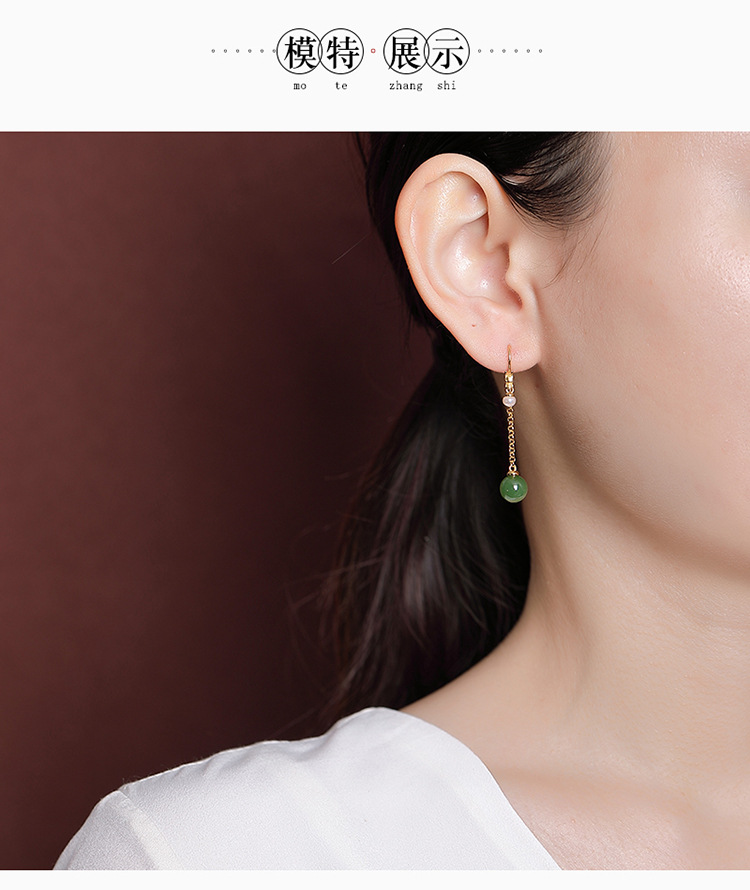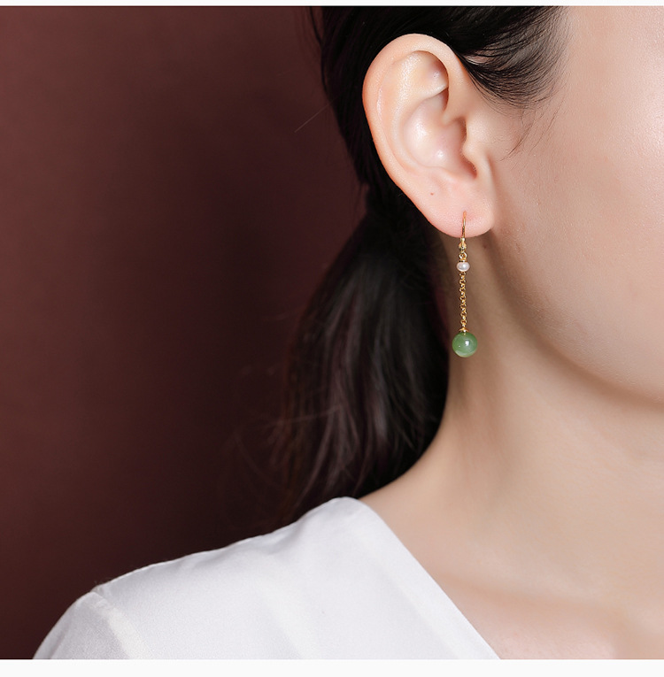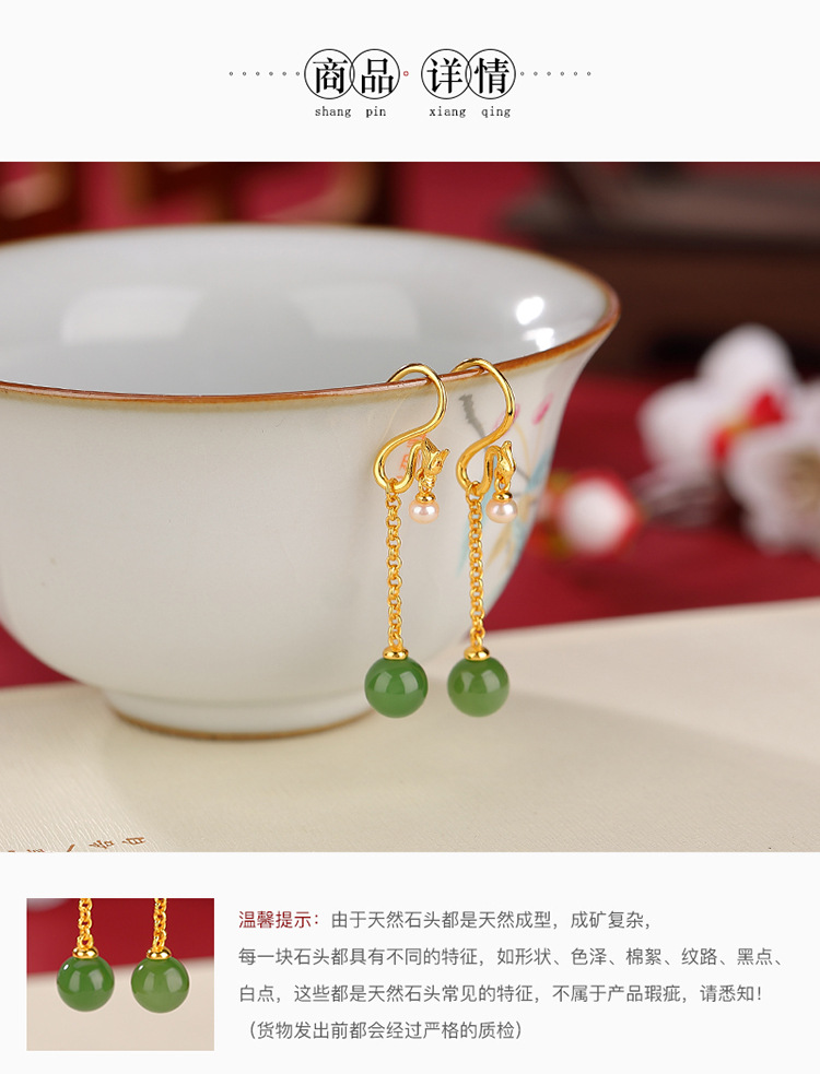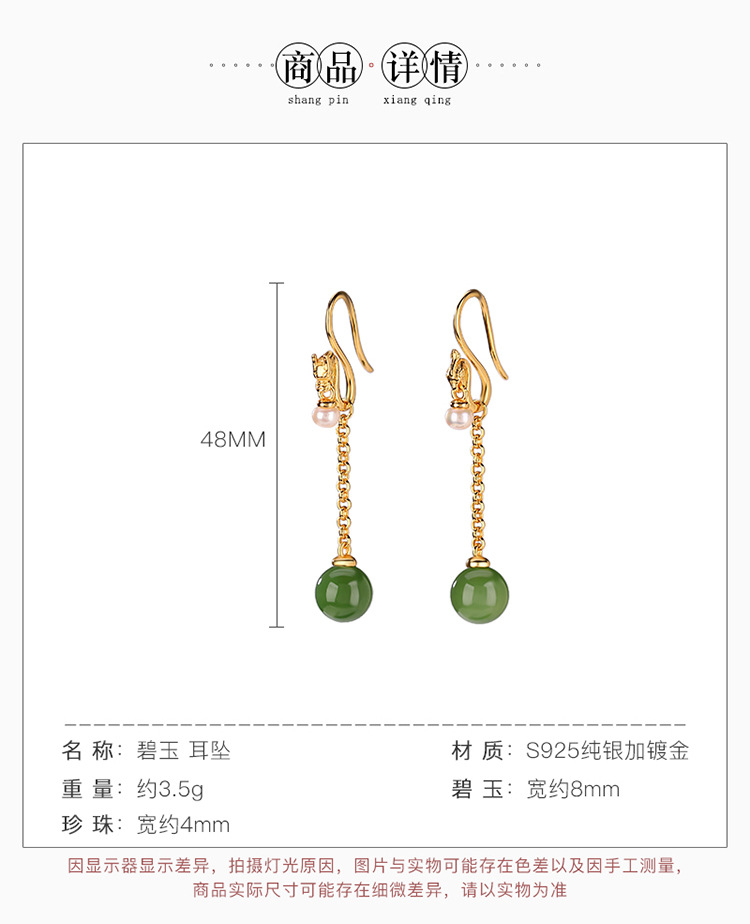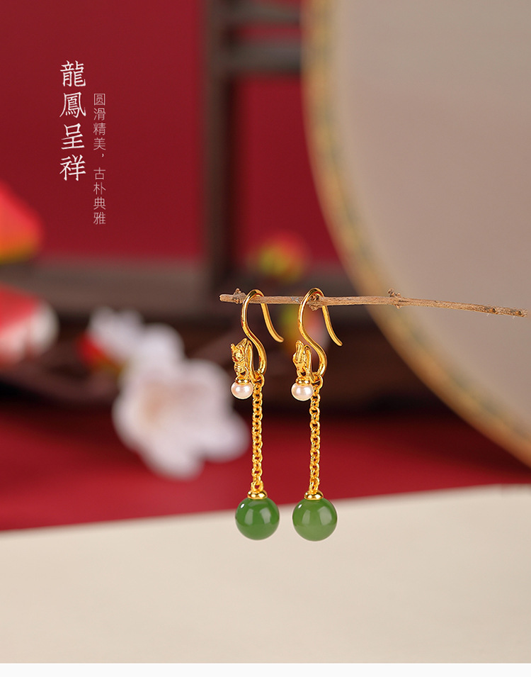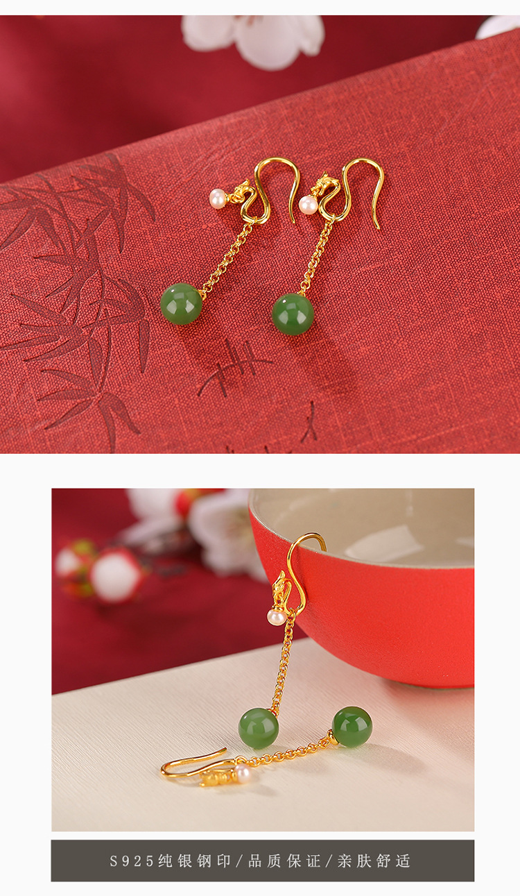 S925纯银镀金和田碧玉淡水珍珠,国潮龙凤呈祥圆珠耳坠银耳钩CW-EG01918
