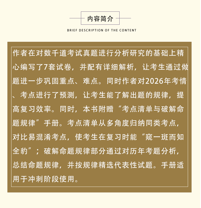 作者在对数千道考试真题进行分析研究的基础上精心编写了7套试卷,并配有详细解析,让考生通过做题进一步巩固重点、难点。同时作者对2026年考情、考点进行了预测,让考生能了解出题的规律,提高复习效率。同时,本书附赠“考点清单与破解命题规律”手册。考点清单从多角度归纳同类考点,对比易混淆考点,使考生在复习时能“窥一斑而知全豹”;破解命题规律部分通过对历年考题分析,总结命题规律,并按规律精选代表性试题。手册适用于冲刺阶段使用。