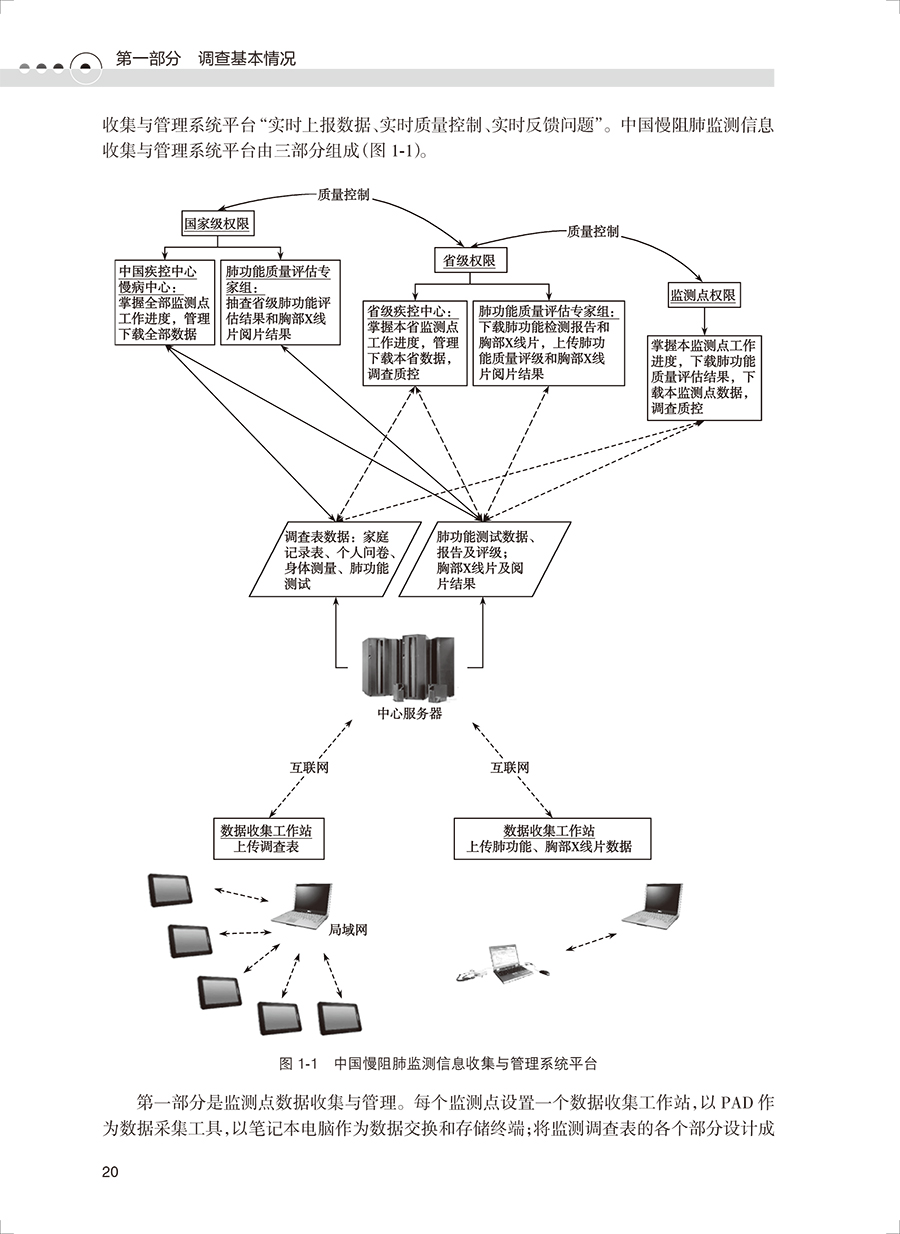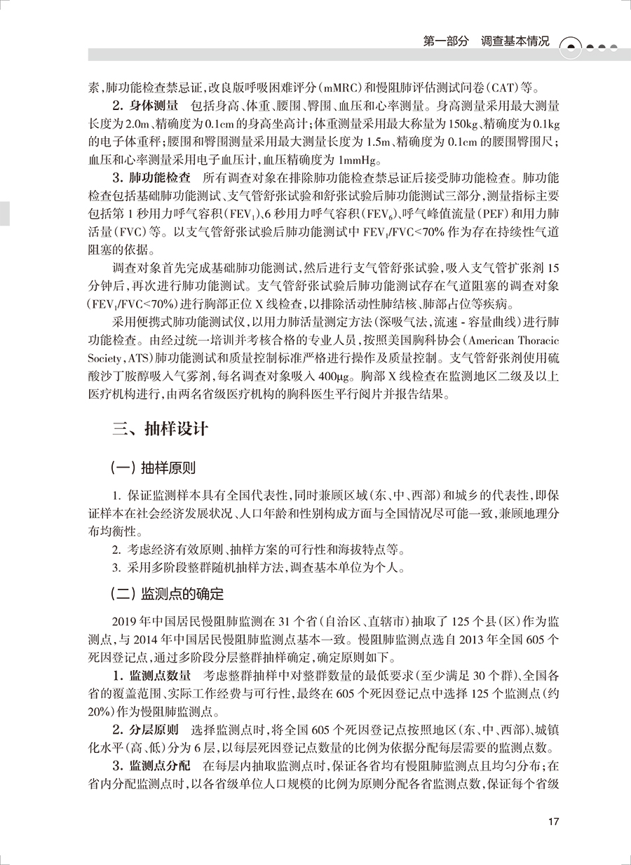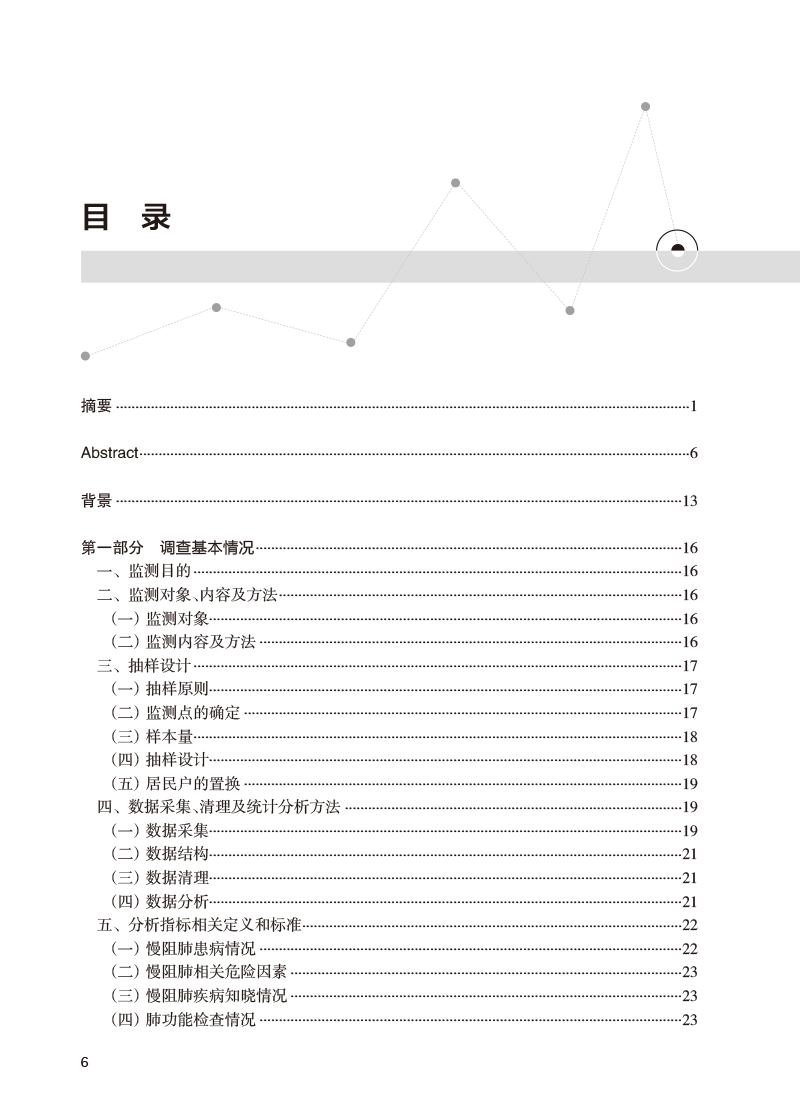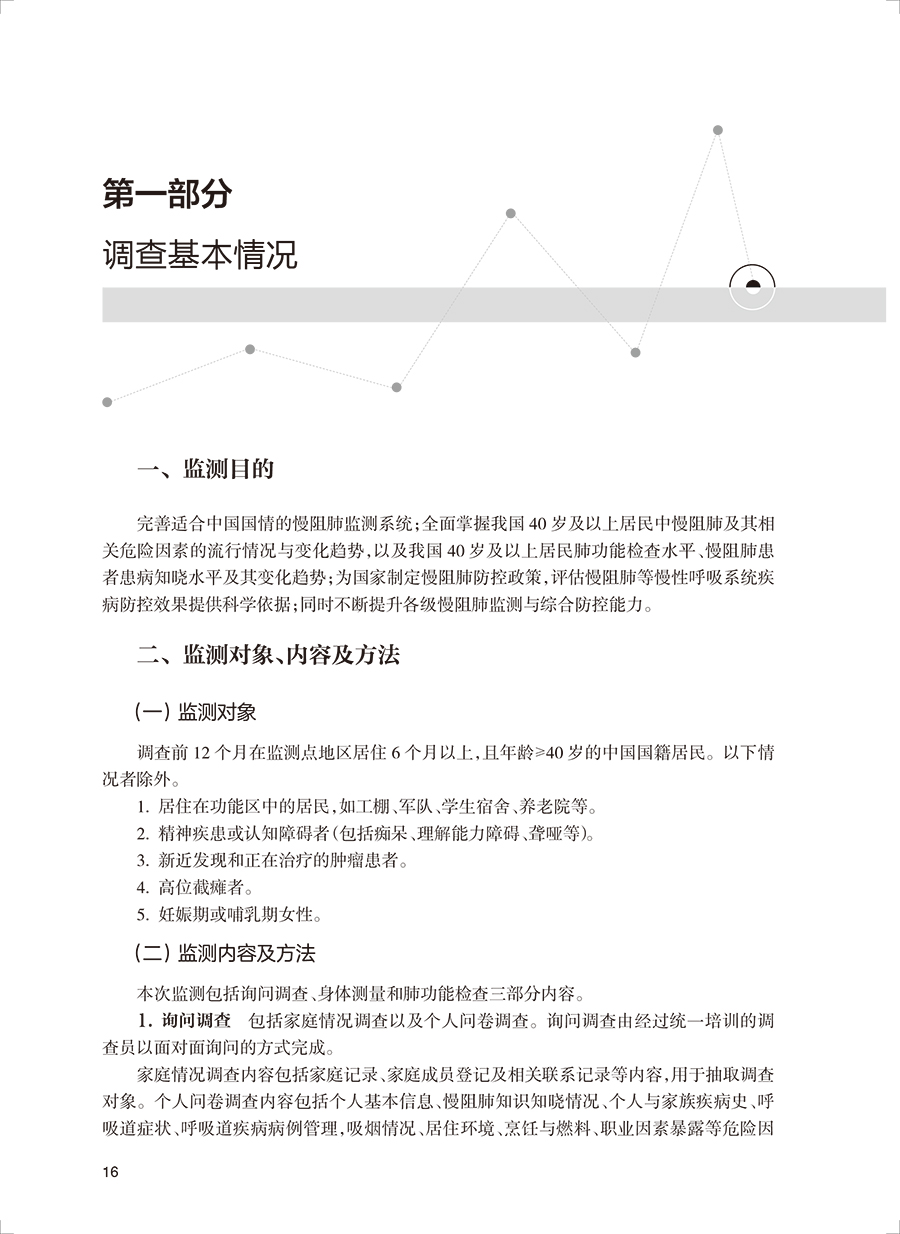1.本监测报告介绍中国慢阻肺监测的设计、抽样、调查方法和内容以及数据分析指标和方法等;重点分析我国40岁及以上不同特征人群的慢阻肺患病率、主要危险因素的暴露率、肺功能检查率、慢阻肺患者的肺通气功能障碍严重程度、诊断水平以及慢阻肺患病知晓率等重要指标,为评估国家慢性呼吸系统疾病防控状况和效果的提供重要科学依据。 2.本监测报告结合**轮数据结果(2014-2015年)进行比较,有针对性地对我国以慢阻肺为主的慢性呼吸系统疾病防控政策和措施提出建议。