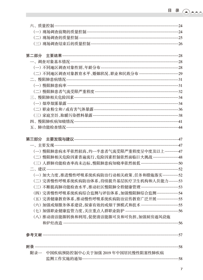 1.本监测报告介绍中国慢阻肺监测的设计、抽样、调查方法和内容以及数据分析指标和方法等;重点分析我国40岁及以上不同特征人群的慢阻肺患病率、主要危险因素的暴露率、肺功能检查率、慢阻肺患者的肺通气功能障碍严重程度、诊断水平以及慢阻肺患病知晓率等重要指标,为评估国家慢性呼吸系统疾病防控状况和效果的提供重要科学依据。