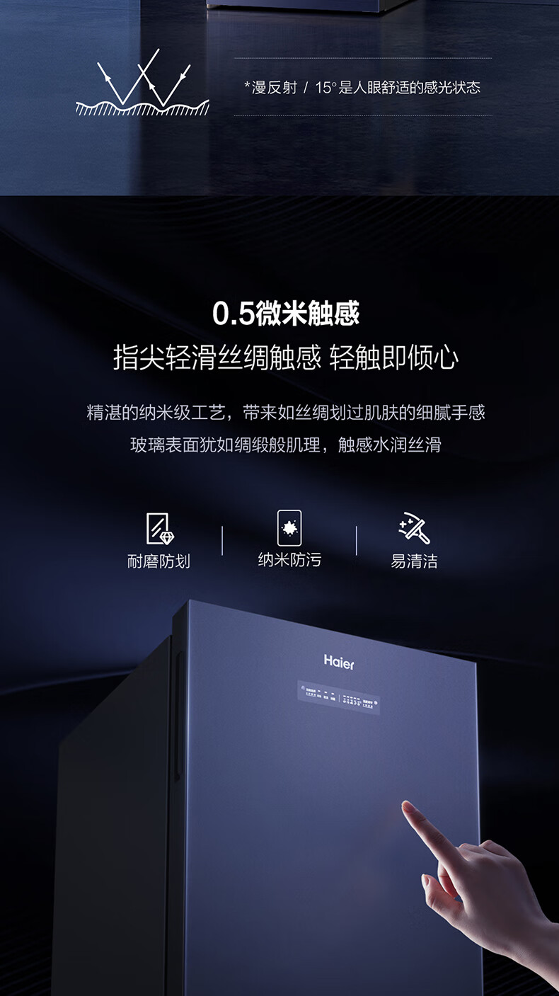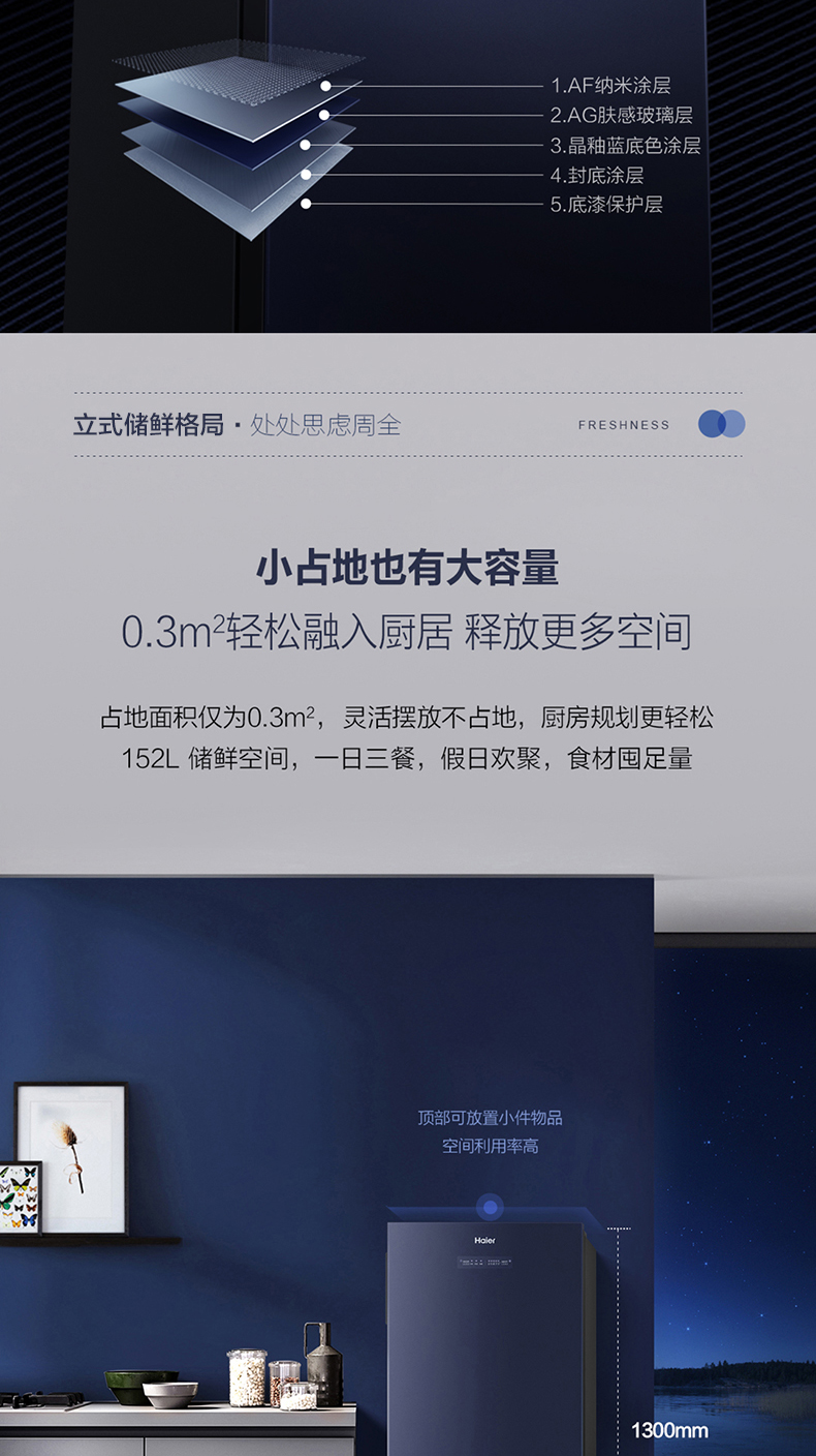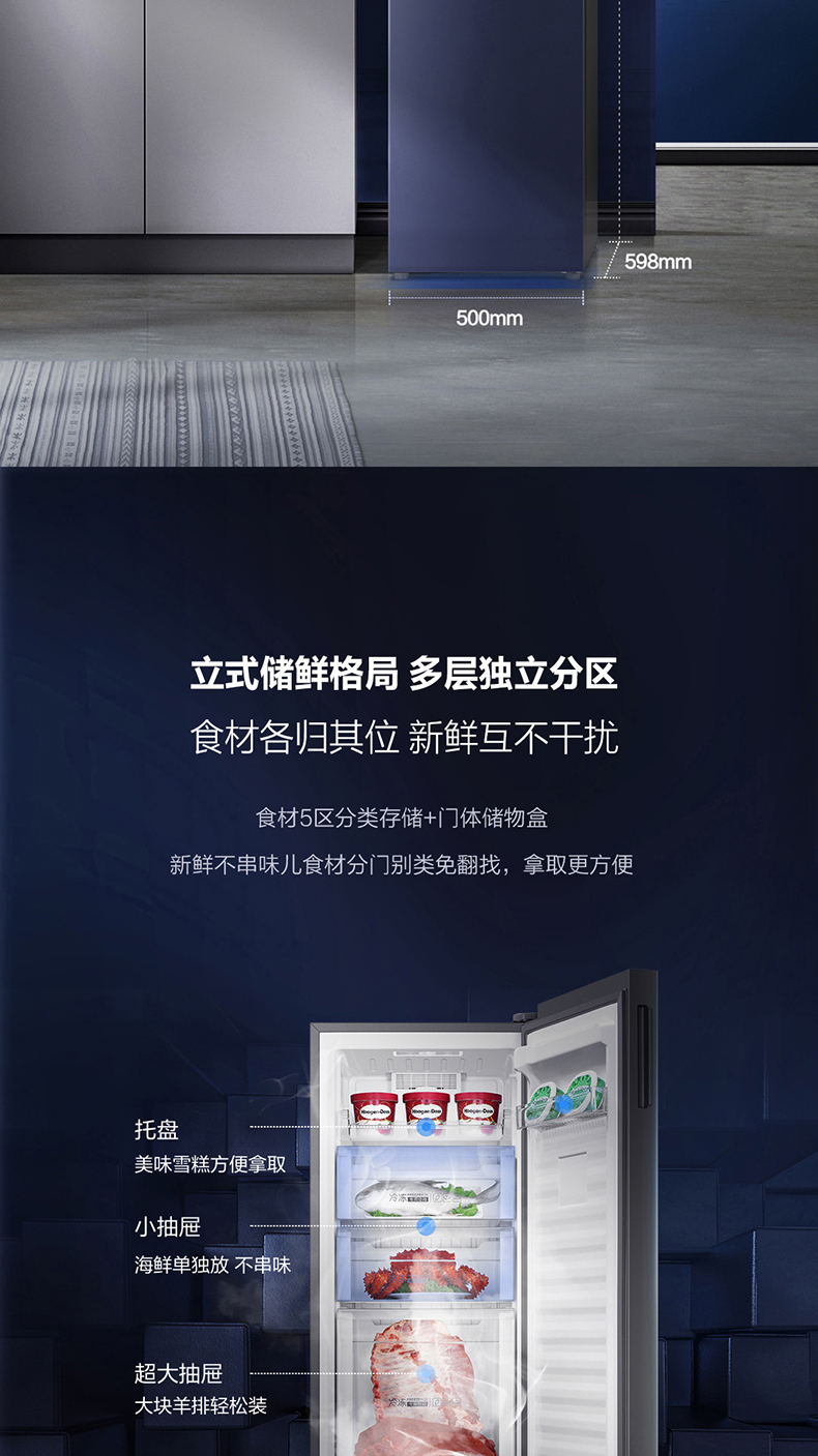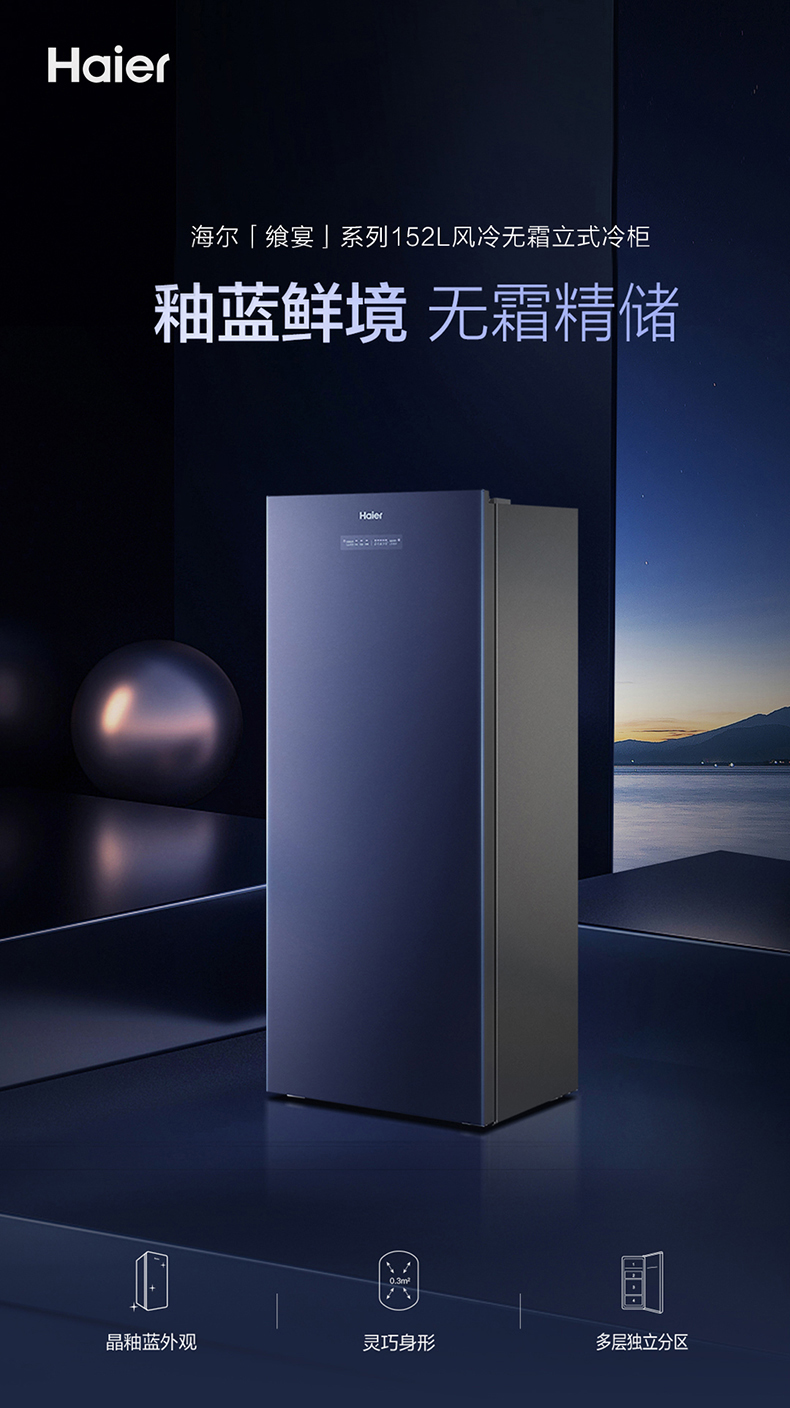 海尔立式冰柜 152升家用冷藏冷冻冷柜 风冷无霜 一级能效 飨宴系列 BD-152WEGK-肤感晶釉蓝
