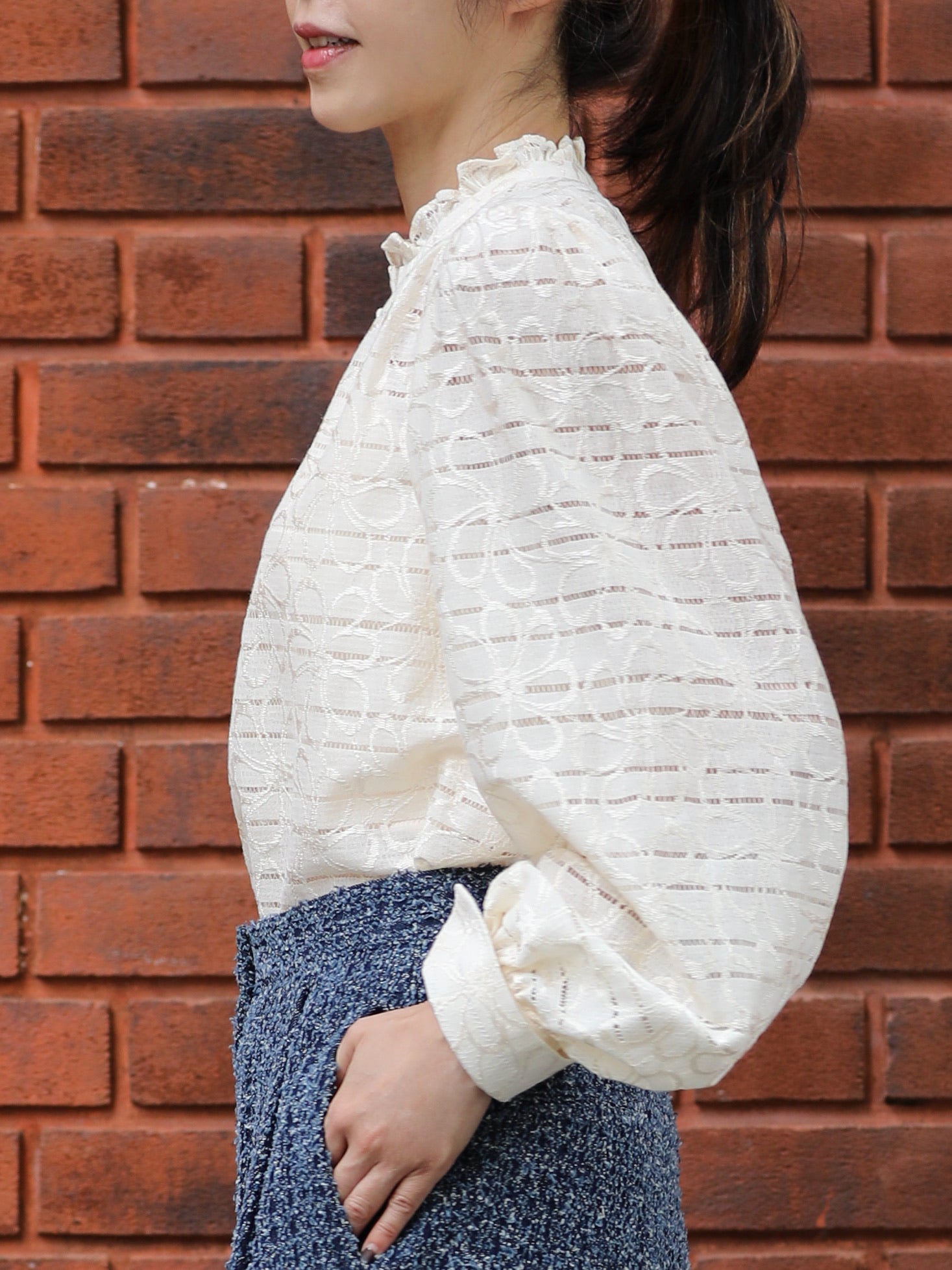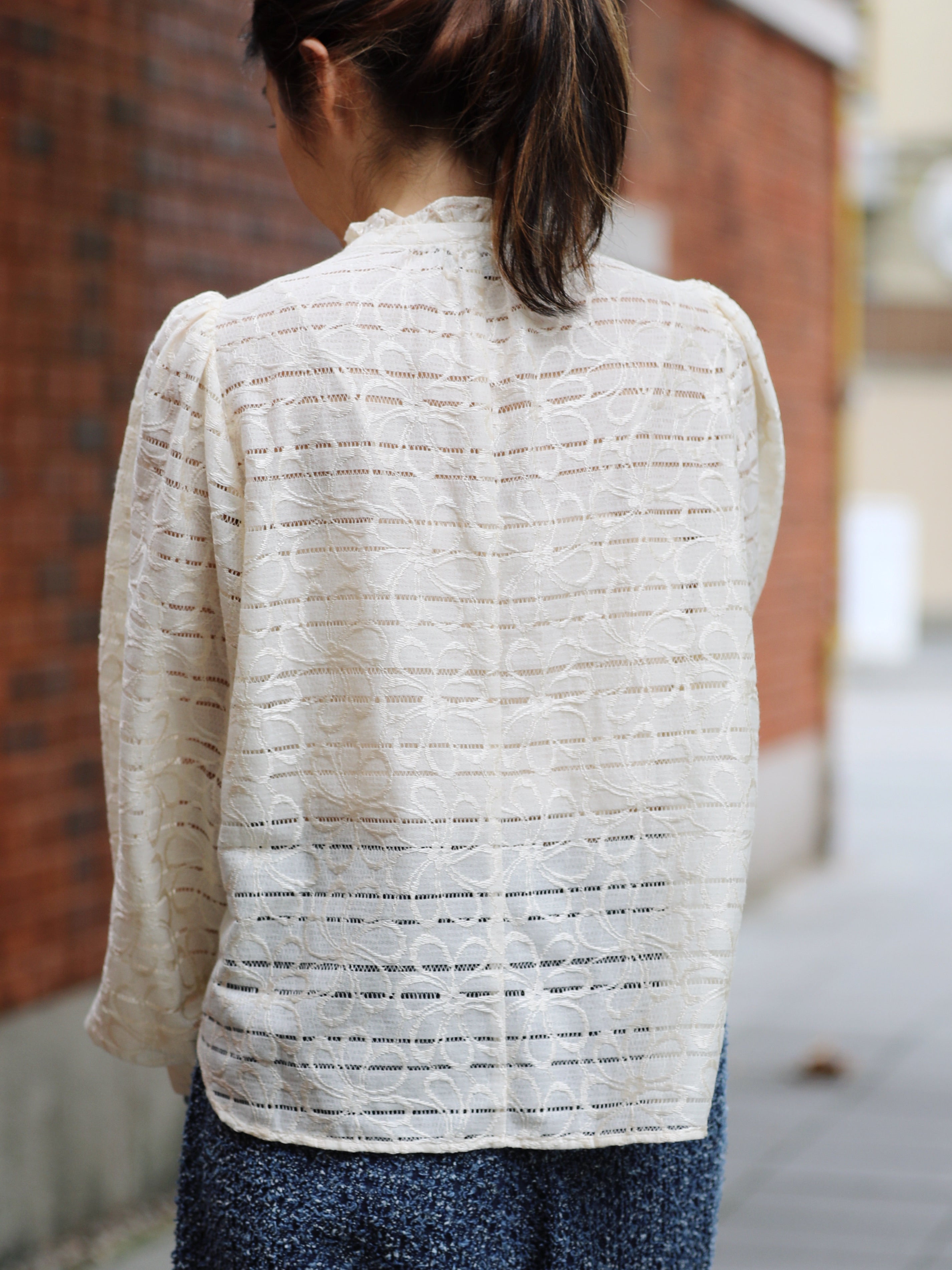 TYNVIE 白色透视条纹荷叶边领衬衫