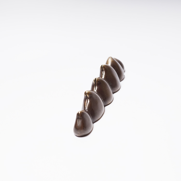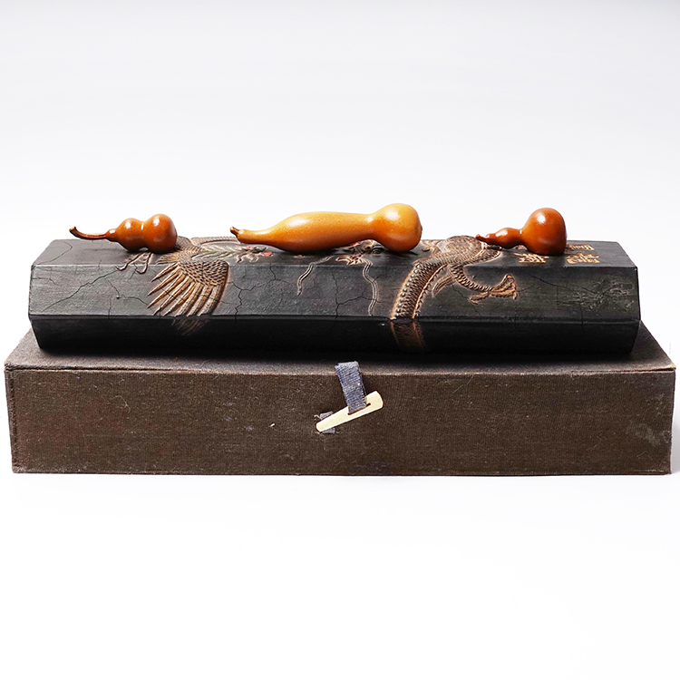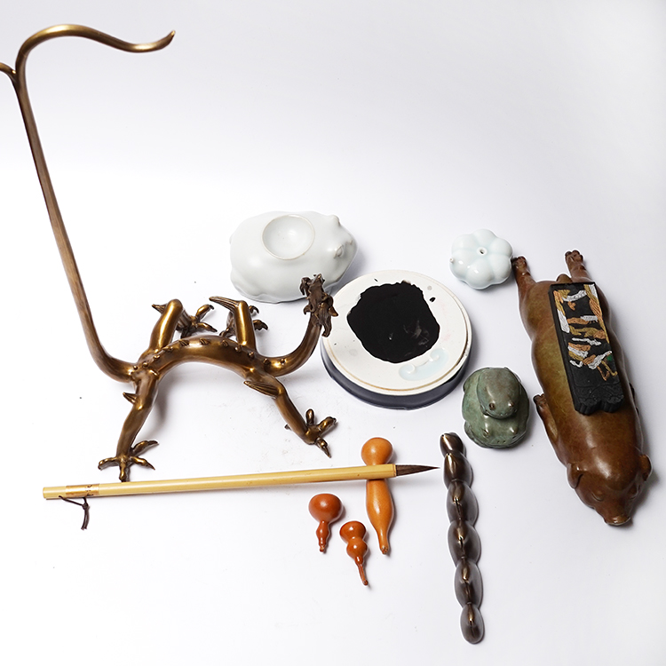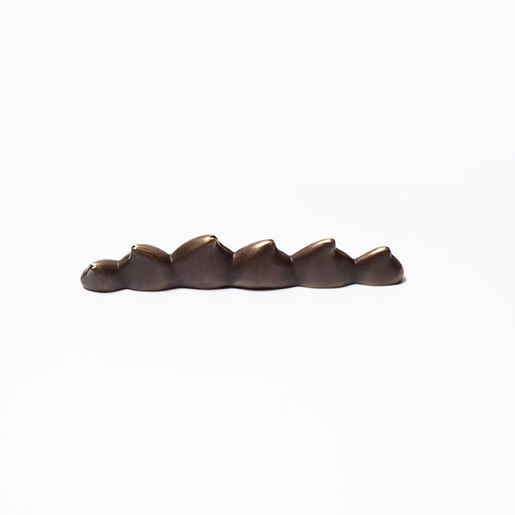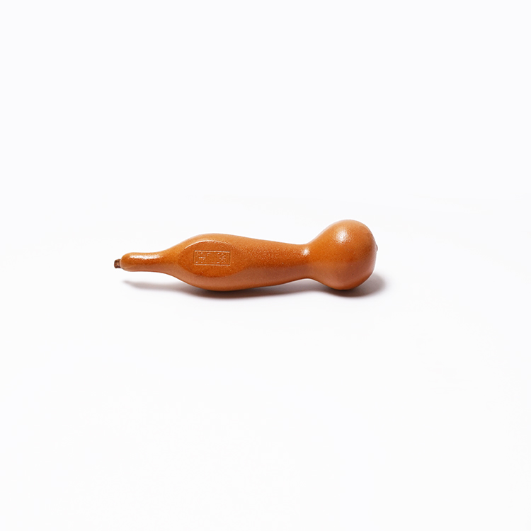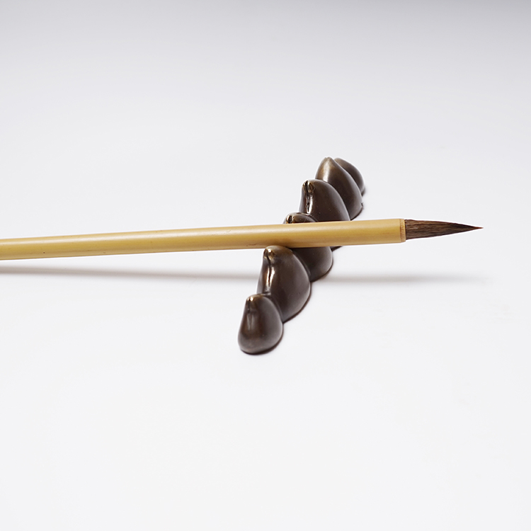 此葫芦笔架为薛继业亲自设计制作,实心铸铜稳妥踏实,架笔非常方便高温化学热着色,手捻葫芦颜色栩栩如生。手工高温化学着色,每件颜色都有差异并无标准色,以收货原件为准。款一:长8.5厘米,直径2.2厘米,底款錾子:不仁斋款二:长4厘米,直径2.4厘米,底款錾子:不仁斋款三:长4.5厘米,直径1.7厘米,底款錾子:不仁斋一件雅致文房或摆件的好处并不一定在于它给你带来了多少实用性和方便,而在于它跟你每日你的交流,一张好的画或一件雅致的东西会潜移默化的每日熏染你,心情的起伏可以通过身边的雅物来平衡,抑郁之心可由案上的一件趣物来平复,端庄的的器皿提醒你要有一颗高昂的心,贵气有时是身边的贵物熏陶而来。一件好东西要大方端正,灵隐于方直而不寡,巧藏于素朴而不媚,器物之品格与人一样,若精气神在,小器物亦可大磅礴。所谓风水即是身边之物于你的关系,用什么摆什么都是风水。六桃实心铸铜笔山长:15.5cm 高:2.5cm 底款錾子:不仁斋