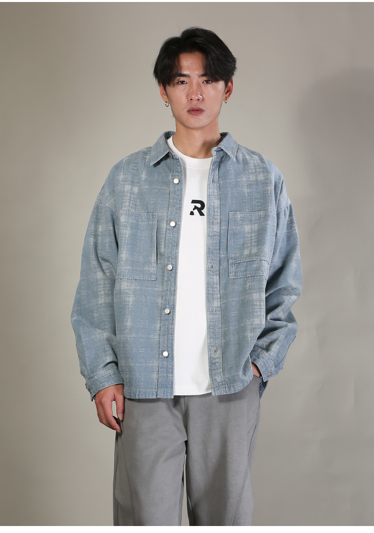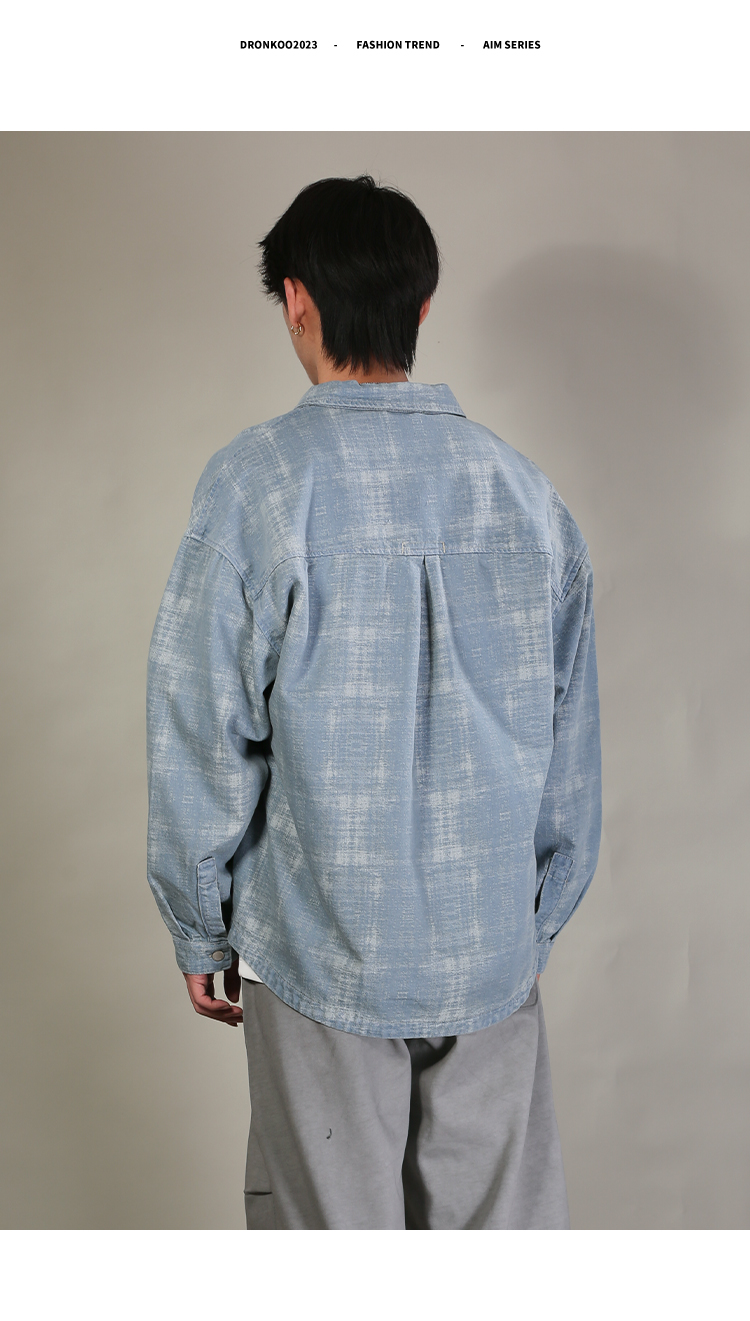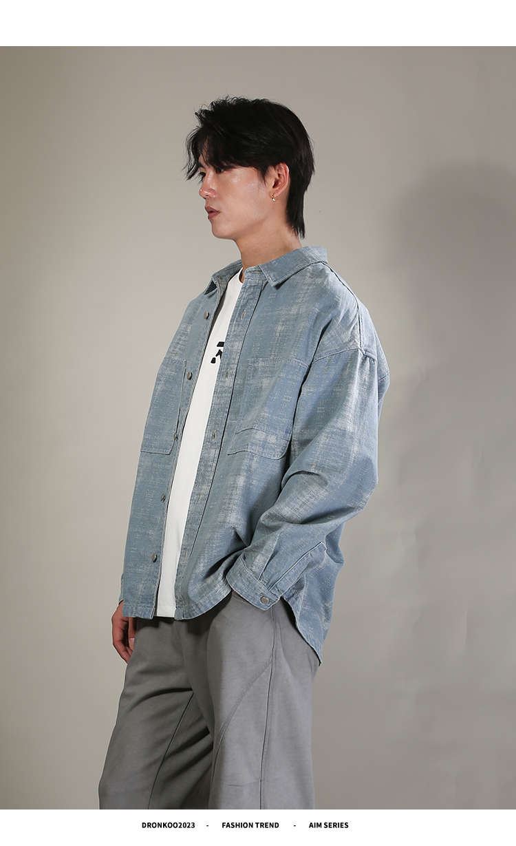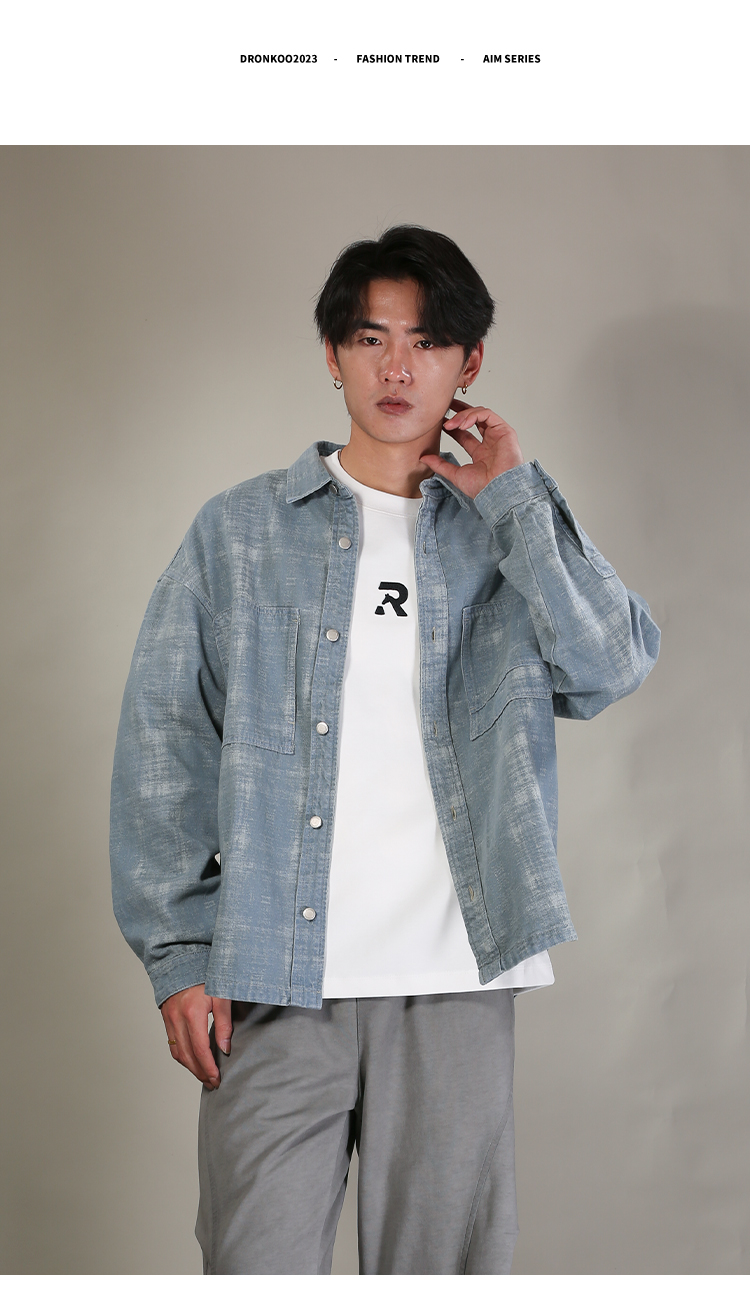 DRONKOO 2026 翻领前双侧开口贴袋牛仔提花微阔长袖中厚衬衣