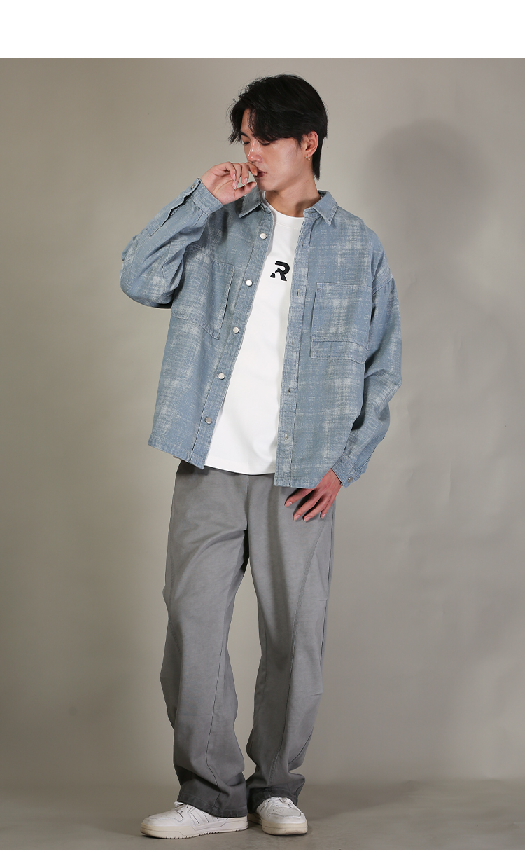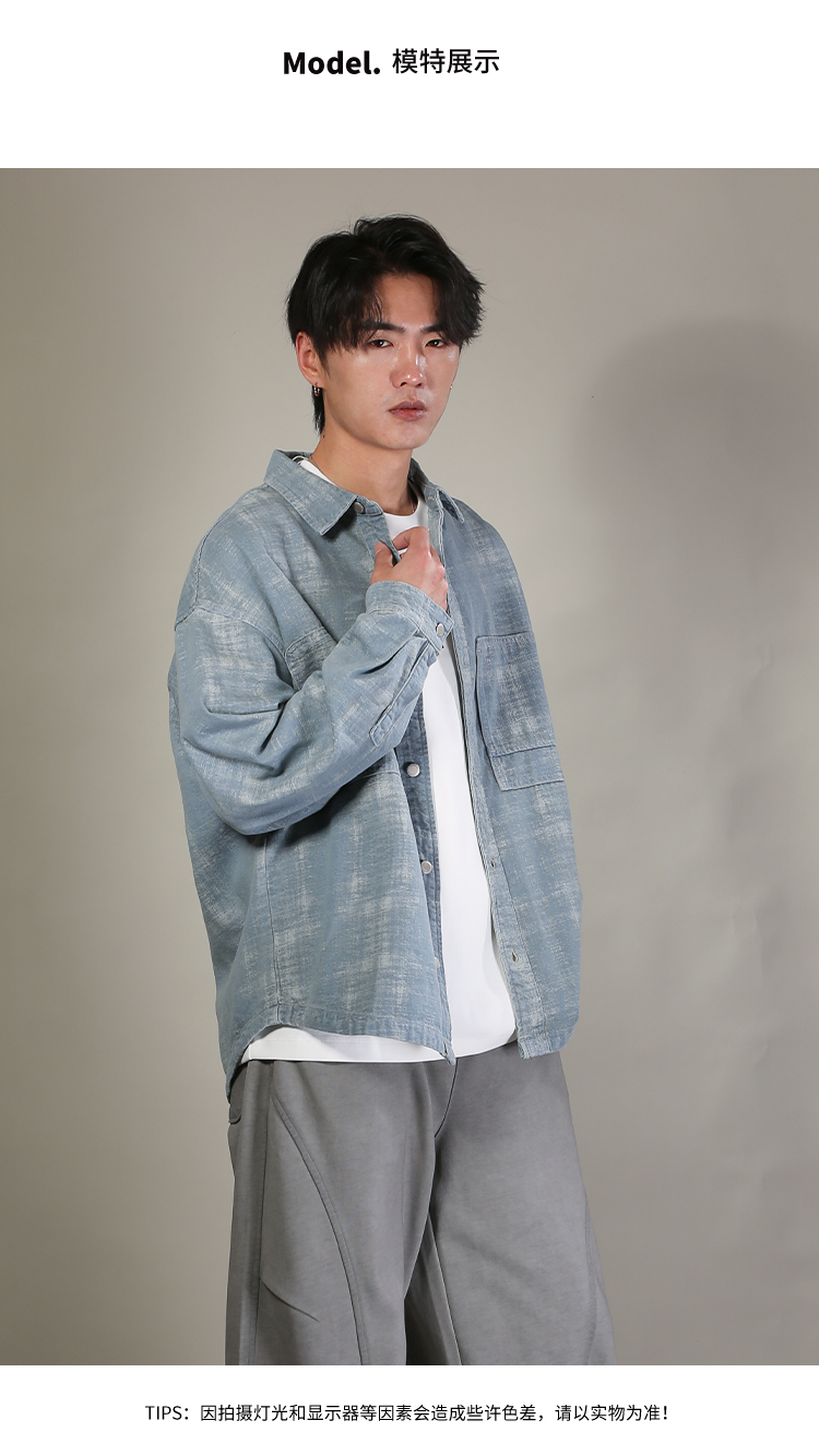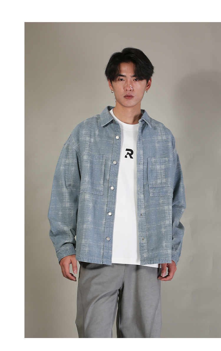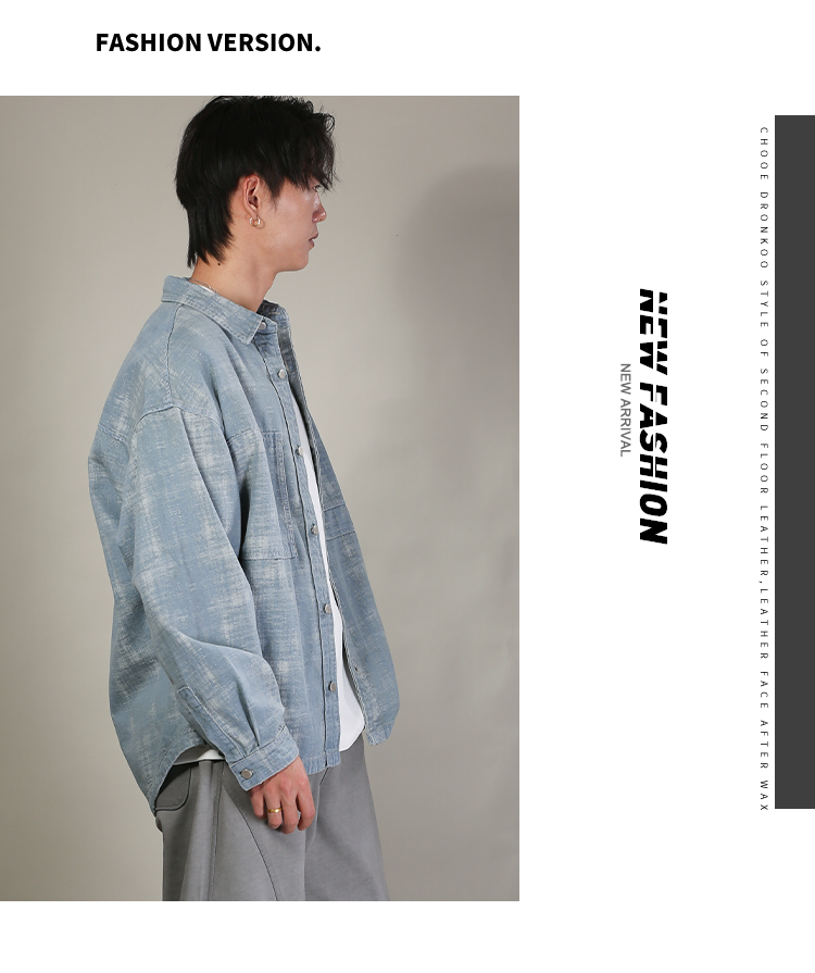 DRONKOO 2026 翻领前双侧开口贴袋牛仔提花微阔长袖中厚衬衣