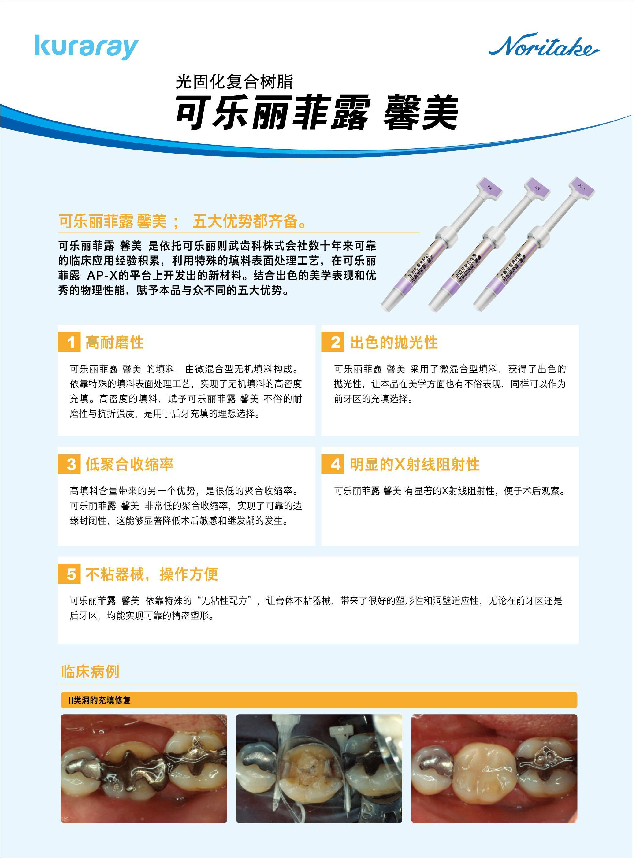 高磨耐性、出色的抛光性、低聚合收缩率、明显的X射线阻射性、不粘器械,操作方便。