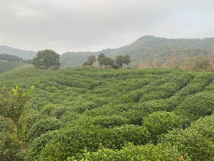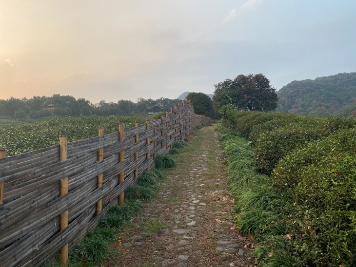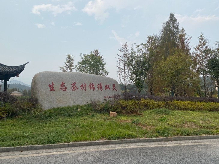 我们从杭州市区驱车1小时,一路往西南方向,到达西湖区双浦镇灵山村。村口设立了一块很大的门牌,上面写着“江南生态茶村”六个大字。