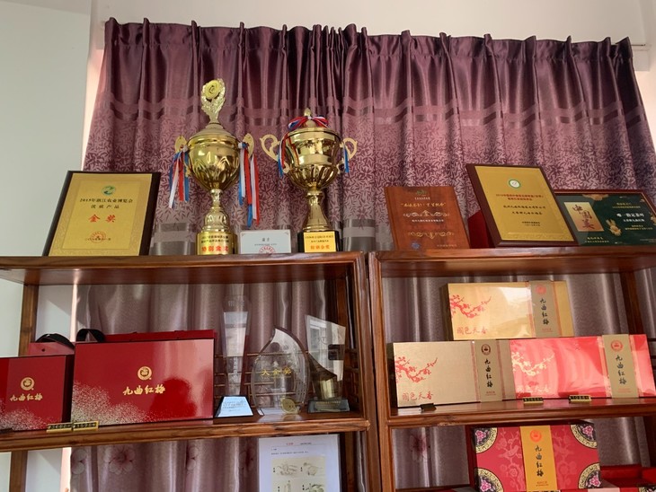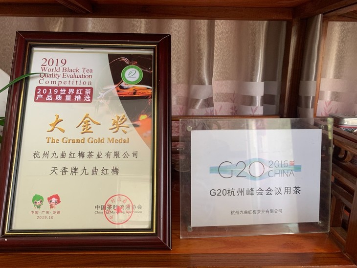 杭州九曲红梅茶业有限公司就在核心产区,走进包兴伟的办公室,第一眼注意到的是挂在墙上各式各样的金色奖牌,记者数了数,有二十多块,有“浙茶杯”金奖、杭州优质红茶金奖、中国茶叶博览会极具发展潜力品牌、G20峰会的会议用茶等,这还只是冰山一角,架子上还有数不清大大小小的奖杯。