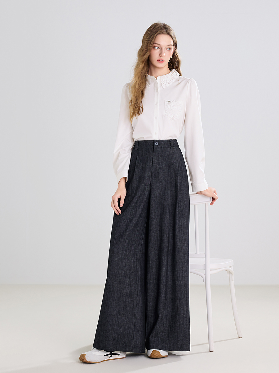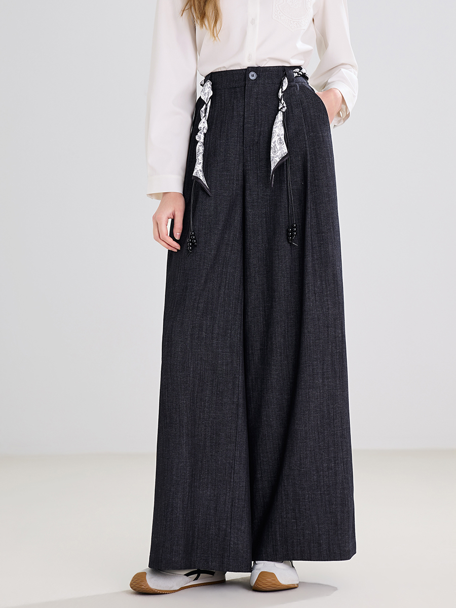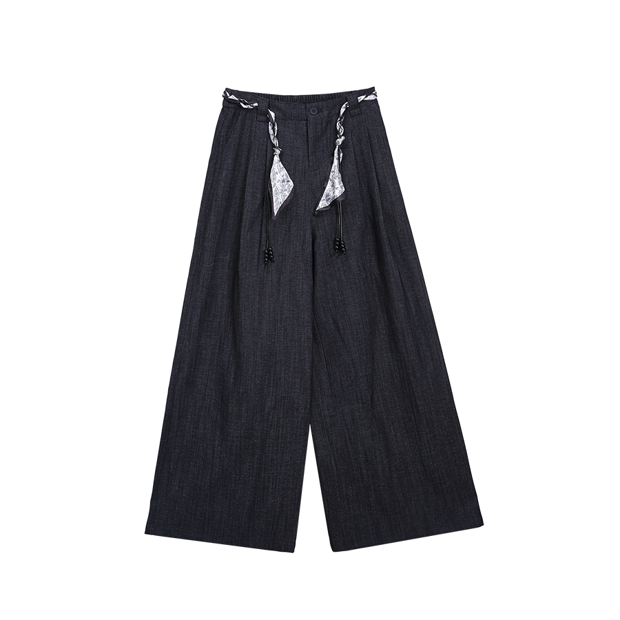 【百图lulu定制】【法式阔腿裤】【送编织腰带】 深宝蓝 宽松高腰 后腰弹力收褶 阔腿裤 休闲裤