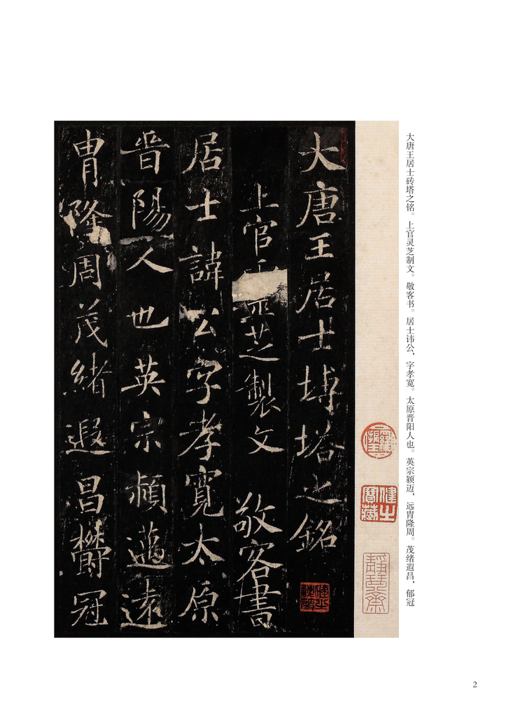 唐王居士砖塔铭,显庆三年(六五八)刊,十七行,行十七字,上官灵芝撰文,敬客书。明代末年出土于陕西终南山梗梓中,即已裂为三。书者,不显于名,依启功先生之说,为右威卫仓曹参军敬客师。其书瘦劲秀逸,有登善意。传世三石全文本多种,后又有各种损泐变化。今影印者,全文本为罗振玉旧藏,今藏辽宁省博物馆。碎后拓本影印者两册,其一为彭恭甫藏旧拓百衲本,首有木刻吴湖帆题签,内有王云、吴湖帆、王同愈等人题字;集塔铭三种,尤以第一种郃阳车聘臤拓本为重;尾有冯超然、陈承修、蒋祖诒跋语。其二为心香阁藏本。上五种拓本,可略窥塔铭损泐变化。