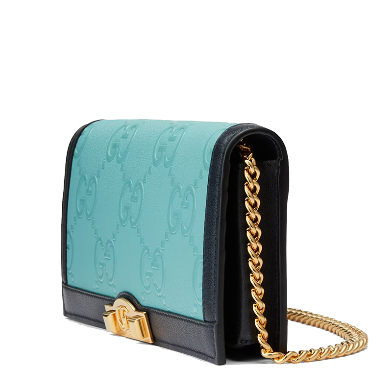 【包税】GUCCI/古驰 2021秋冬新款 女士浅蓝色双G压纹皮革深蓝色滚边金属饰钉细节链式单肩斜挎手拿钱包676155UF4AX4967