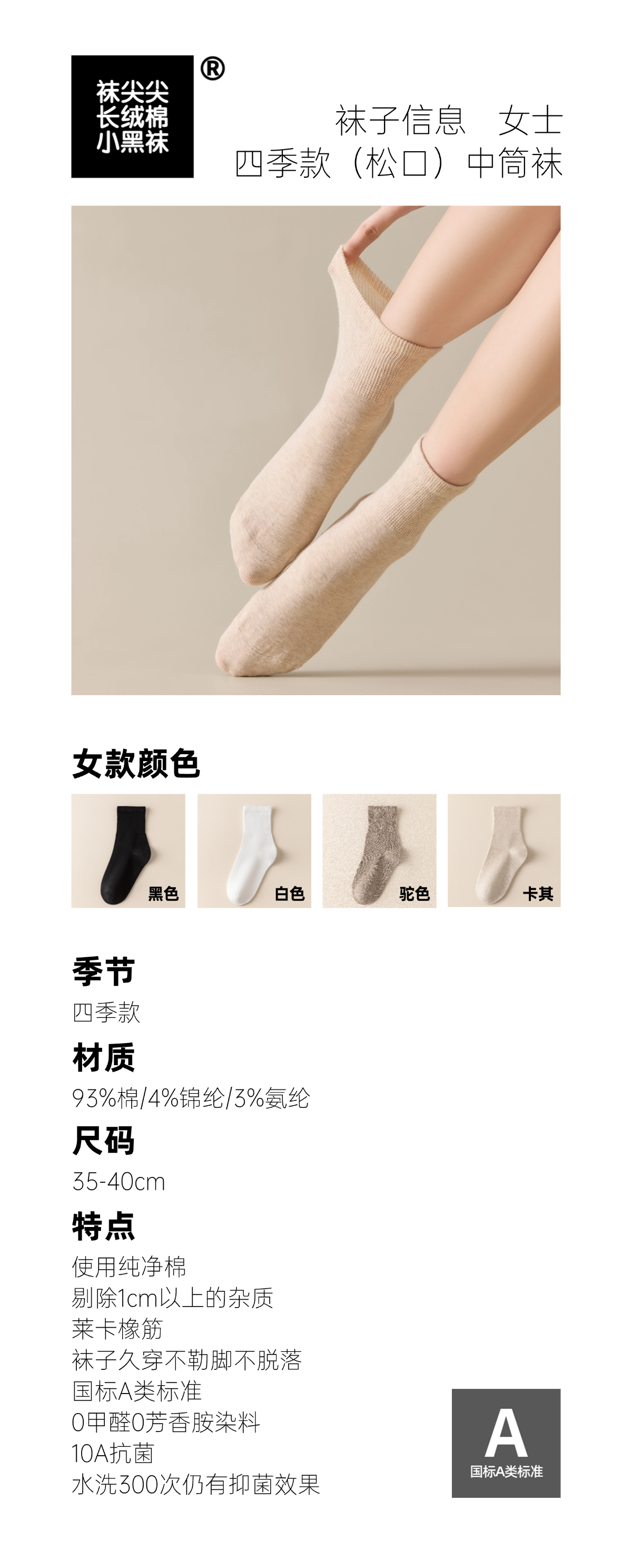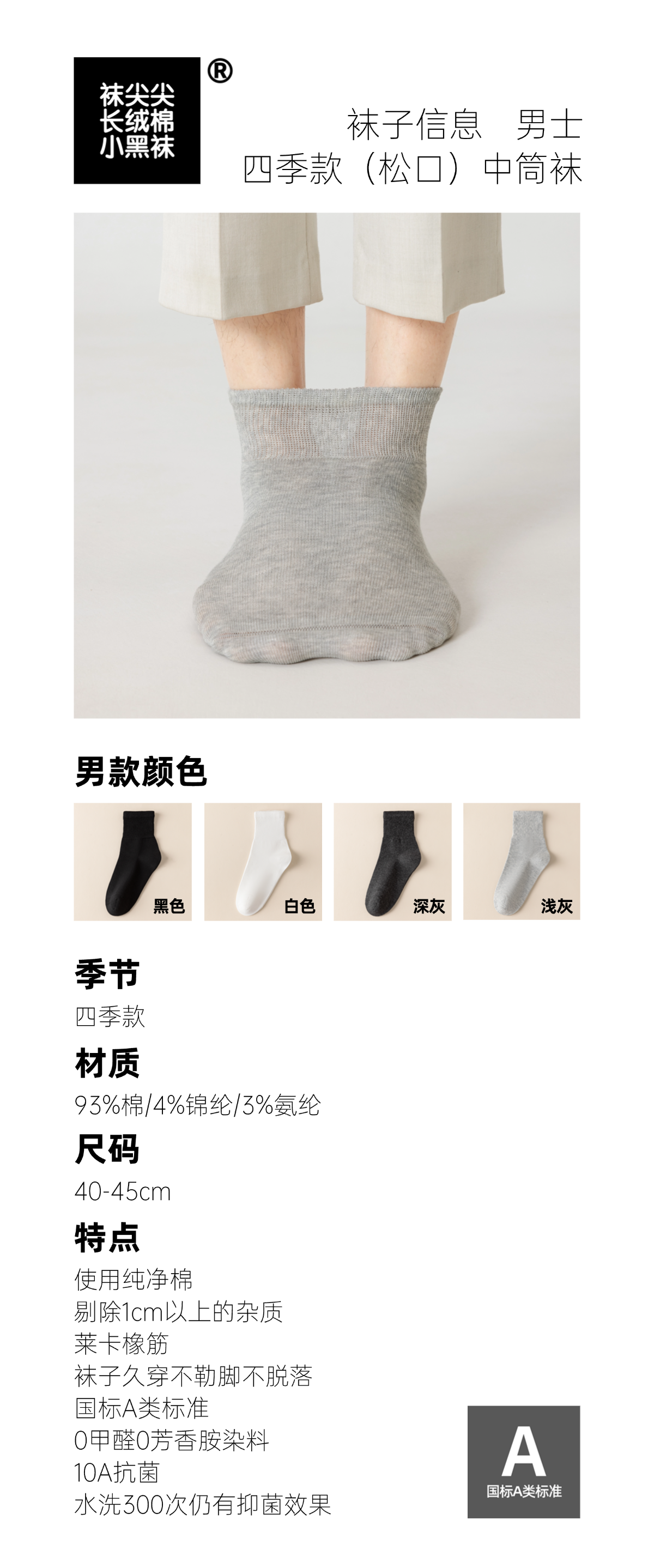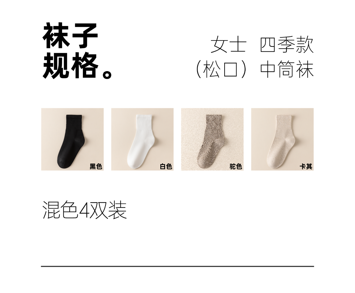 【任选2件立减20元】【4双装】袜尖尖 四季男女款松口袜 采用精梳长绒棉,穿着清爽舒适;莱卡氨纶弹性纤维,高弹橡筋,不勒脚不脱落;A类标准10A抗jun