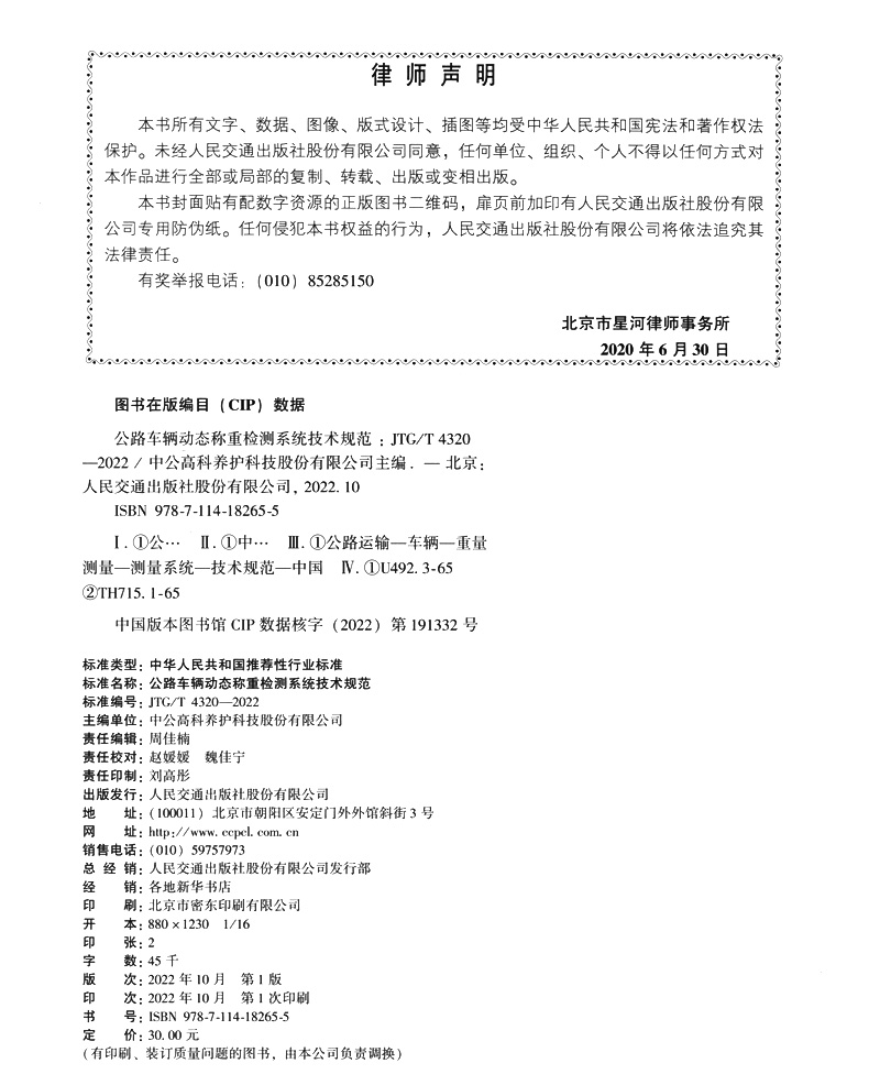书名:公路车辆动态称重检测系统技术规范(JTG/T 4320—2022)