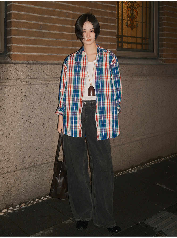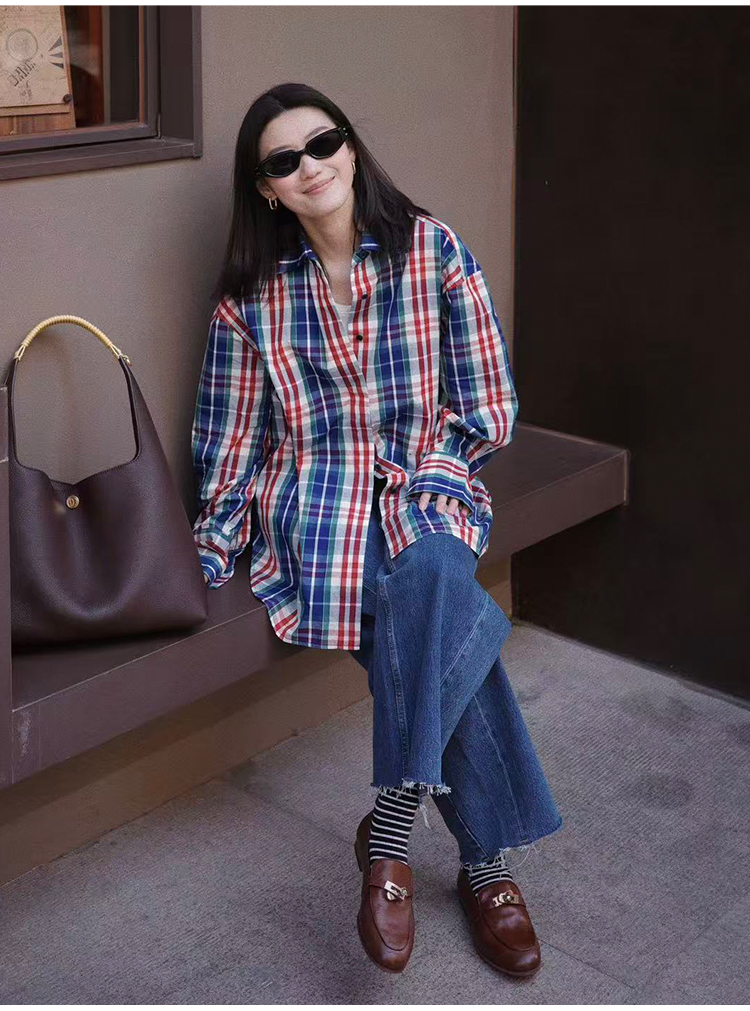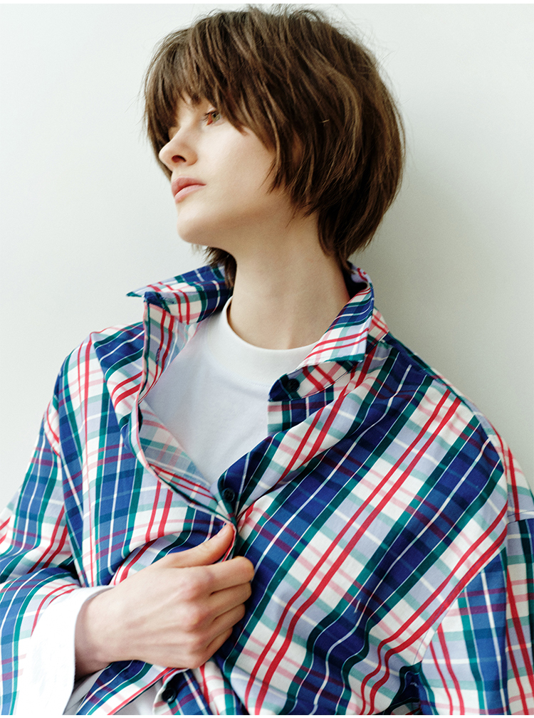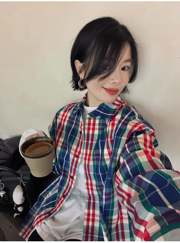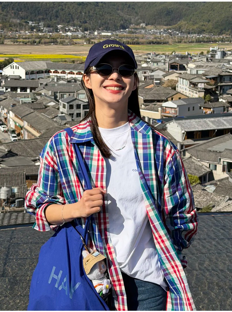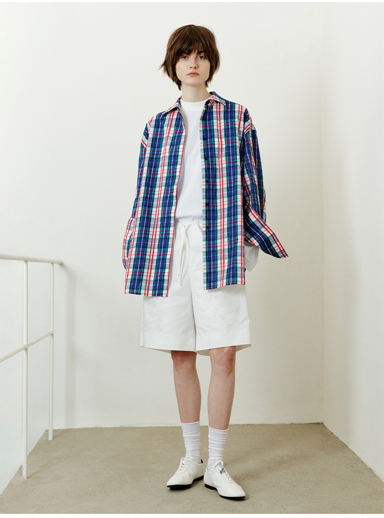 hidemi副线小h 小男孩色织格纹有机棉休闲宽松长袖衬衫外套长裤包方巾四件套