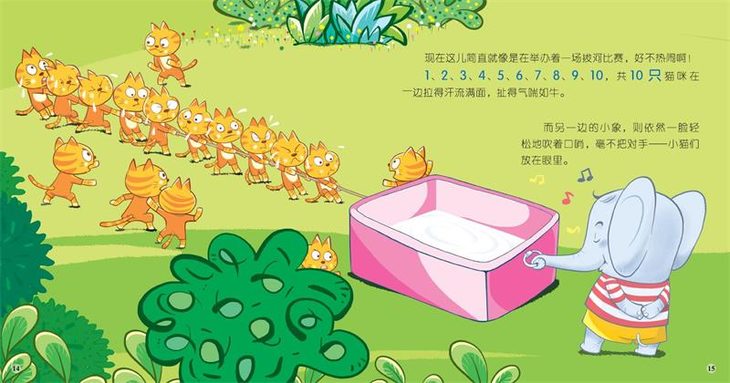《拔河大战•数字和数量》:小象家与小猫家中间有个大大的水缸,两家为了争水缸要进行拔河比赛,小象只有一个人,而小猫家有好多好多小伙伴,20只小猫终于能跟小象打成平手,借由这个故事教孩子如何数数。